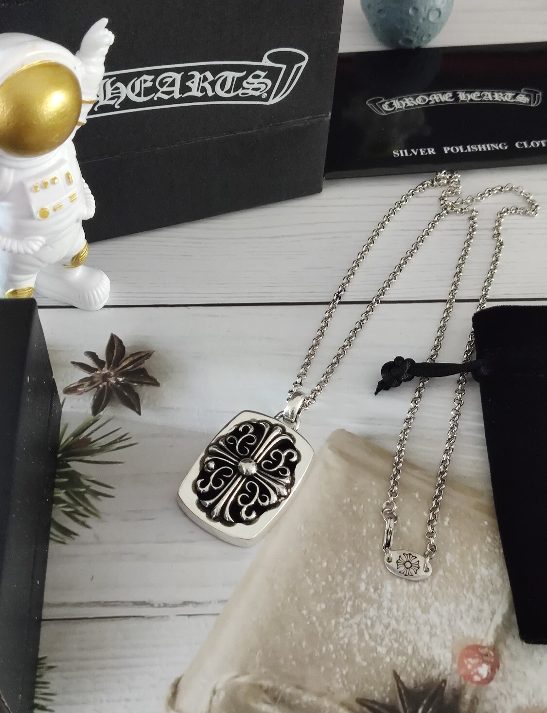 To maintain the luster and beauty of your Chrome Hearts Silver Dog Tag Necklace, regular cleaning is essential. Use a soft, lint-free cloth to gently wipe the necklace after each wear. This helps to remove any dirt, oil, or fingerprints that may accumulate on the surface. For more thorough cleaning, you can use a silver polishing cloth or a mild silver cleaning solution. Be sure to follow the instructions on the cleaning product carefully to avoid damaging the silver. Avoid exposing the necklace to harsh chemicals, such as chlorine or bleach, as these can cause discoloration or corrosion. By following these simple cleaning and maintenance tips, you can keep your necklace looking its best for years to come.