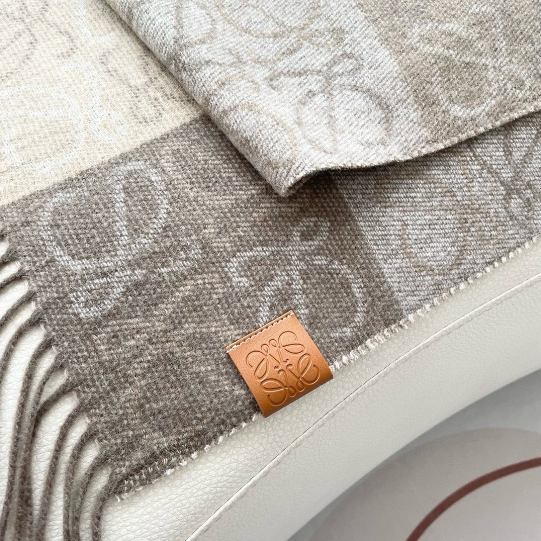neutral Loewe Anagram Wool Scarf - Wrap yourself in luxury with the Loewe Anagram Wool Scarf, featuring a sophisticated neutral palette. This exquisite scarf showcases the iconic Loewe anagram design, meticulously woven into the finest wool for unparalleled warmth and style. The subtle blend of beige, cream, and gray tones makes it a versatile accessory, perfect for complementing any outfit. The Loewe Anagram Wool Scarf is not merely an accessory; it's a statement of refined taste and discerning style. Crafted from the softest wool, this scarf offers both comfort and elegance, making it an essential addition to any wardrobe.