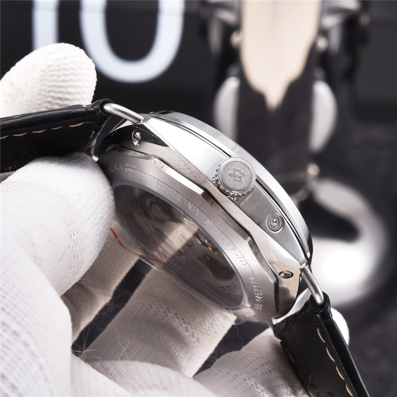 Strap: The watch is typically paired with a black leather strap, which complements the black dial and enhances the overall aesthetic. The strap is designed for comfort and durability, ensuring a secure fit on the wrist. The buckle is often made of stainless steel to match the case.