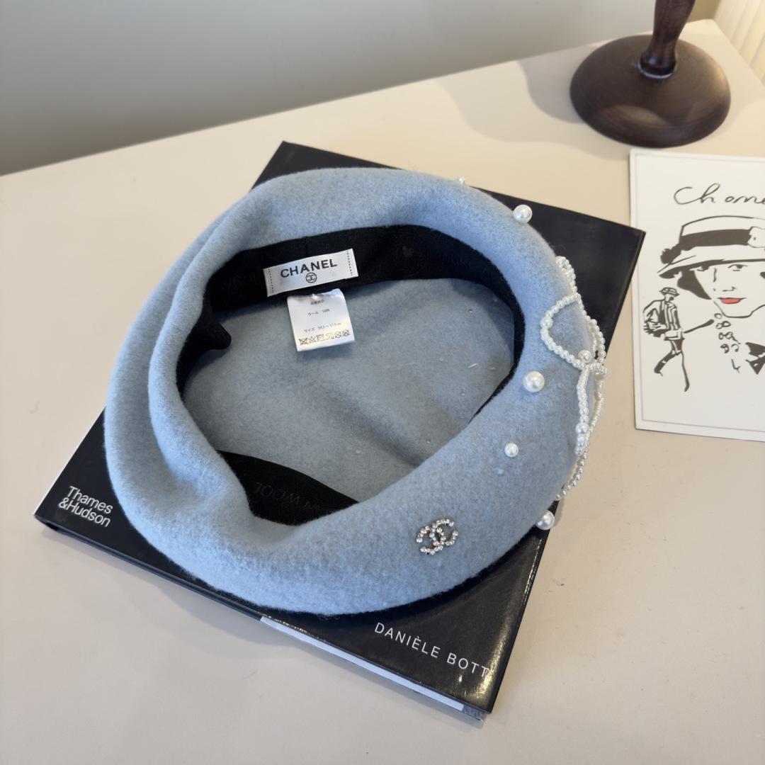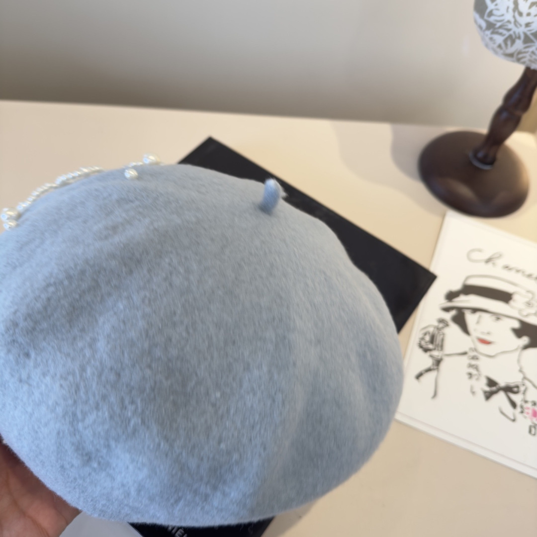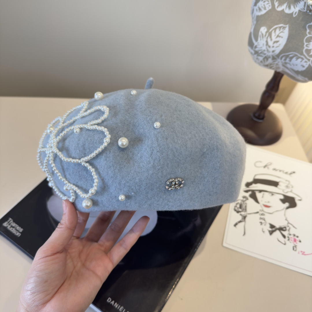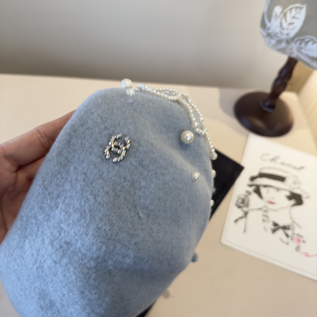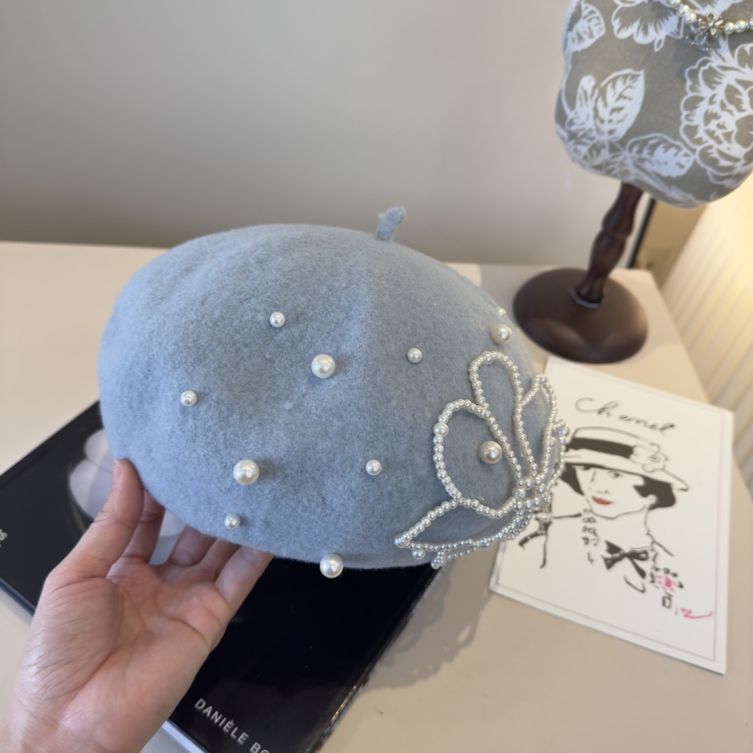 Timeless Elegance: The Light Blue Wool Beret with Pearl Flower Design embodies classic French style and adds a touch of sophistication to any outfit.