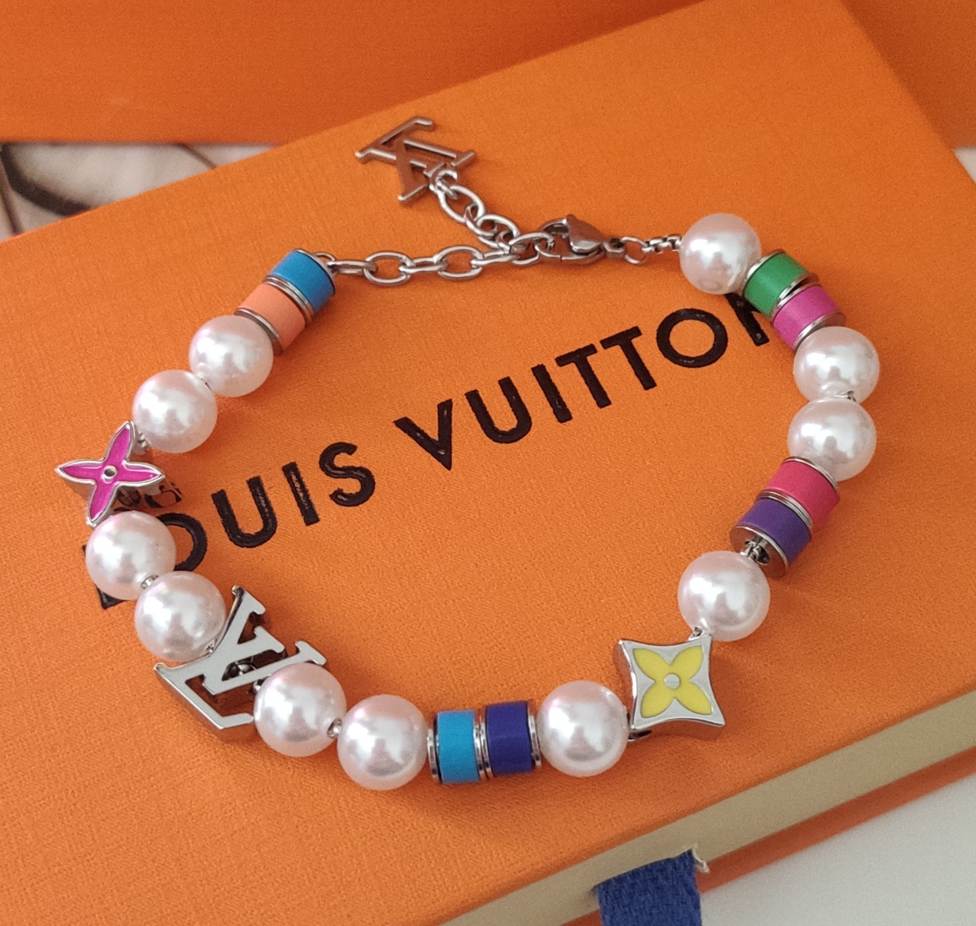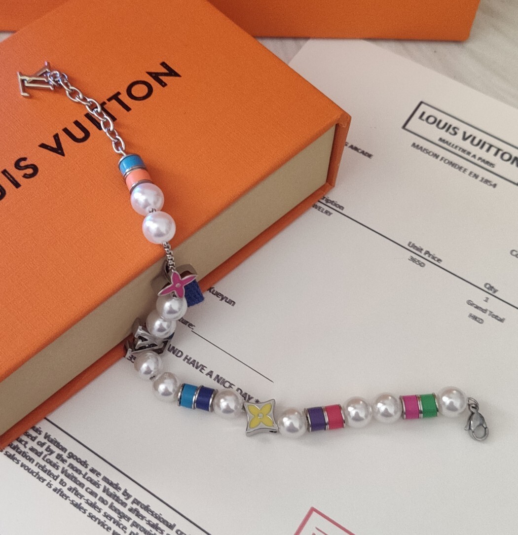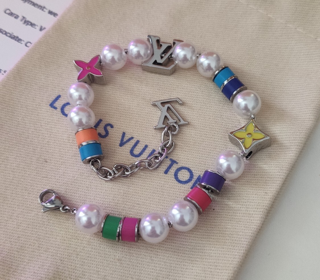 This bracelet features lustrous, high-quality faux pearls that exude sophistication. The iconic LV charms, meticulously crafted from durable alloy, add a touch of brand recognition and elevate the overall design. The vibrant, colorful enamel accents provide a playful and modern contrast to the classic pearls.