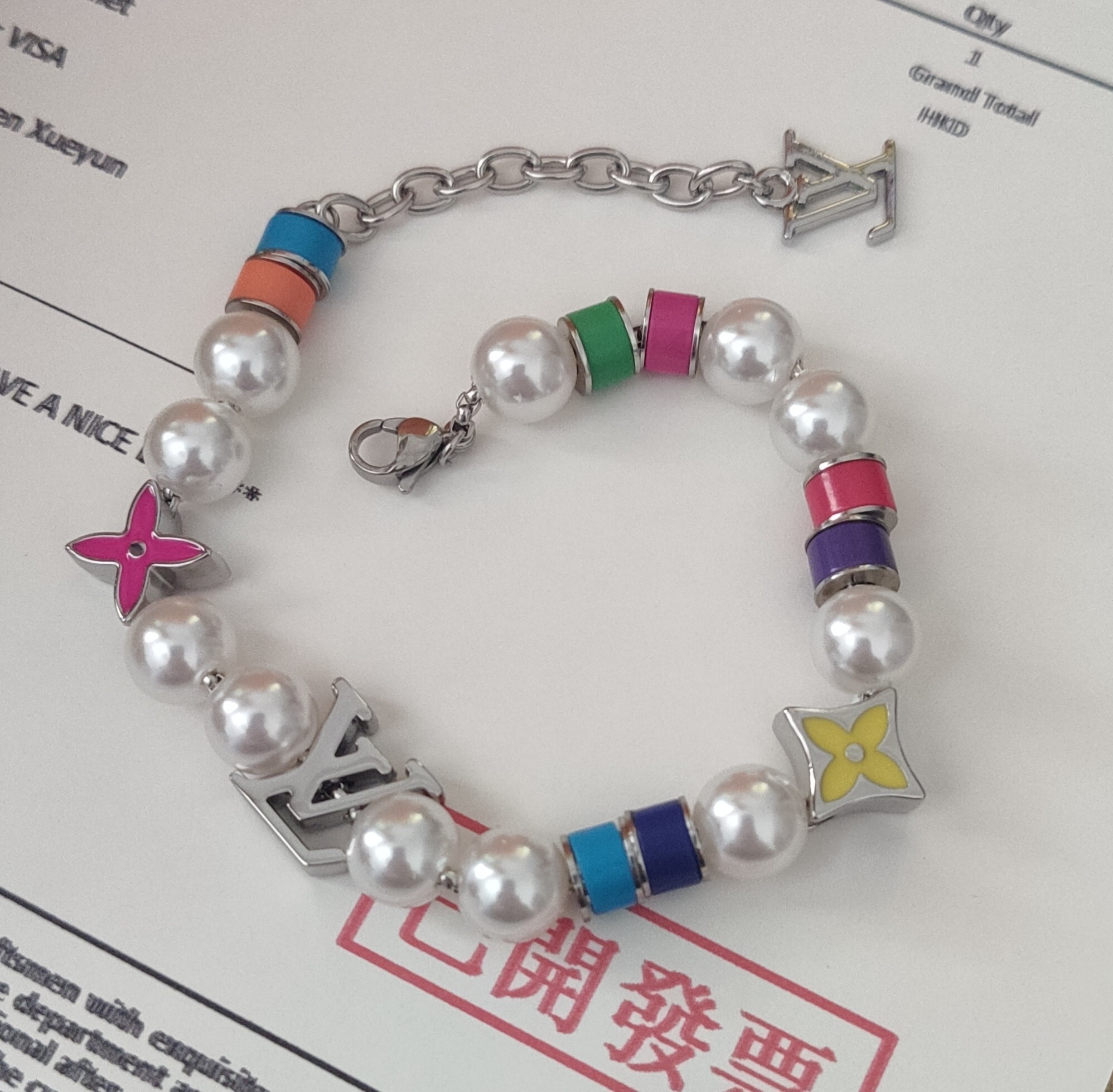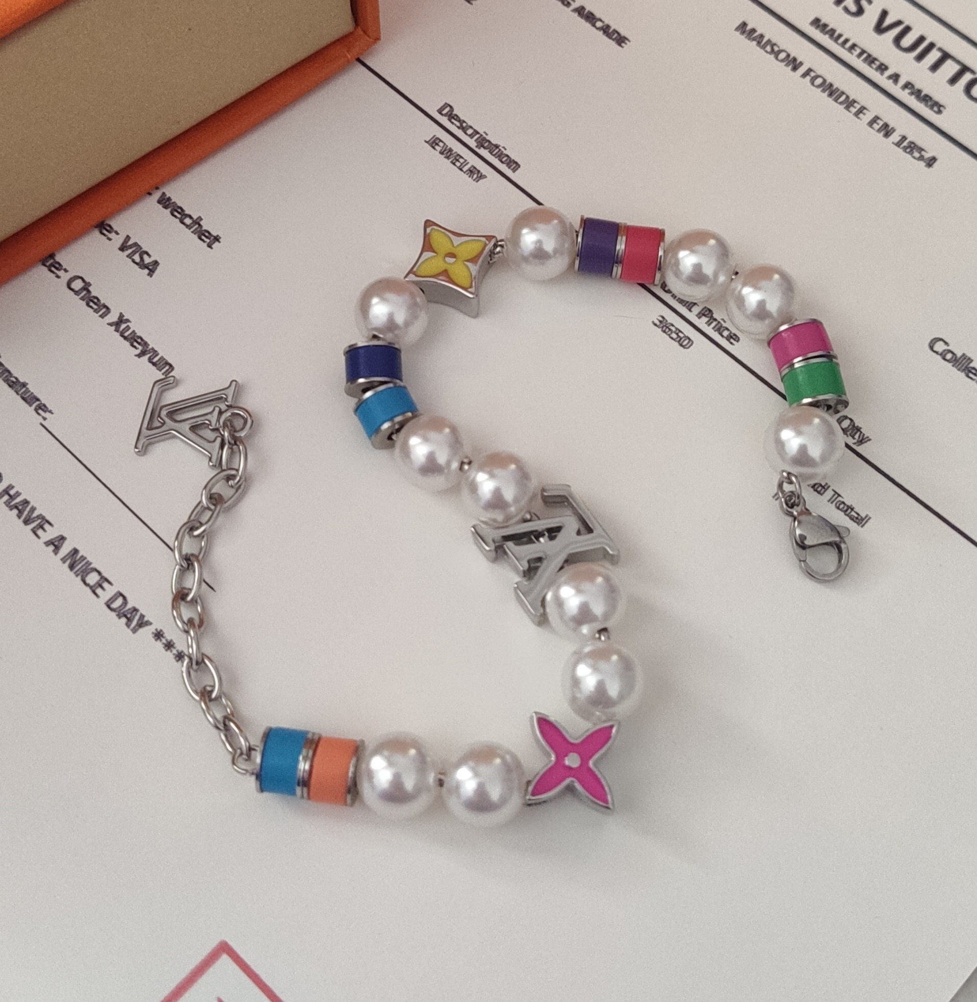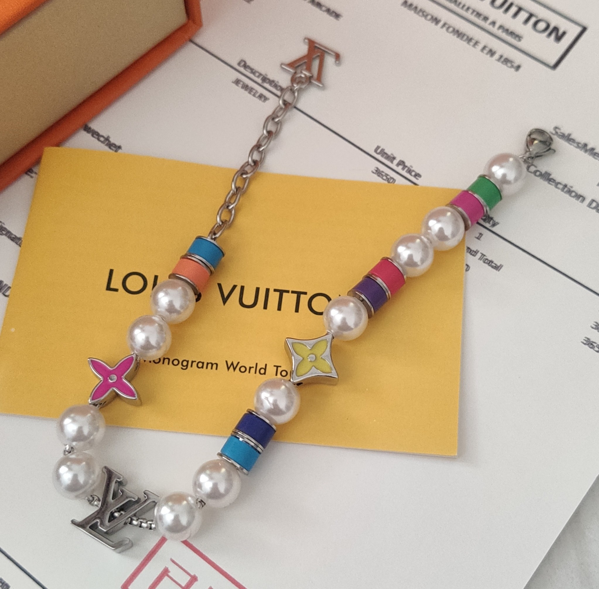 This bracelet features lustrous, high-quality faux pearls that exude sophistication. The iconic LV charms, meticulously crafted from durable alloy, add a touch of brand recognition and elevate the overall design. The vibrant, colorful enamel accents provide a playful and modern contrast to the classic pearls.
