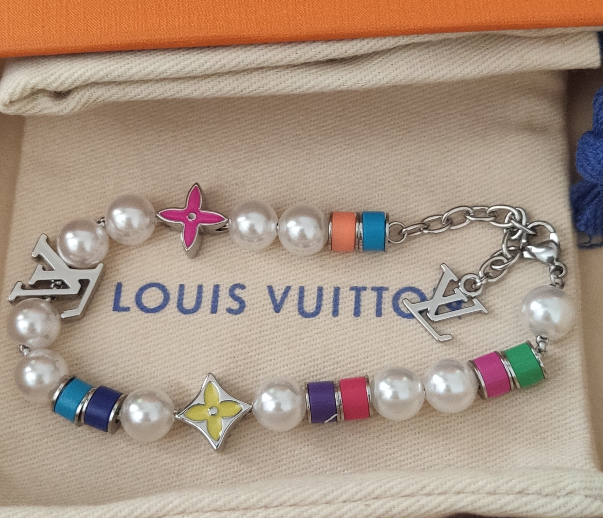 - Design: Classic pearl bracelet with iconic LV logo and floral charms
