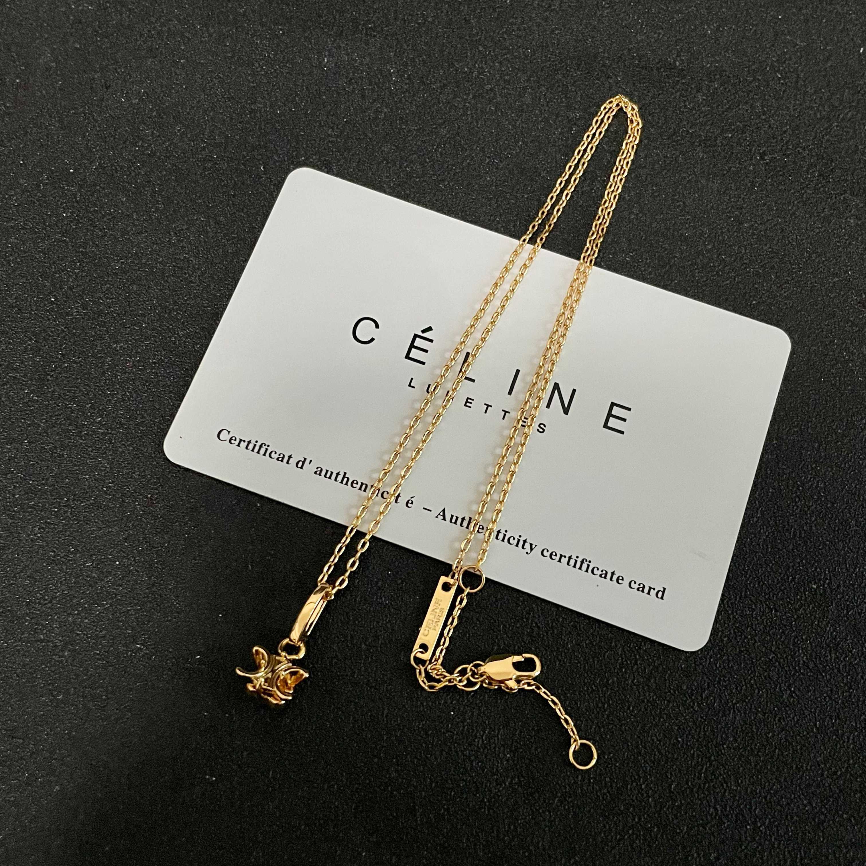 pendant elegant Celine Gold Triomphe Necklace - The Celine Gold Triomphe Pendant Necklace is an exquisite piece of jewelry that embodies timeless elegance and sophistication. Crafted with meticulous attention to detail, this necklace features the iconic Triomphe emblem, a symbol of Celine's rich heritage and commitment to luxury. The gleaming gold finish adds a touch of opulence, making it a perfect accessory for both everyday wear and special occasions. This necklace is more than just an accessory; it's a statement of refined taste and understated glamour. The delicate chain complements the pendant beautifully, creating a harmonious balance that enhances its overall appeal. Whether you're looking to elevate your personal style or searching for a thoughtful gift, the Celine Gold Triomphe Pendant Necklace is an exceptional choice.