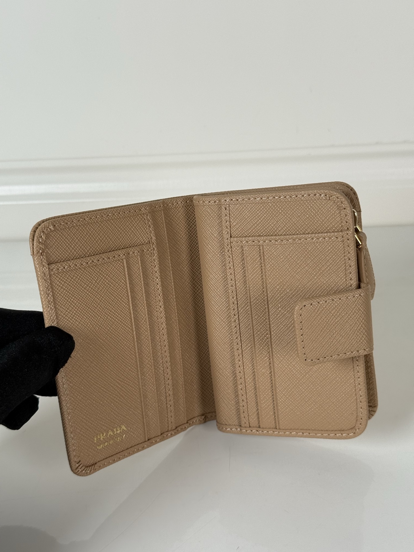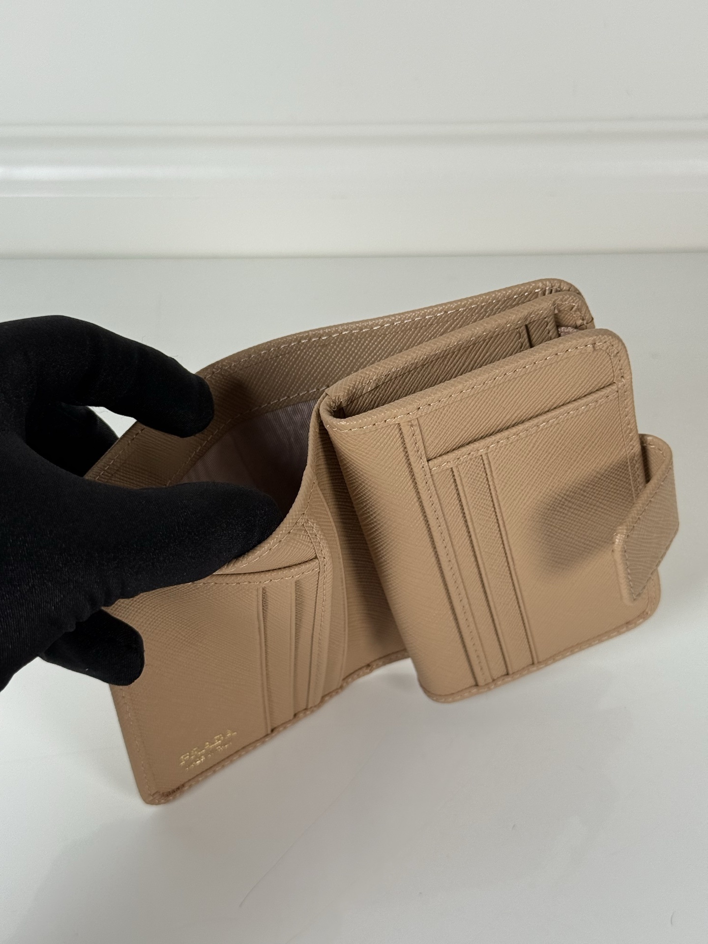 Despite its compact size, the Prada Beige Saffiano Leather Wallet offers ample storage space for your cards, cash, and coins. It features multiple card slots, a bill compartment, and a coin pocket, allowing you to keep your belongings organized and easily accessible. The well-designed interior ensures that you can carry all your essentials without sacrificing style.