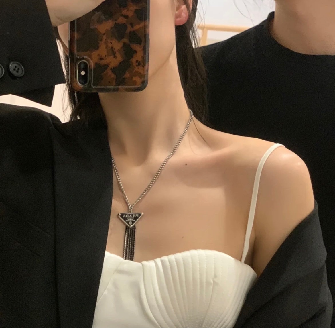 Elevate your style with the exquisite Prada Black Tassel Necklace, a sophisticated accessory that effortlessly blends modern design with timeless elegance. This stunning necklace features a sleek silver chain and a distinctive black triangle pendant, adorned with cascading tassels that add a touch of movement and flair. The Prada Black Tassel Necklace is more than just jewelry; it's a statement piece that reflects your impeccable taste and elevates any ensemble.