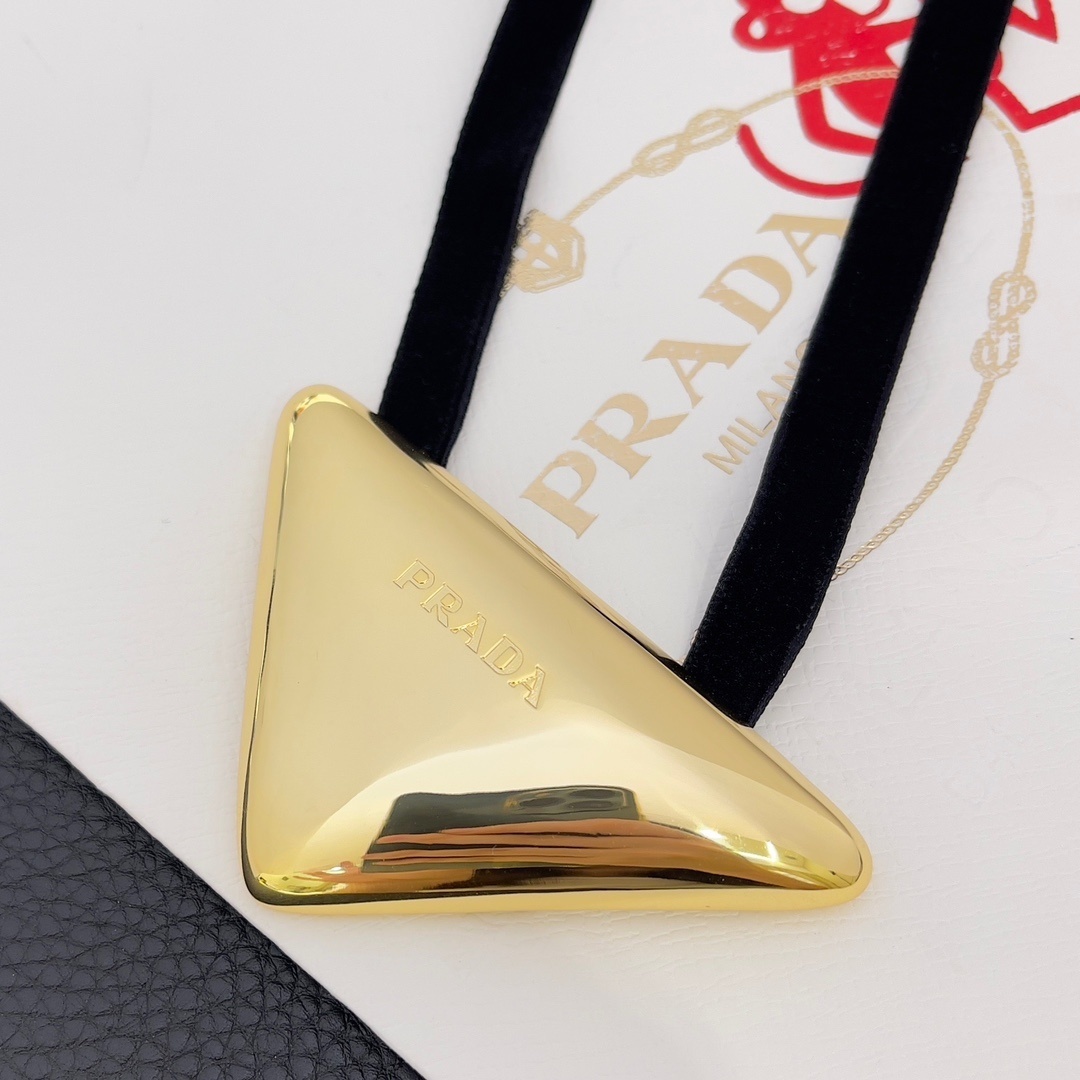 The design of the Prada Golden Triangle Velvet Necklace is both modern and timeless. The iconic triangle logo is a signature element of the Prada brand, representing innovation and style. The soft velvet ribbon adds a touch of femininity and elegance, balancing the geometric shape of the pendant. This necklace is versatile enough to be worn with a variety of outfits, from casual jeans and a t-shirt to a formal evening gown. Its unique design ensures that it will always stand out, making it a conversation starter and a stylish addition to your wardrobe. The Prada Golden Triangle Velvet Necklace is a perfect blend of classic and contemporary design.