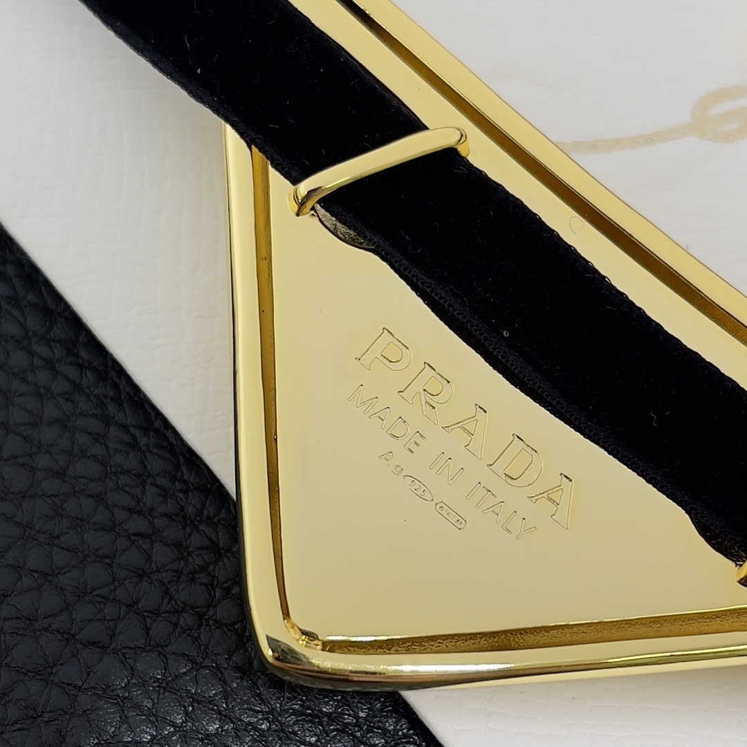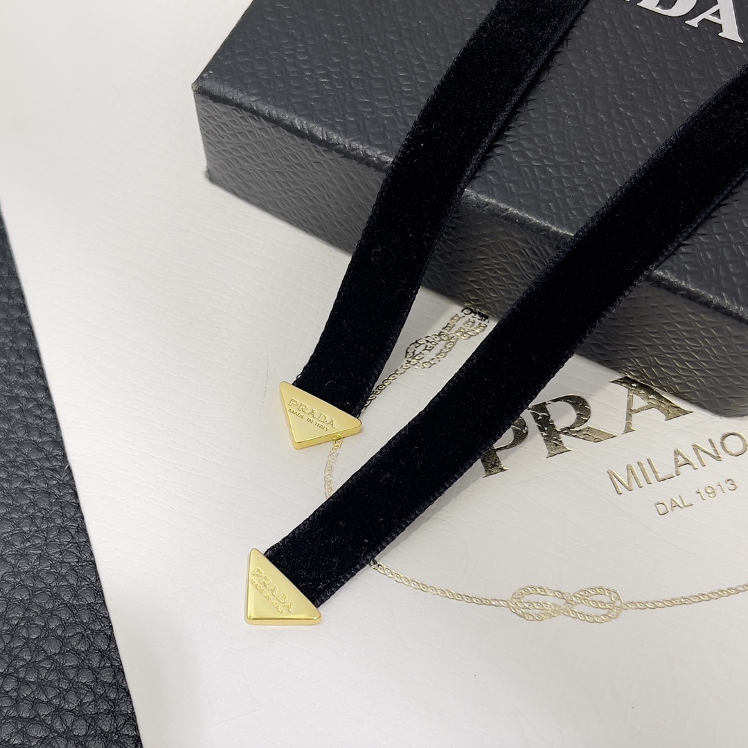 Prada Golden Triangle Necklace - Elevate your style with the exquisite Prada Golden Triangle Velvet Necklace. This stunning piece combines the iconic Prada triangle logo with a luxurious velvet ribbon, creating a statement accessory that exudes elegance and sophistication. The necklace is perfect for adding a touch of glamour to any outfit, whether it's a casual daytime look or an evening ensemble. The gold-tone finish of the triangle pendant complements the soft velvet ribbon, making it a versatile addition to your jewelry collection. The Prada Golden Triangle Velvet Necklace is more than just an accessory; it's a symbol of timeless fashion and impeccable taste.
