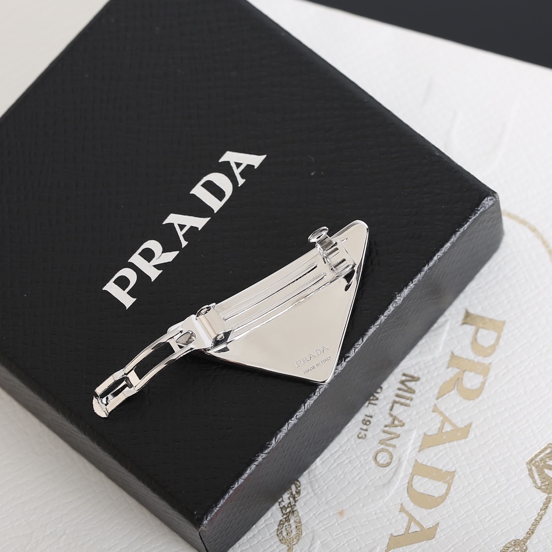 The Prada Red Triangle Hair Clip is crafted with meticulous attention to detail, ensuring both durability and aesthetic appeal. The clip is made from high-quality metal, providing a secure hold without damaging your hair. The red enamel triangle logo is flawlessly applied, creating a bold and eye-catching contrast against the metal base. Its versatile design makes it suitable for various hair types and styles, from casual to formal.