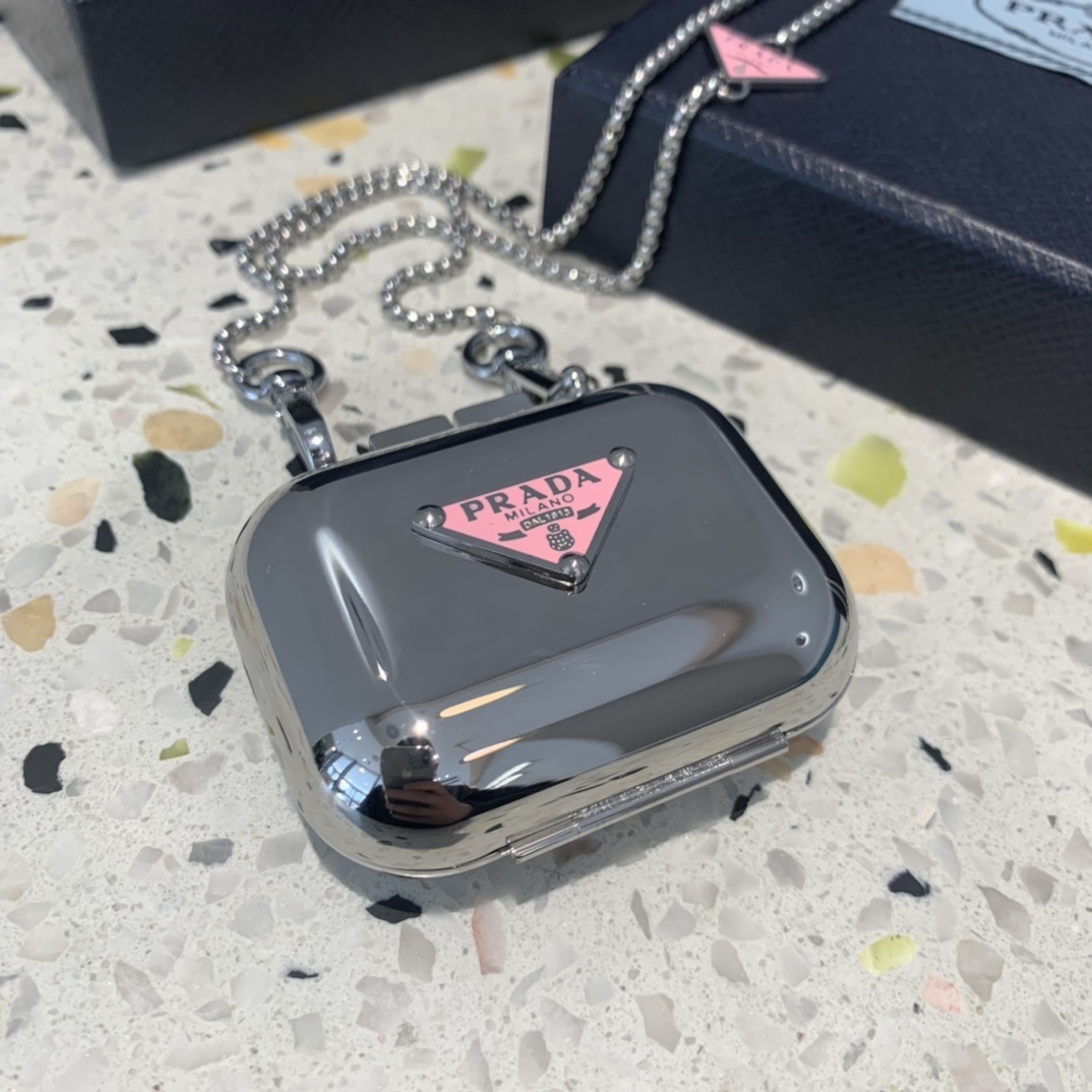 Prada Silver AirPods Case accessory - Elevate your tech accessories with the Prada Silver AirPods Case Necklace, a fusion of luxury and functionality. This stylish necklace features a sleek, silver-tone metal AirPods case adorned with the iconic Prada triangle logo. Perfect for fashion-forward individuals who want to keep their AirPods safe and accessible while making a statement. The Prada Silver AirPods Case Necklace is not just an accessory; it’s a symbol of sophistication and modern elegance.