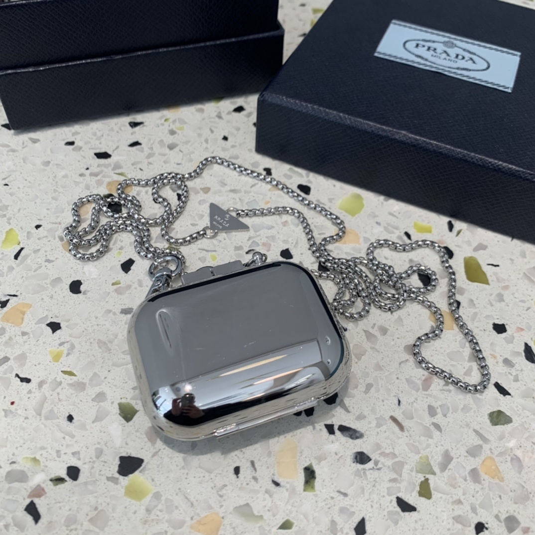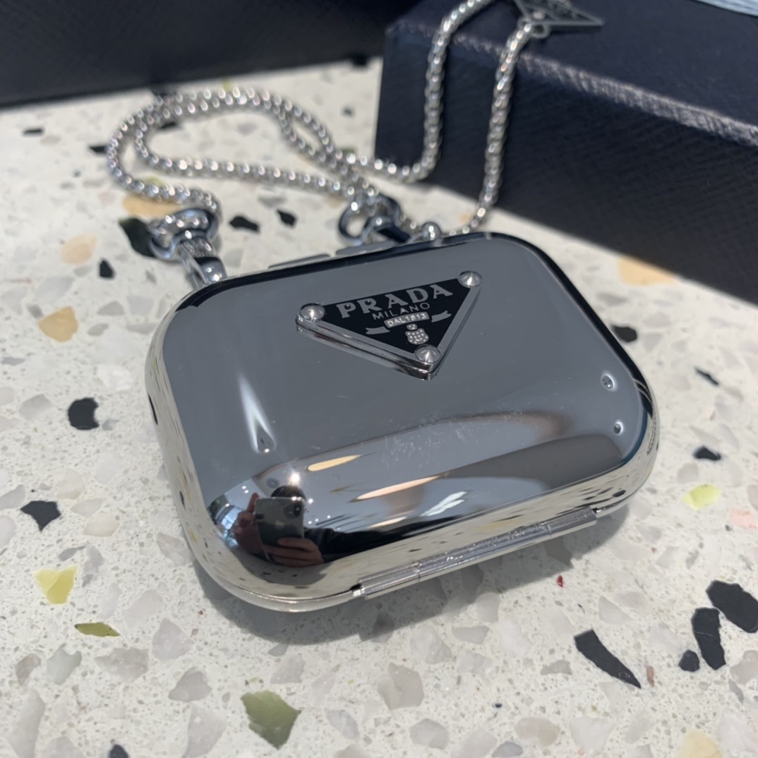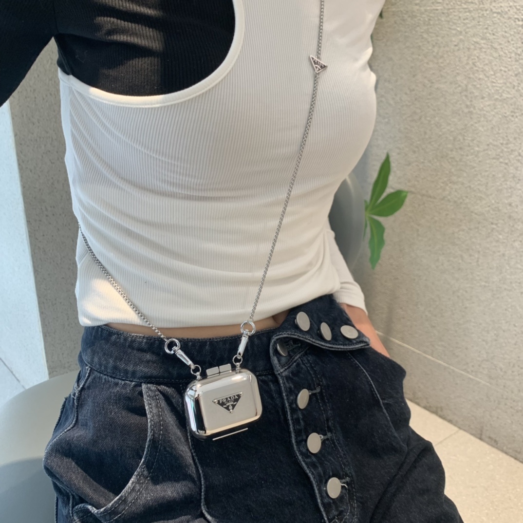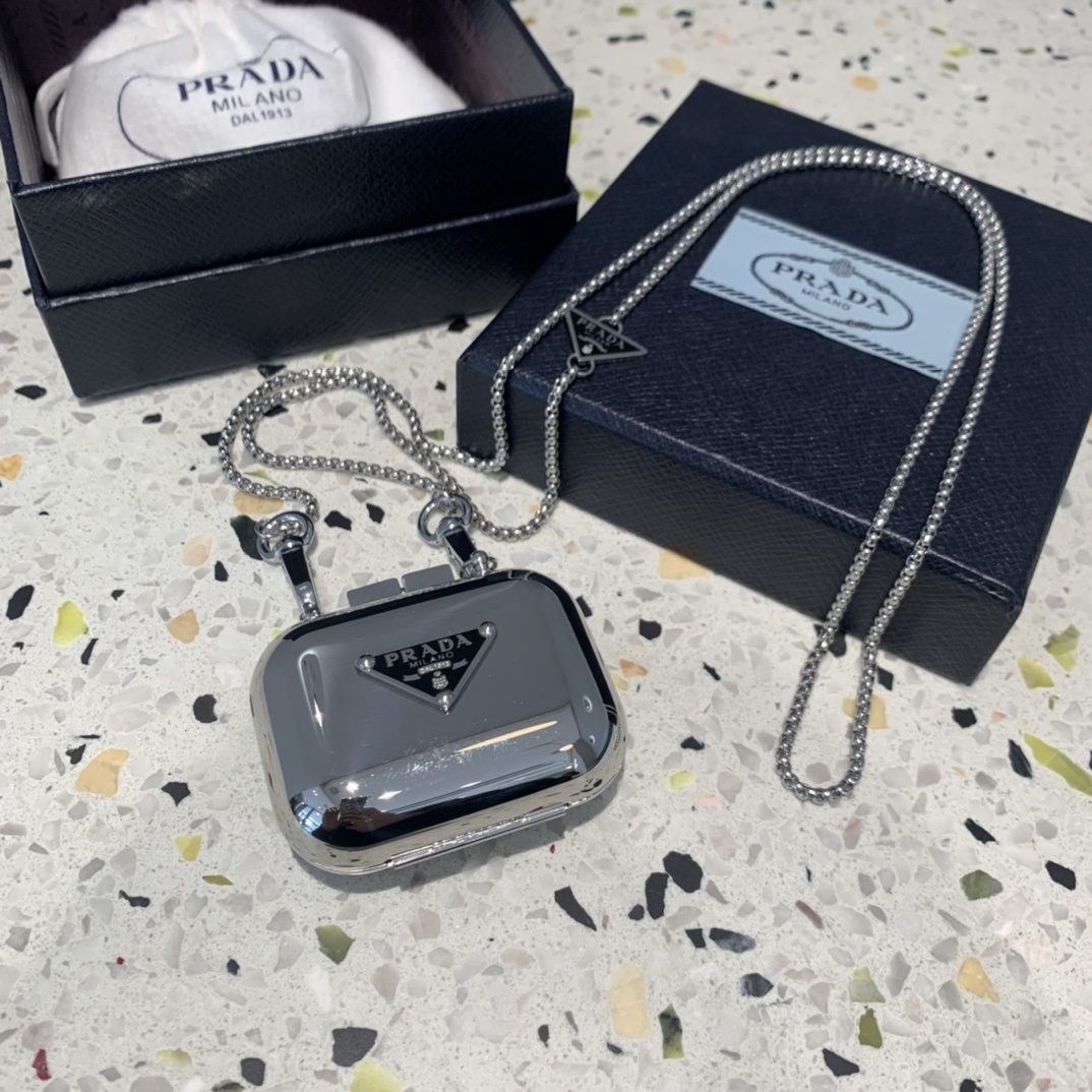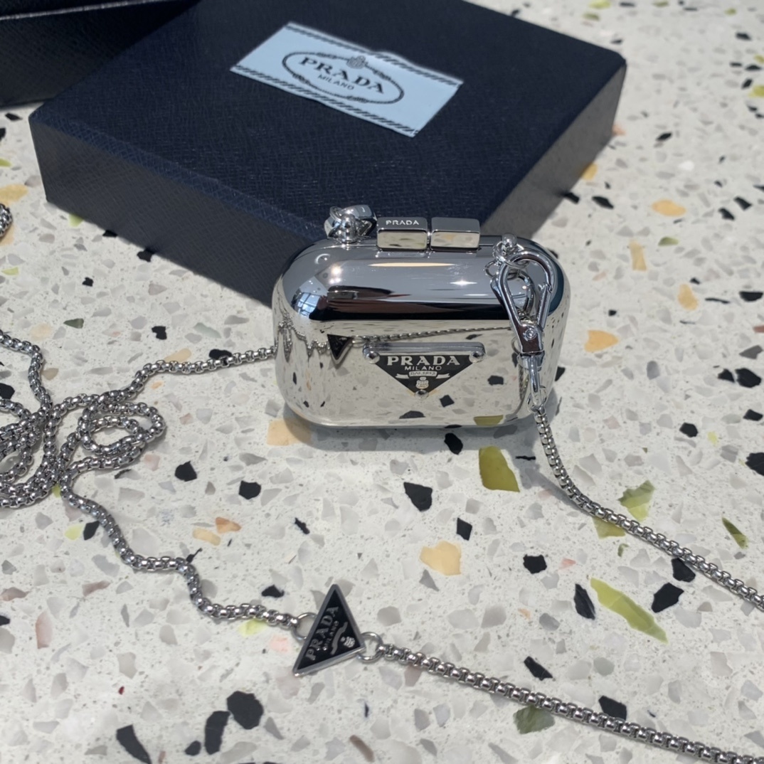 Prada Silver AirPods Pro Case necklace chain - Elevate your everyday style with the Prada Silver AirPods Pro Case Necklace, a luxurious and functional accessory that seamlessly blends fashion and technology. This exquisite piece is more than just an AirPods case; it's a statement of sophistication and a testament to Prada's commitment to innovative design. The sleek silver finish, coupled with the iconic Prada triangle logo, exudes elegance and adds a touch of glamour to your daily ensemble. This is the perfect way to keep your AirPods safe and close at hand, while showcasing your impeccable taste.