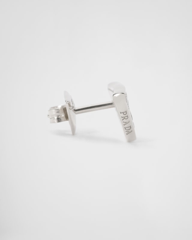 The silver is polished to a high shine, creating a reflective surface that catches the light. The intricate detailing of the triangle logo adds depth and dimension to the design. These earrings are a true reflection of Prada's commitment to quality and craftsmanship.