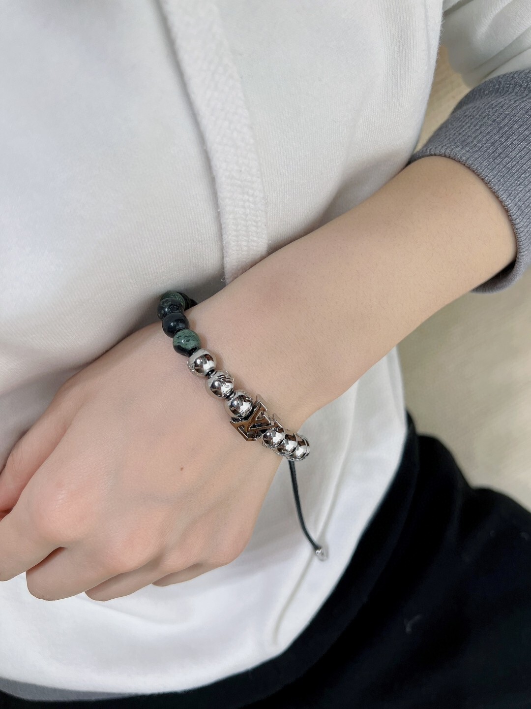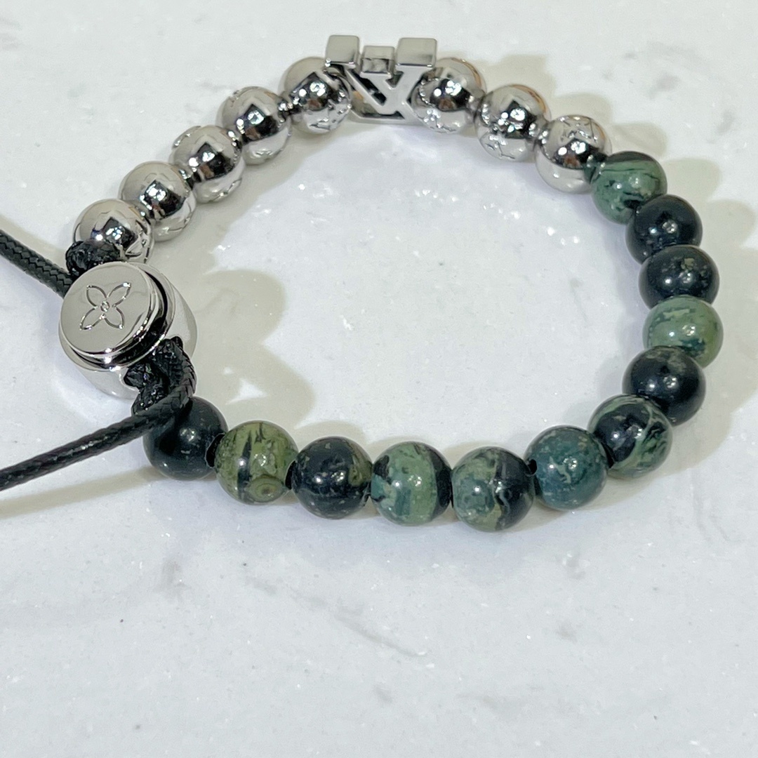 Crafted from a combination of natural stone beads and polished metal accents, this bracelet exudes luxury. The natural stone beads feature unique variations in color and pattern, adding a touch of individuality to each piece. The polished metal beads are meticulously crafted and showcase iconic logo detailing, elevating the overall design. The durable cord ensures a comfortable and secure fit.