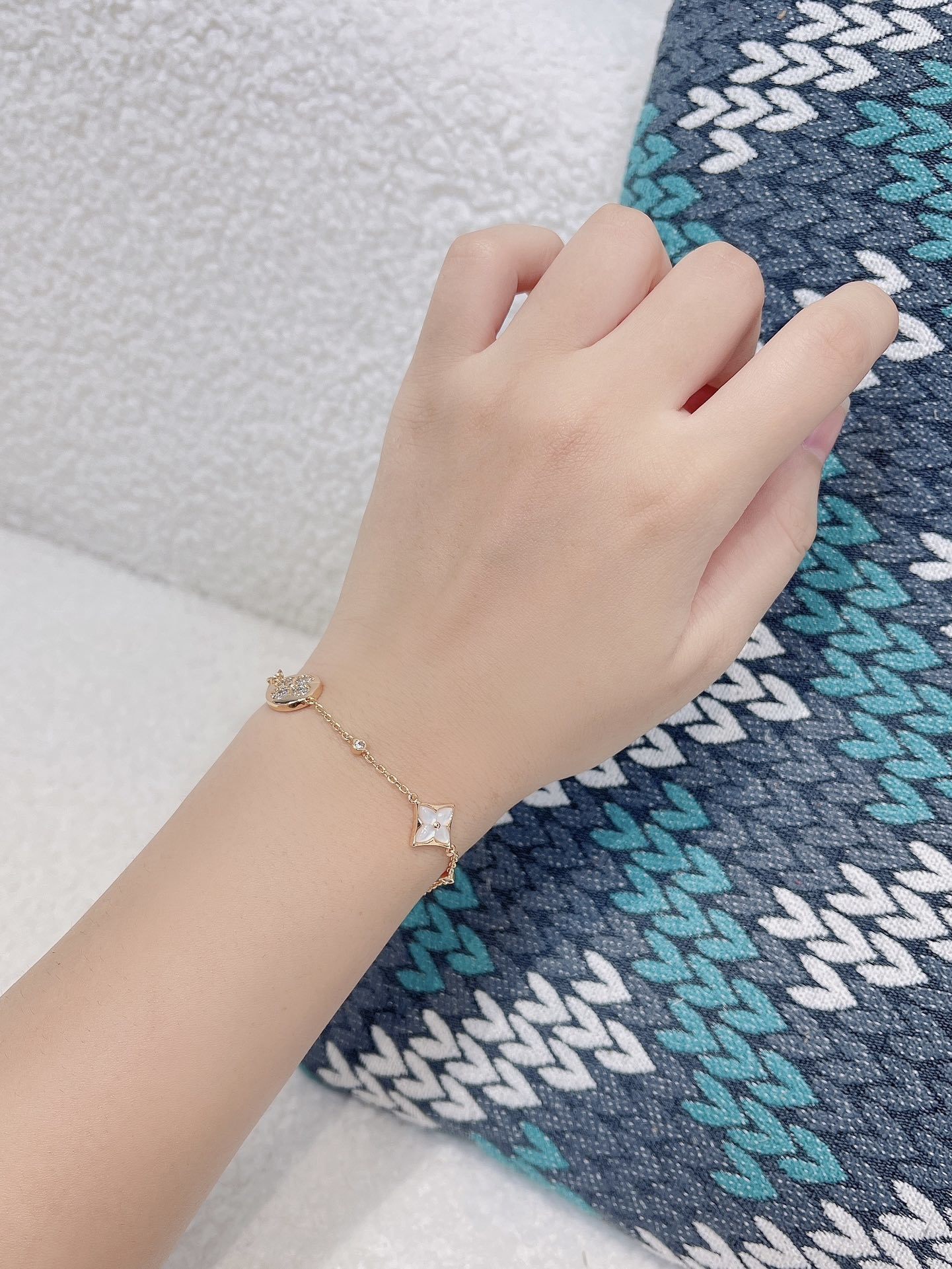 Design: Features delicate clover charms, a symbol of luck and prosperity. The intricate design showcases a harmonious blend of geometric shapes and vibrant colors, adding a touch of playfulness to the overall elegance.