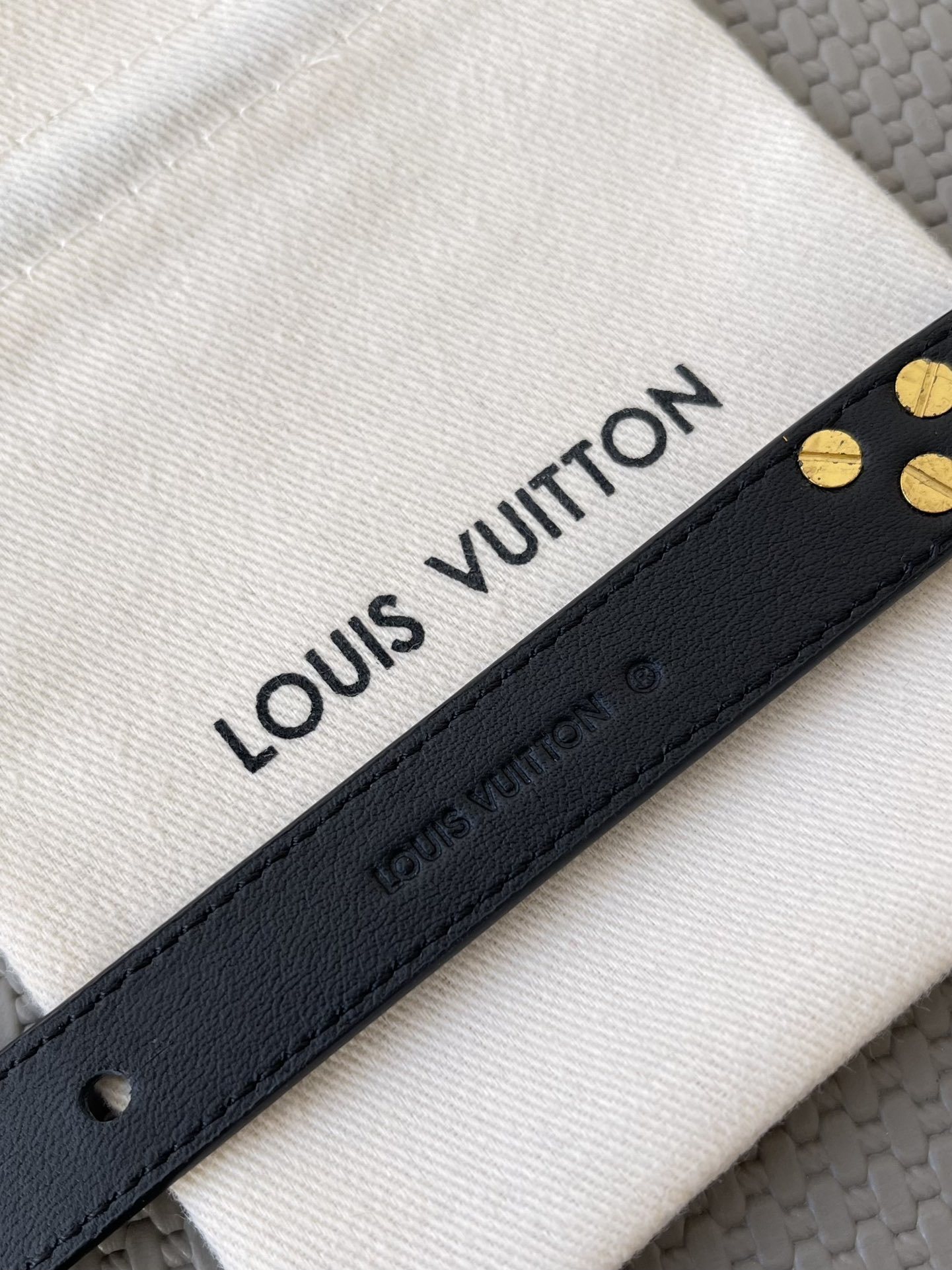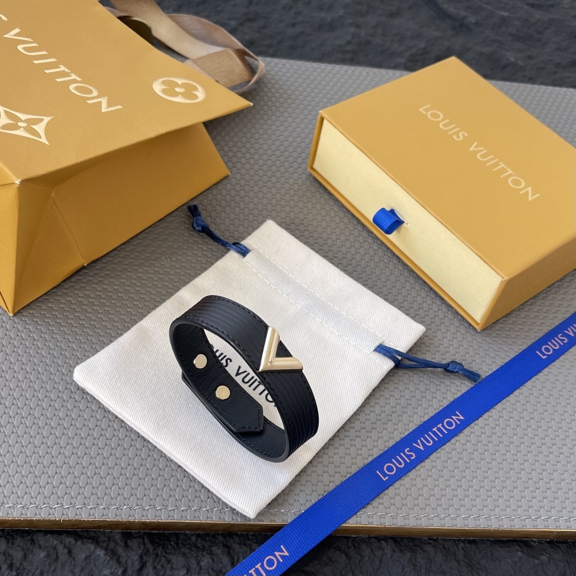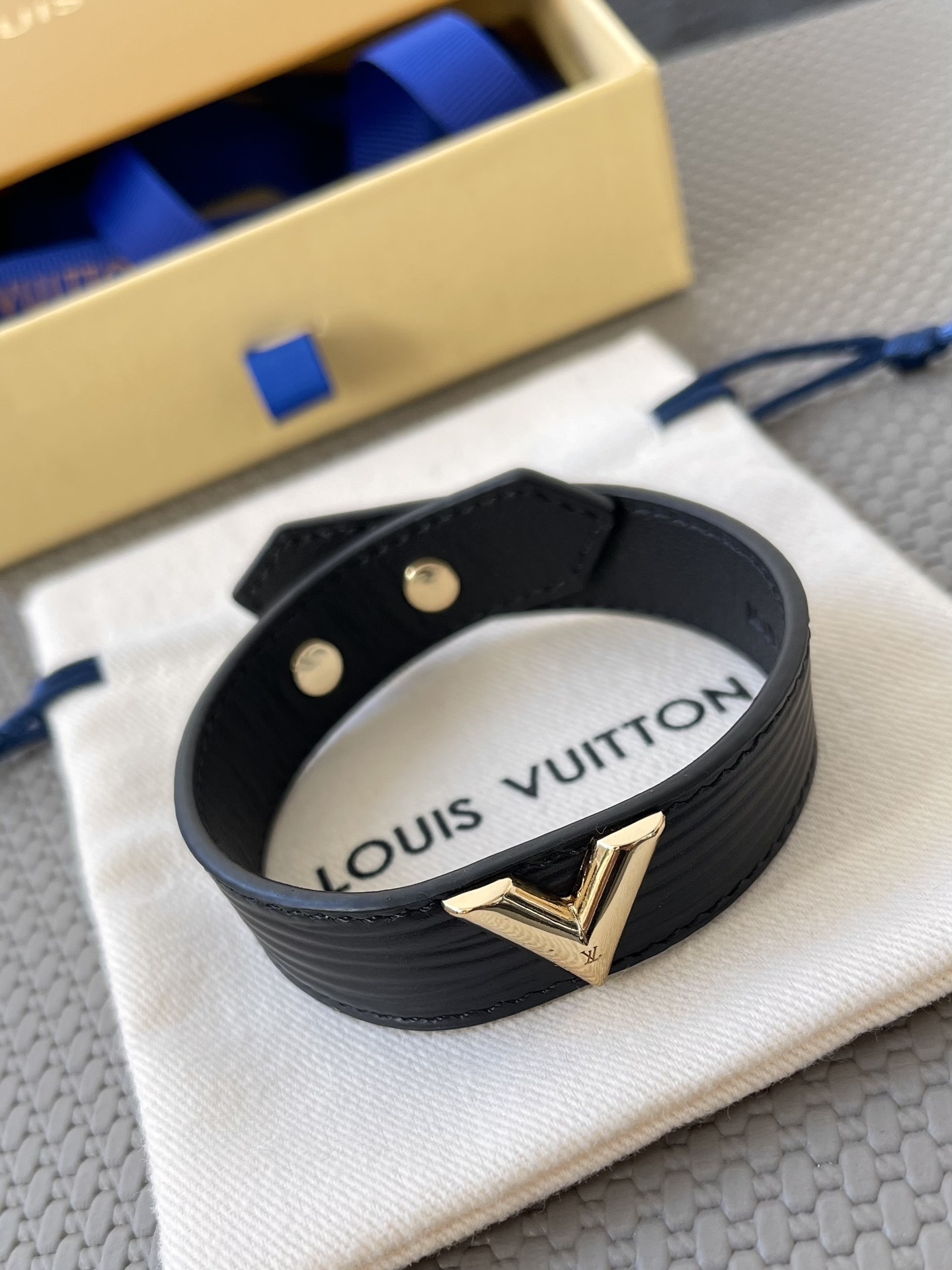 Our premium bracelet is made from the finest quality leather, ensuring both durability and a luxurious feel against your skin. The iconic V detail is expertly crafted and finished to a brilliant shine, adding a touch of understated glamour. The bracelet's adjustable design guarantees a comfortable and secure fit for any wrist size.