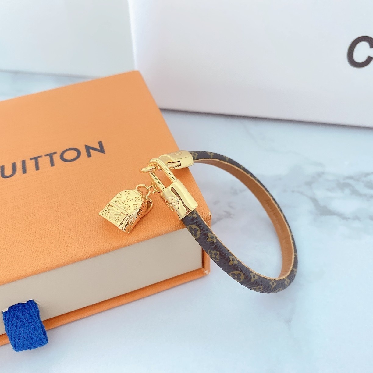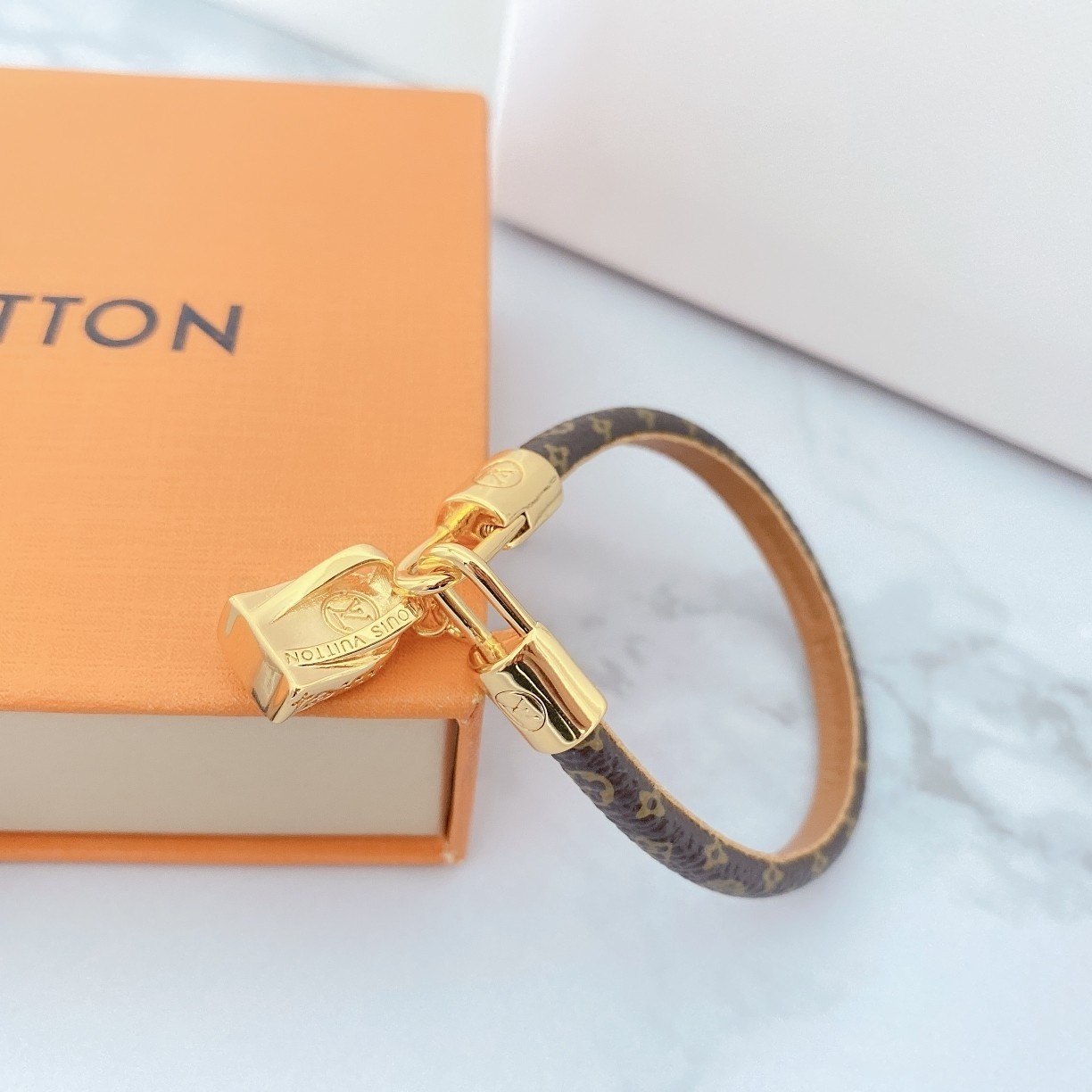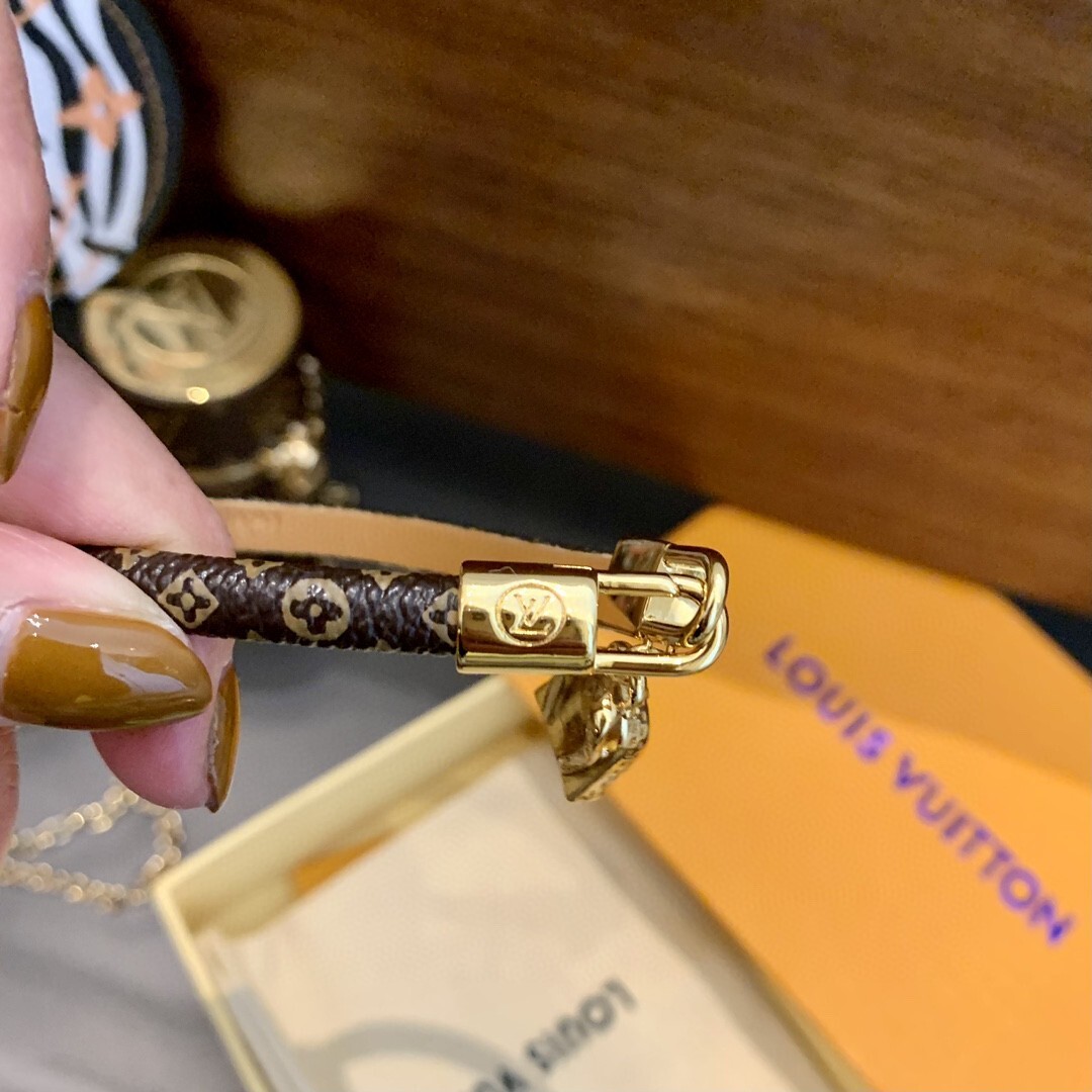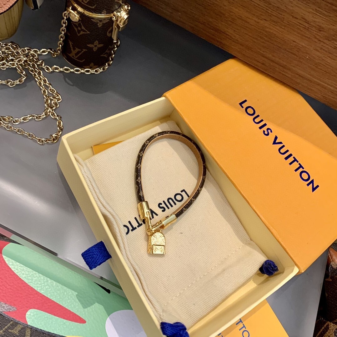 Crafted with meticulous attention to detail, this bracelet features a delicate monogram pattern on a premium material, complemented by a radiant gold charm. The combination of textures and tones creates a visually captivating piece that is sure to turn heads.