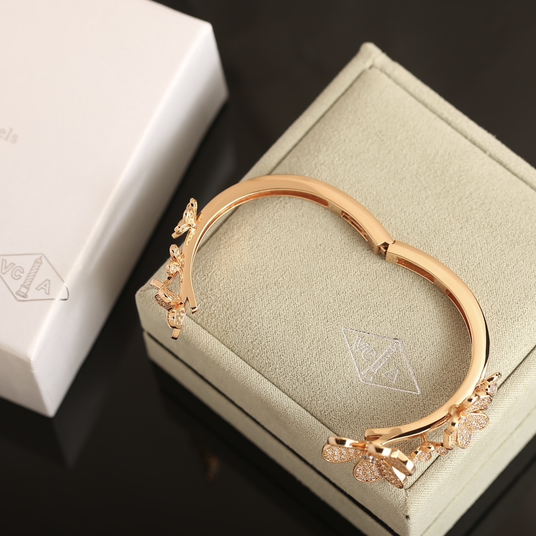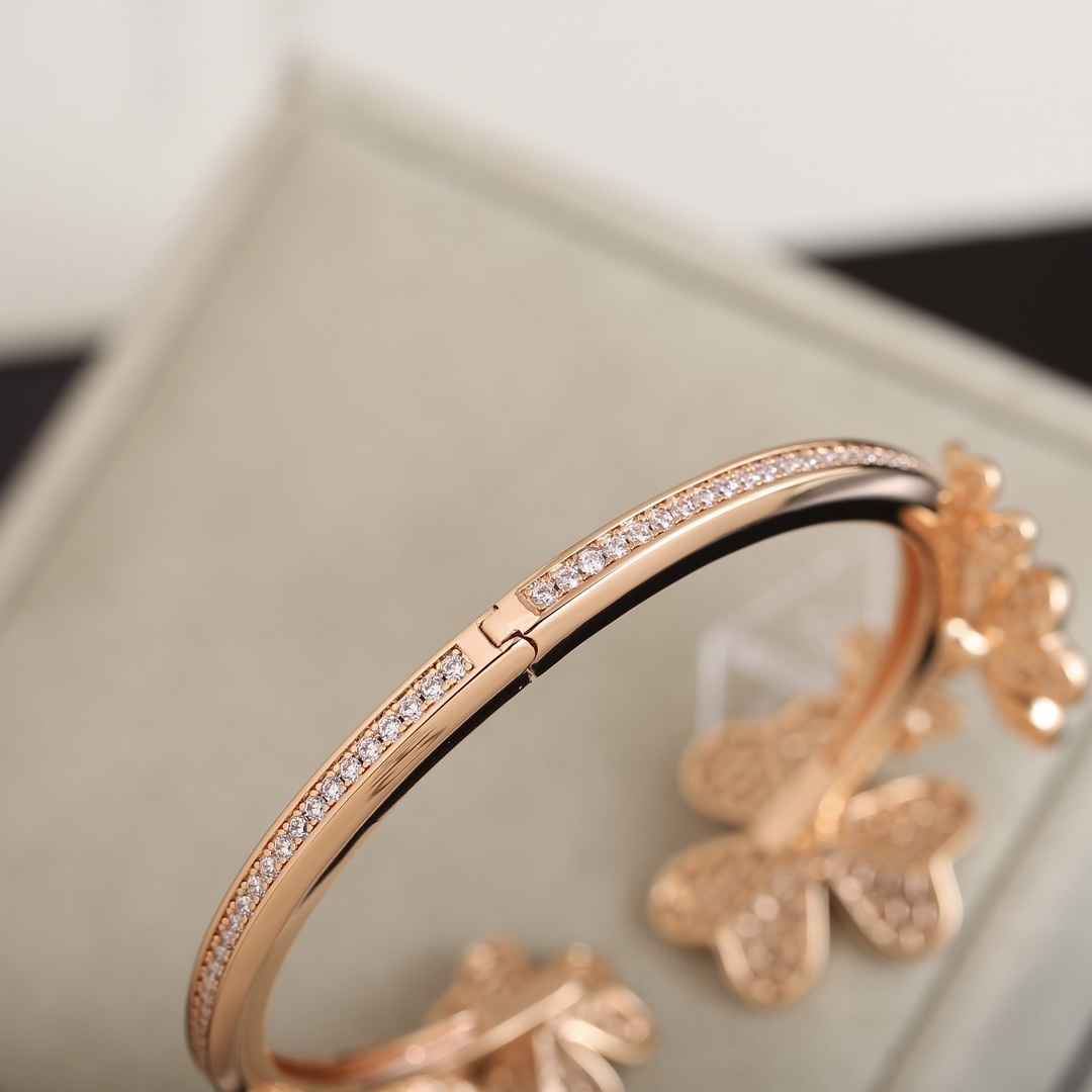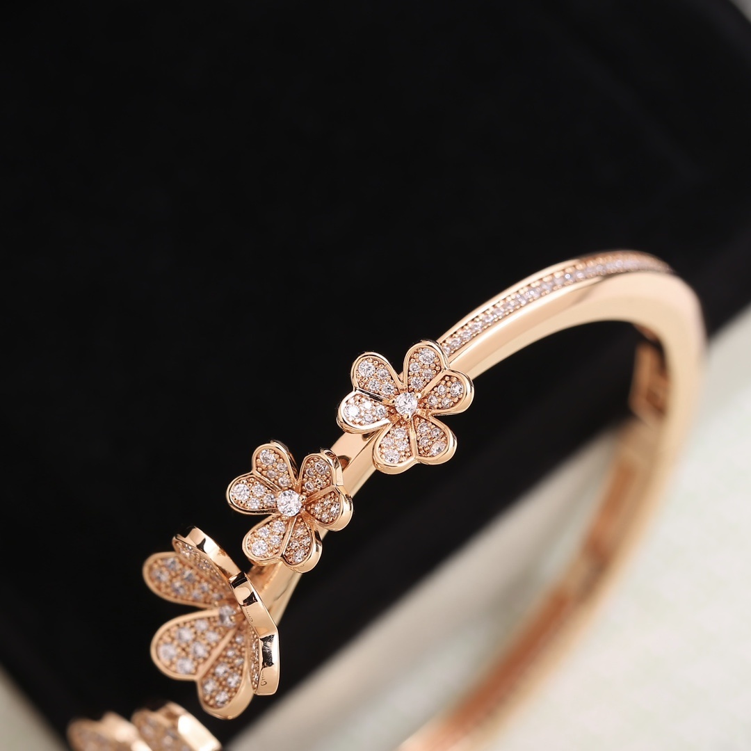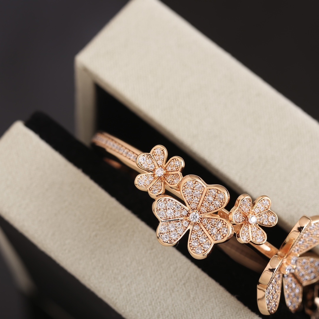 This bangle features delicate flower motifs adorned with sparkling stones, creating a captivating display of light and brilliance. The rose gold finish adds a touch of warmth and sophistication, making it a versatile piece that complements any outfit. The open-cuff design ensures a comfortable fit and easy wear.