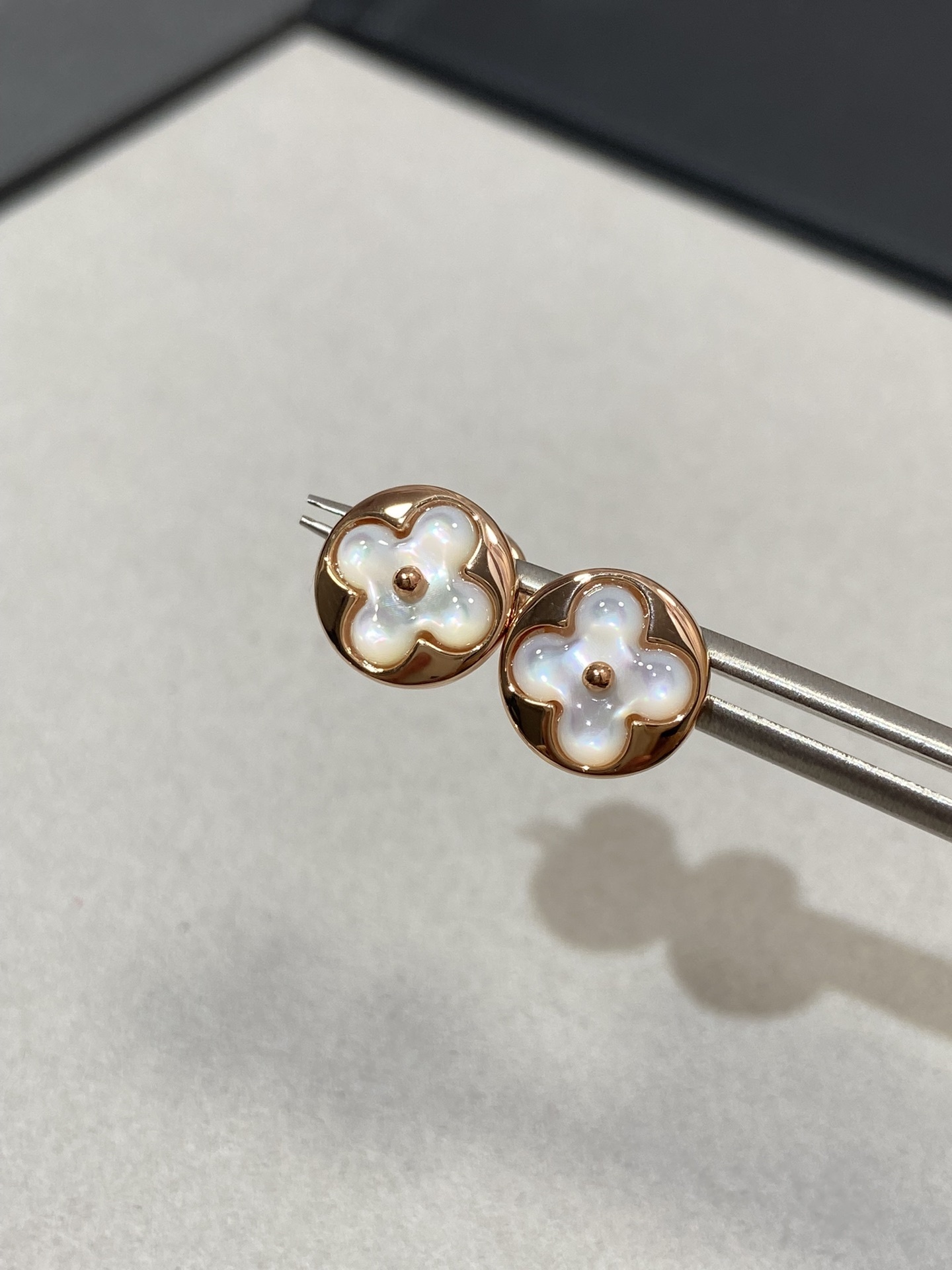 A: The earrings are crafted from high-quality rose gold and feature genuine mother-of-pearl inlays.