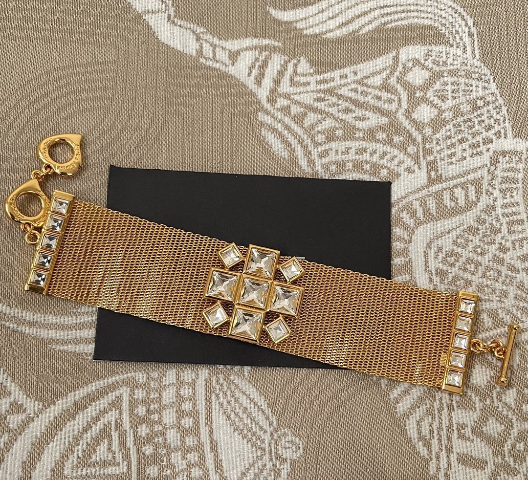 Introducing the epitome of elegance – the Saint Laurent Gold-Tone Crystal Mesh Bracelet. This exquisite piece is designed for the modern woman who appreciates timeless style and impeccable craftsmanship. It's more than just a bracelet; it's a statement of sophistication and refined taste.