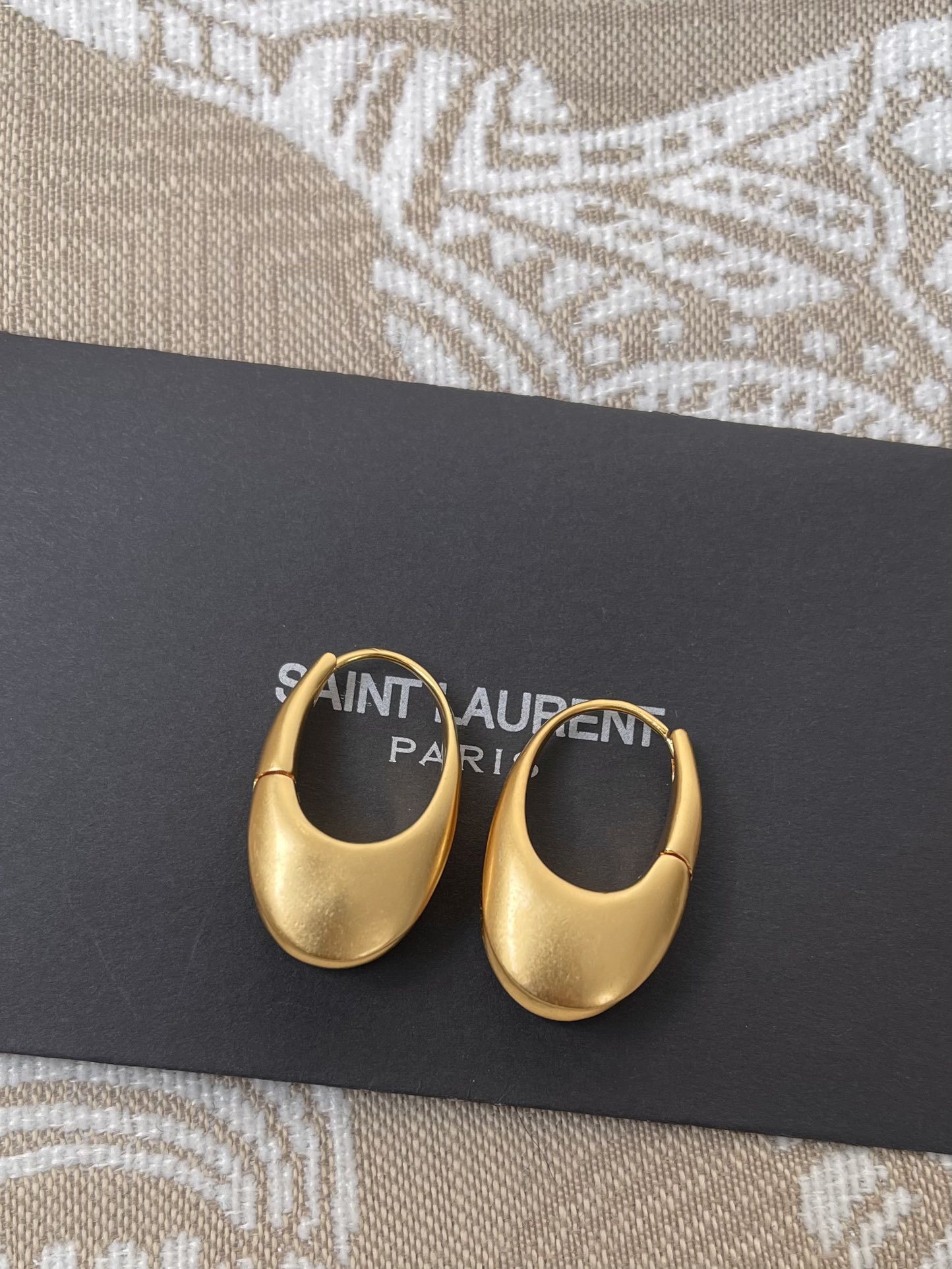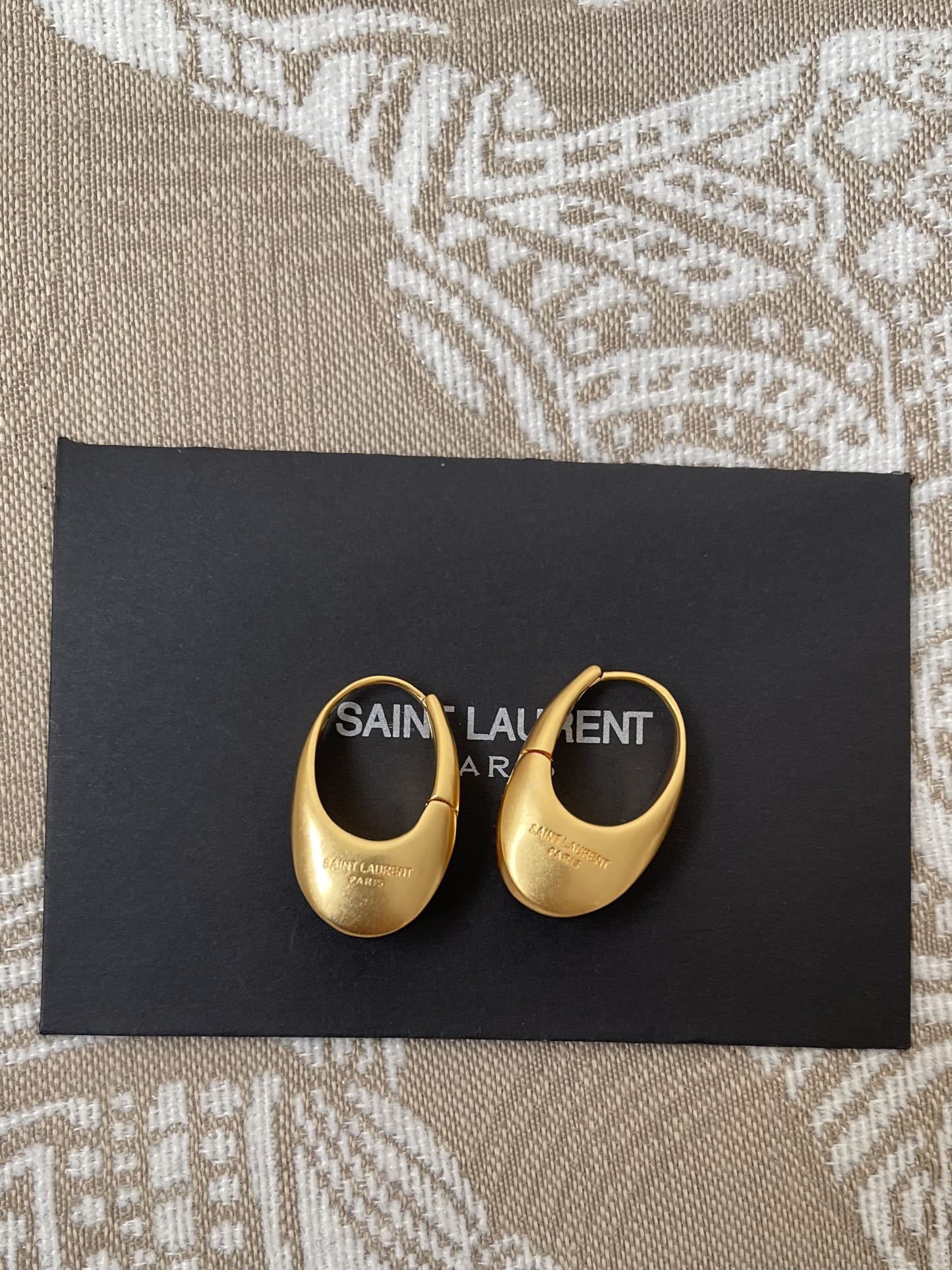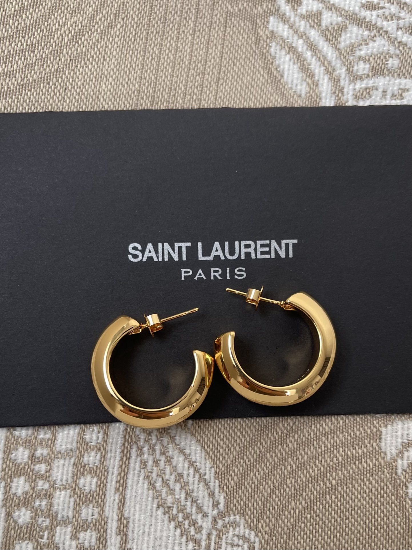 Saint Laurent Gold Hoop Earrings designer - Elevate your style with the timeless elegance of Saint Laurent Gold Hoop Earrings. These stunning earrings are more than just accessories; they are a statement of sophistication and refined taste. Crafted with meticulous attention to detail, the Saint Laurent Gold Hoop Earrings are designed to capture the light and turn heads wherever you go. Whether you're dressing up for a special occasion or adding a touch of glamour to your everyday look, these earrings are the perfect choice. The high-quality materials and impeccable craftsmanship ensure that these earrings will be a cherished part of your jewelry collection for years to come. Saint Laurent is renowned for its luxurious designs and commitment to excellence, and these gold hoop earrings are a testament to the brand's legacy.