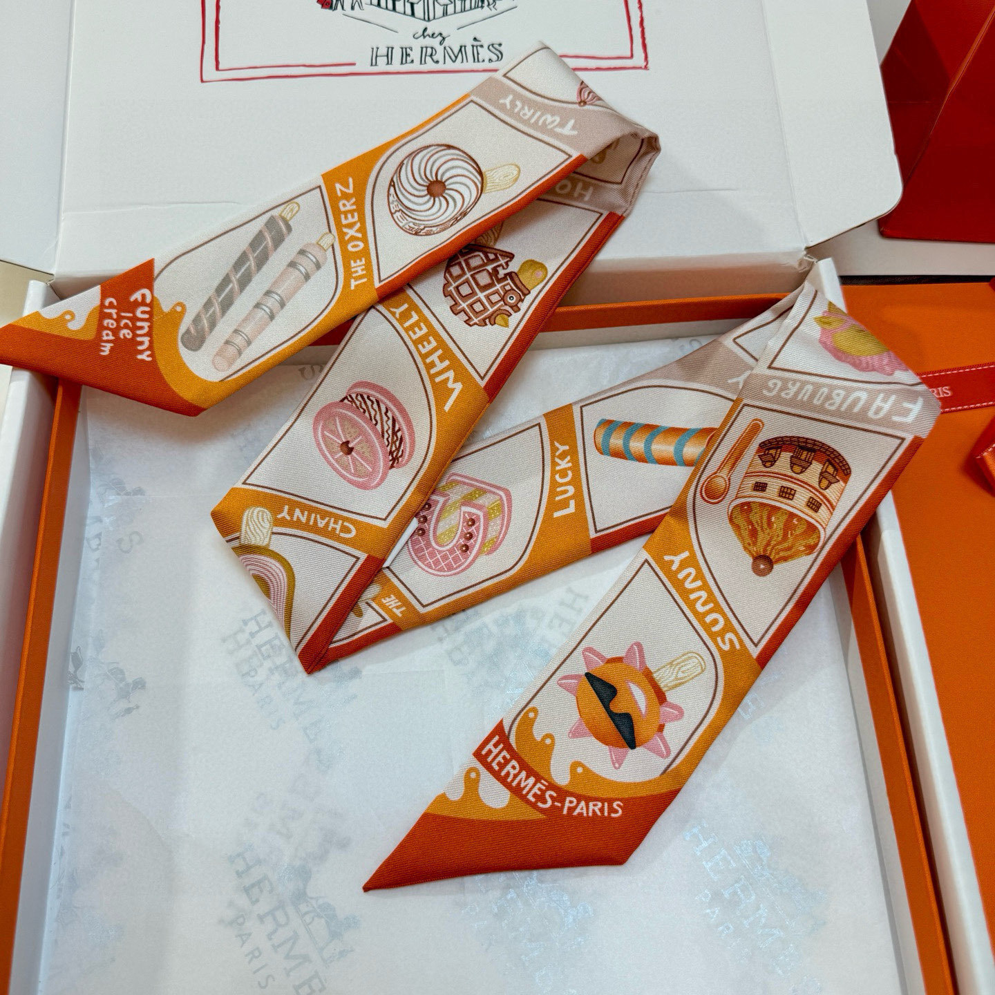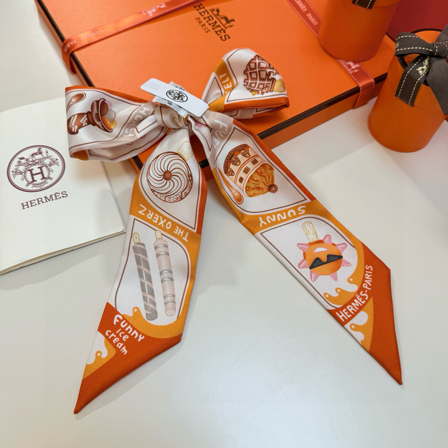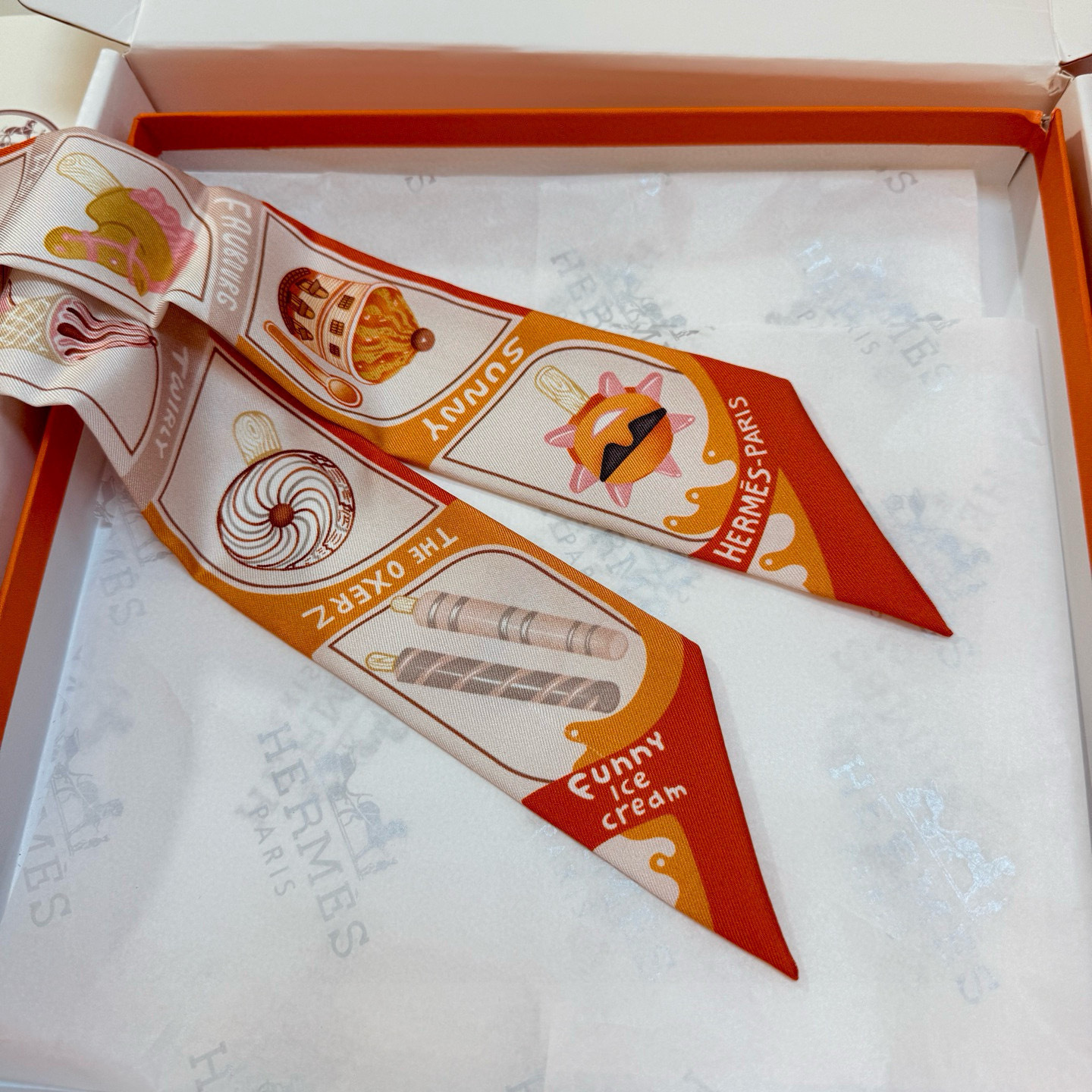 scarf Hermès Sunny Faubourg Twilly - Elevate your accessory game with the delightful Hermès Sunny Faubourg Twilly Scarf, a whimsical addition to any wardrobe. This silk scarf features a playful ice cream print, adding a touch of sweetness and charm to your everyday style. Crafted from luxurious silk, this Twilly scarf is not only visually appealing but also incredibly soft and comfortable to wear. The Hermès Sunny Faubourg Twilly Scarf is the perfect accessory to express your unique personality and add a touch of elegance to any outfit. Accessorize your handbag with this Hermès silk twilly. The Hermès Sunny Faubourg Twilly Scarf will turn heads.