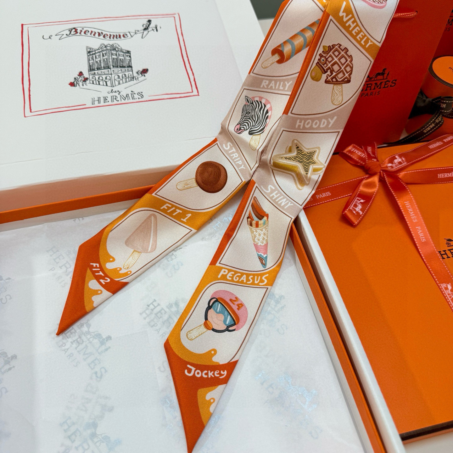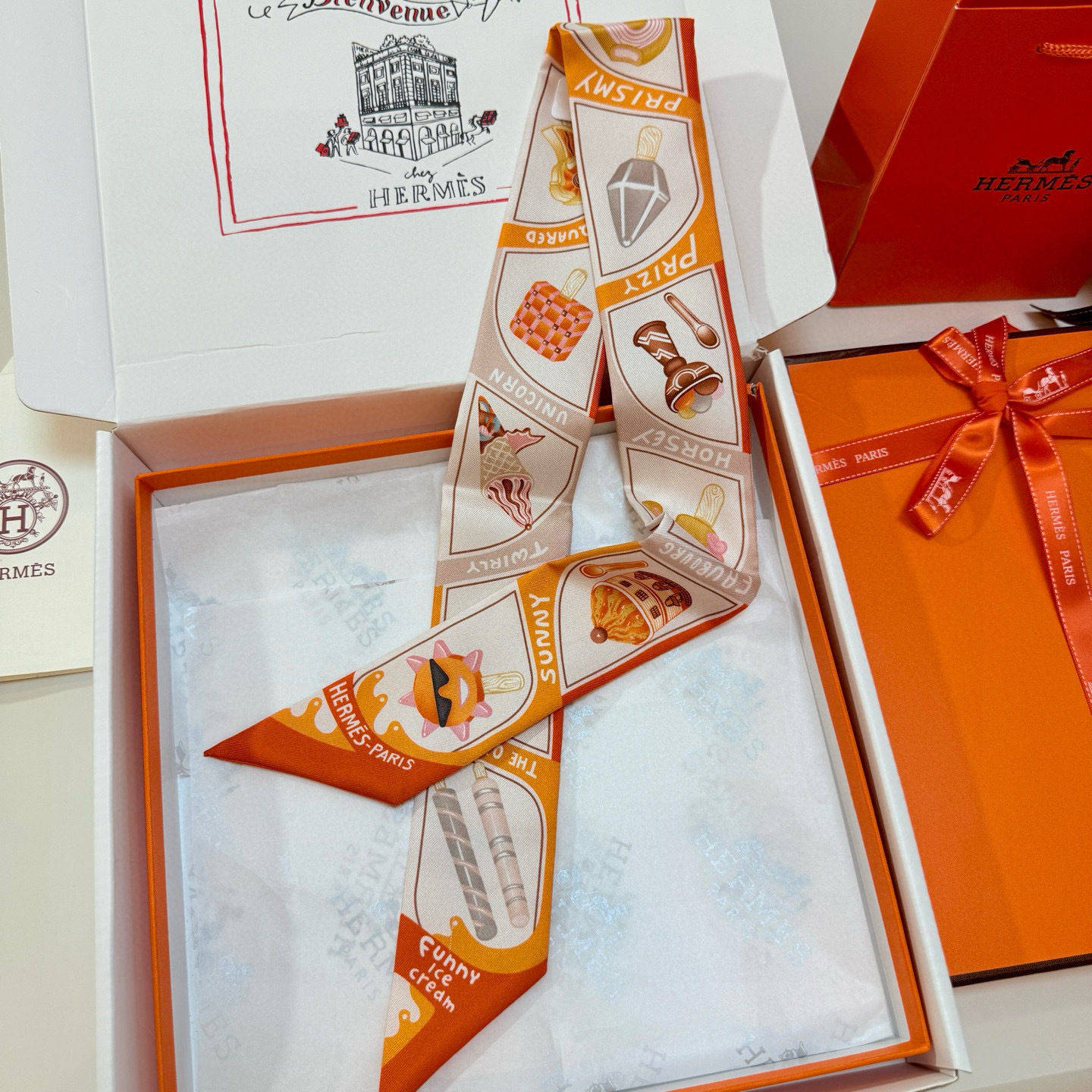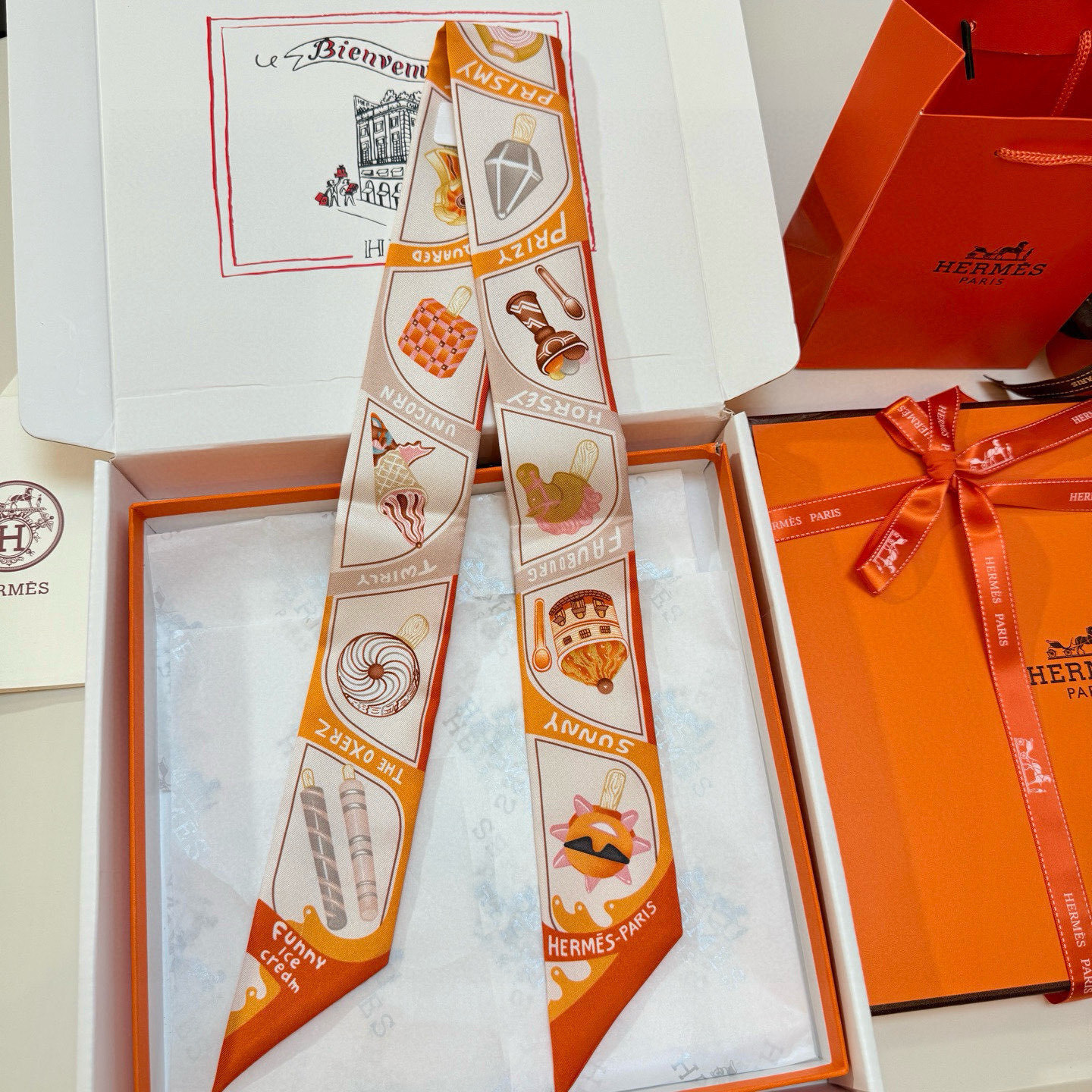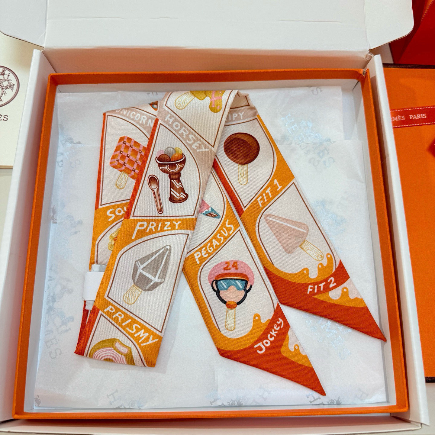 scarf Hermès Sunny Faubourg Twilly - Elevate your accessory game with the delightful Hermès Sunny Faubourg Twilly Scarf, a whimsical addition to any wardrobe. This silk scarf features a playful ice cream print, adding a touch of sweetness and charm to your everyday style. Crafted from luxurious silk, this Twilly scarf is not only visually appealing but also incredibly soft and comfortable to wear. The Hermès Sunny Faubourg Twilly Scarf is the perfect accessory to express your unique personality and add a touch of elegance to any outfit. Accessorize your handbag with this Hermès silk twilly. The Hermès Sunny Faubourg Twilly Scarf will turn heads.
