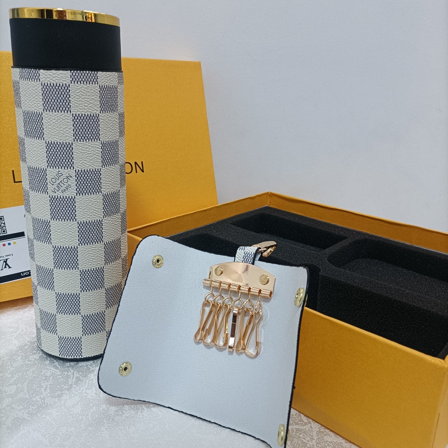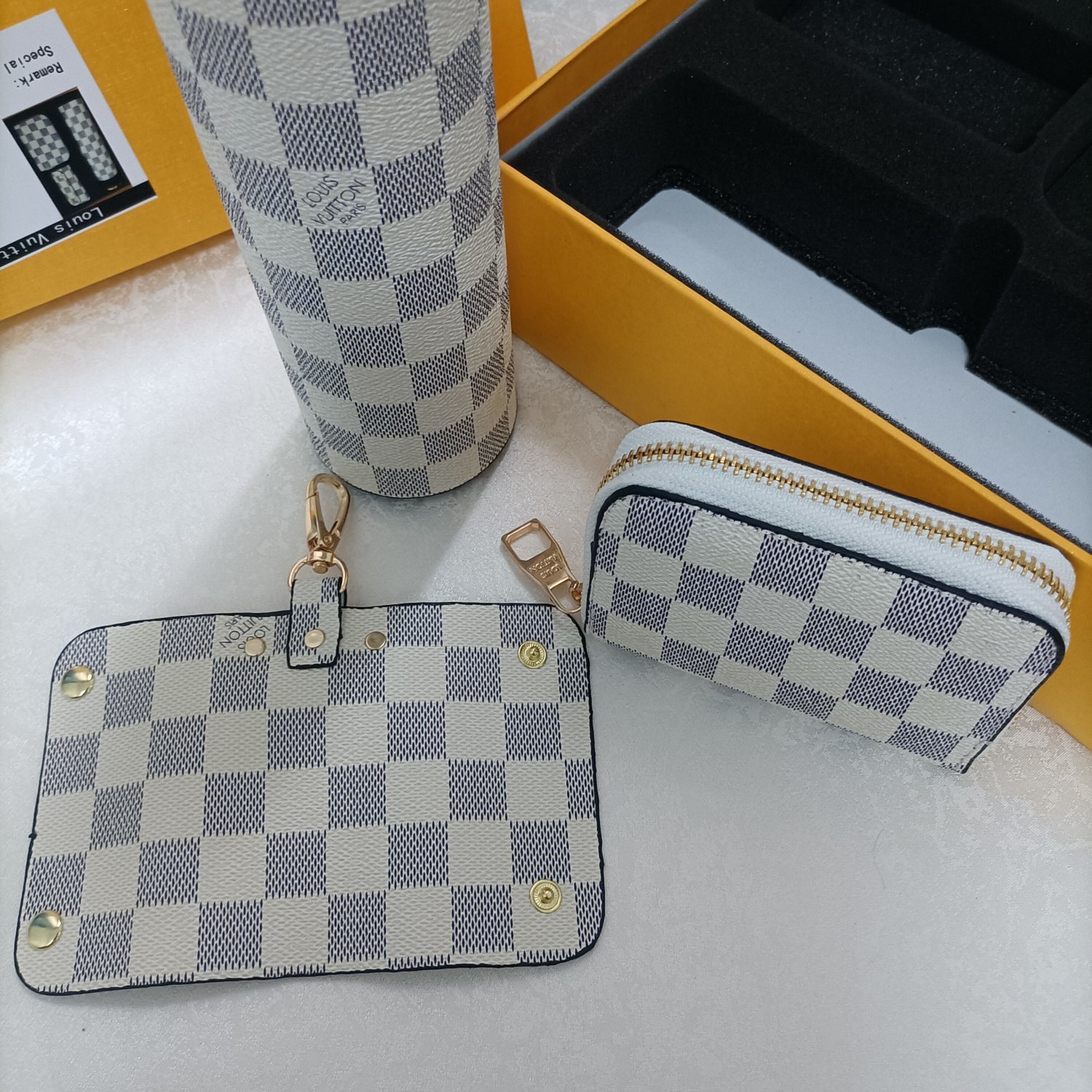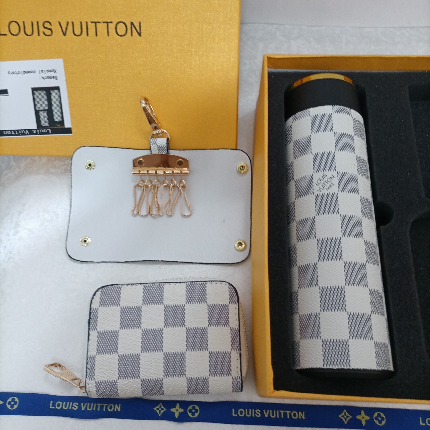 The durability and high-quality materials ensure that this set will withstand the test of time, providing you with years of enjoyment. The water bottle keeps your beverages at the perfect temperature, while the coin purse and key holder keep your essentials organized and easily accessible. By choosing the Louis Vuitton Damier Azur Bottle Set, you're investing in a piece of timeless elegance that will elevate your everyday routine. Check out our store collection for more luxury sets.