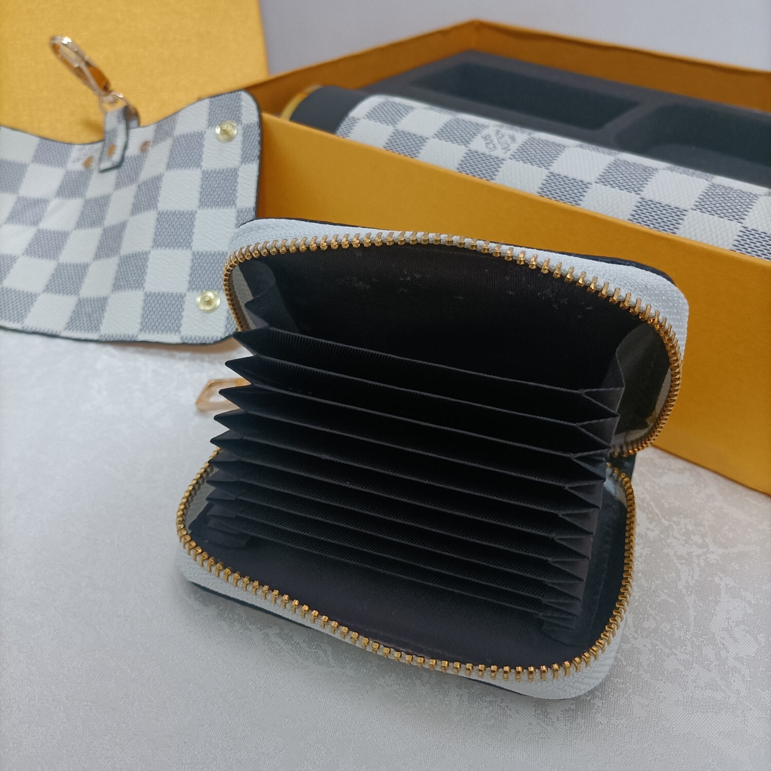The coin purse is perfectly sized to hold your essential cards, cash, and small accessories. Its compact design allows it to fit easily into your handbag or pocket, while the secure zip closure keeps your belongings safe. The key holder features multiple hooks for organizing your keys, preventing them from scratching your other items. Like the bottle, both accessories are adorned with the Damier Azur pattern, creating a cohesive and elegant ensemble.