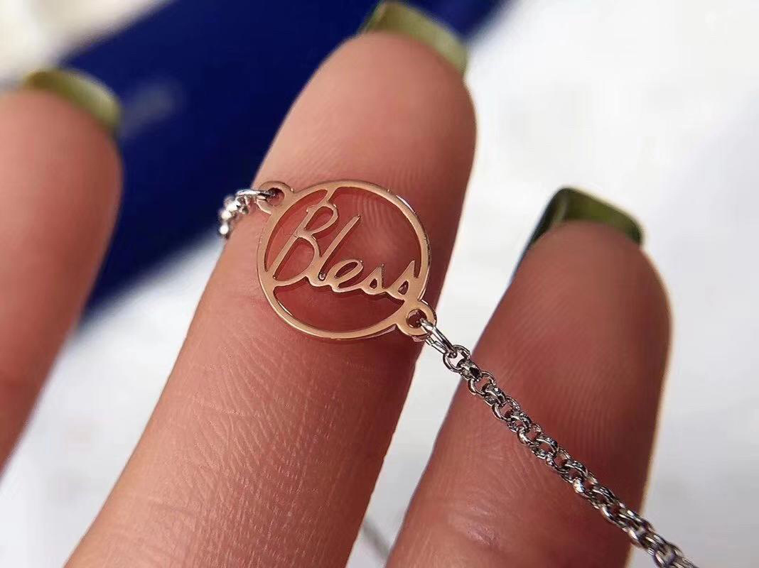 - Design: Features a variety of unique charms, including a polished sphere, a "Blessed" inscribed charm, and a delicate oval gemstone.