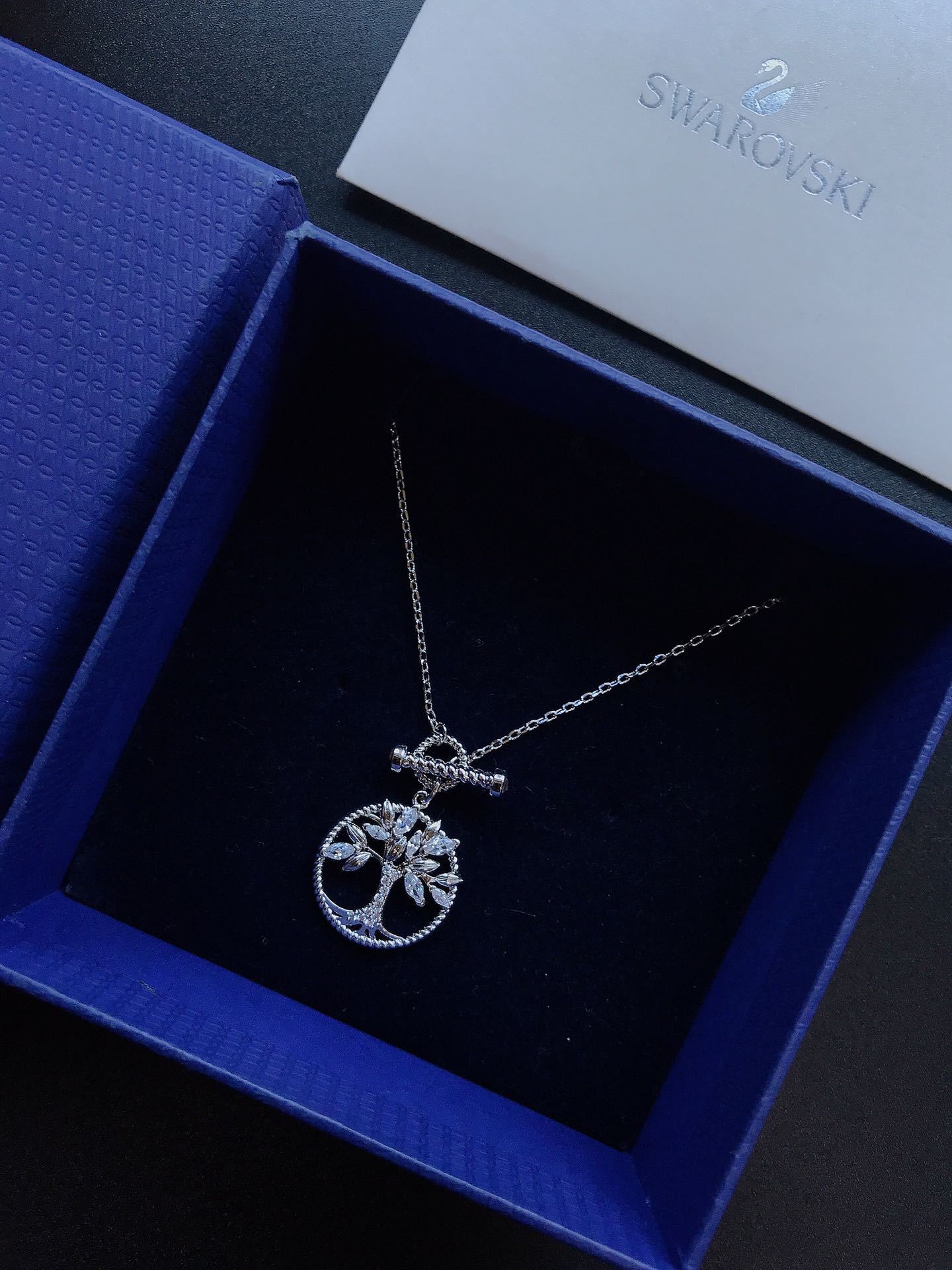 The tree branches and roots are adorned with shimmering crystals that catch the light beautifully. The crystals are strategically placed to maximize their sparkle, creating a dazzling effect that enhances the necklace's overall appeal. The crystals add a touch of glamour and sophistication to the piece, making it perfect for both casual and formal occasions.