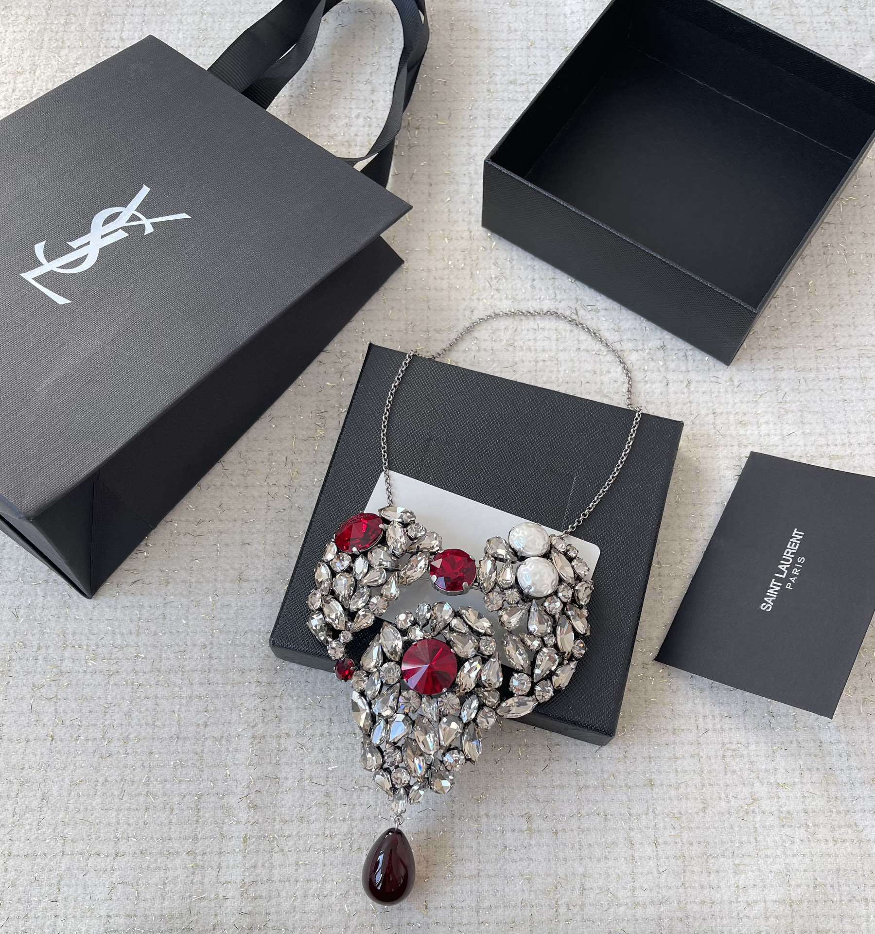 The necklace is crafted from high-quality materials, including sparkling red and clear crystals and a durable chain. The specific materials may vary depending on the design, but all components are carefully selected for their beauty and durability.
