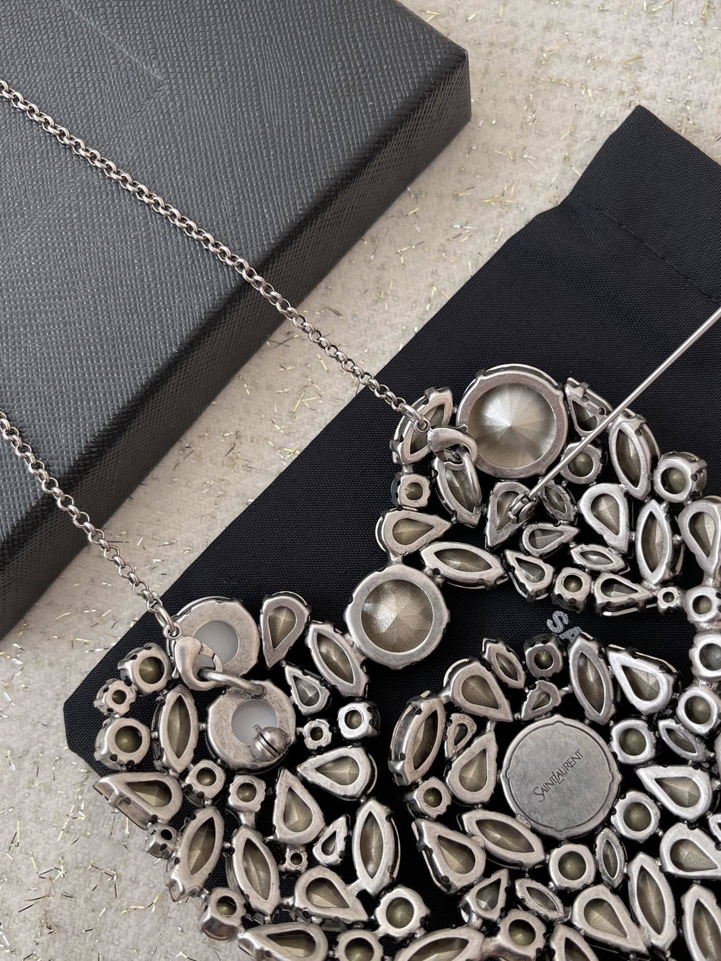The shimmering crystals are carefully arranged to create a mesmerizing pattern, enhancing the overall beauty of the pendant. The pendant's dimensions are perfectly balanced to make a statement without being overwhelming. The chain is designed for comfort and durability, ensuring that the necklace sits comfortably around your neck.