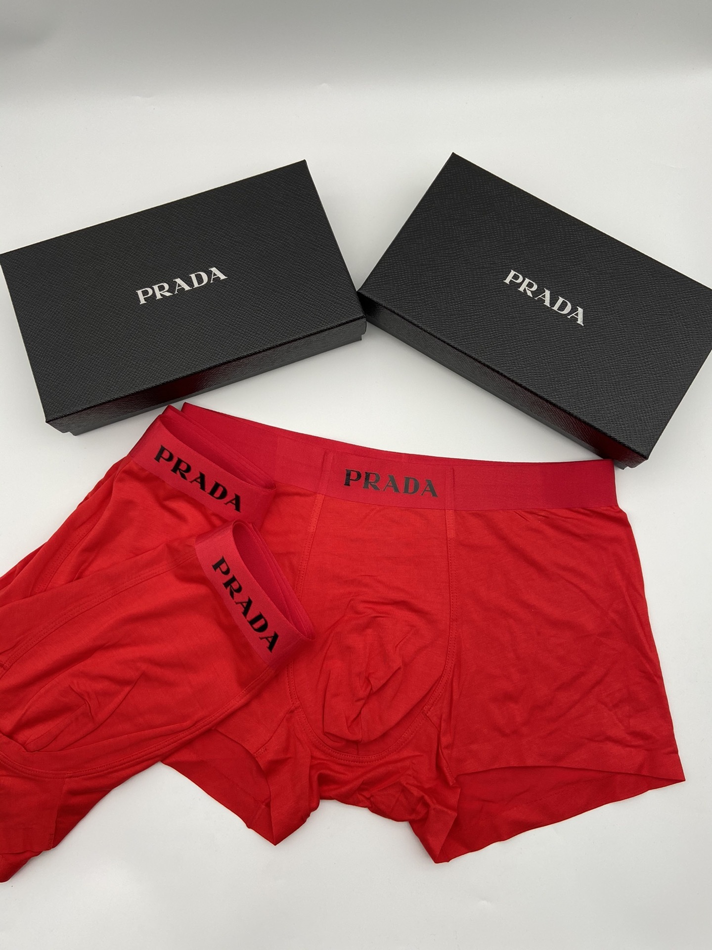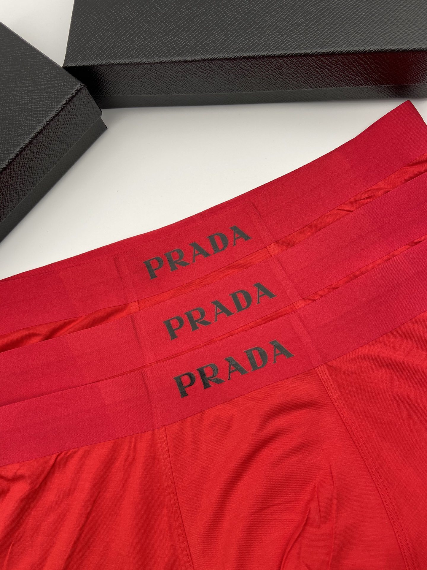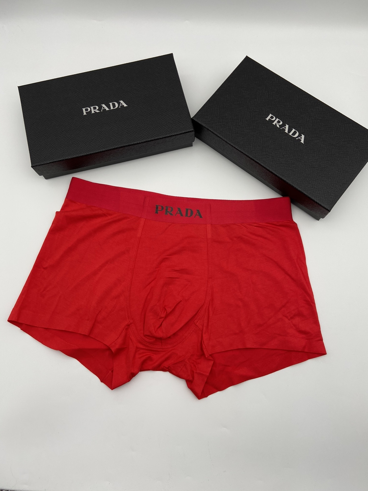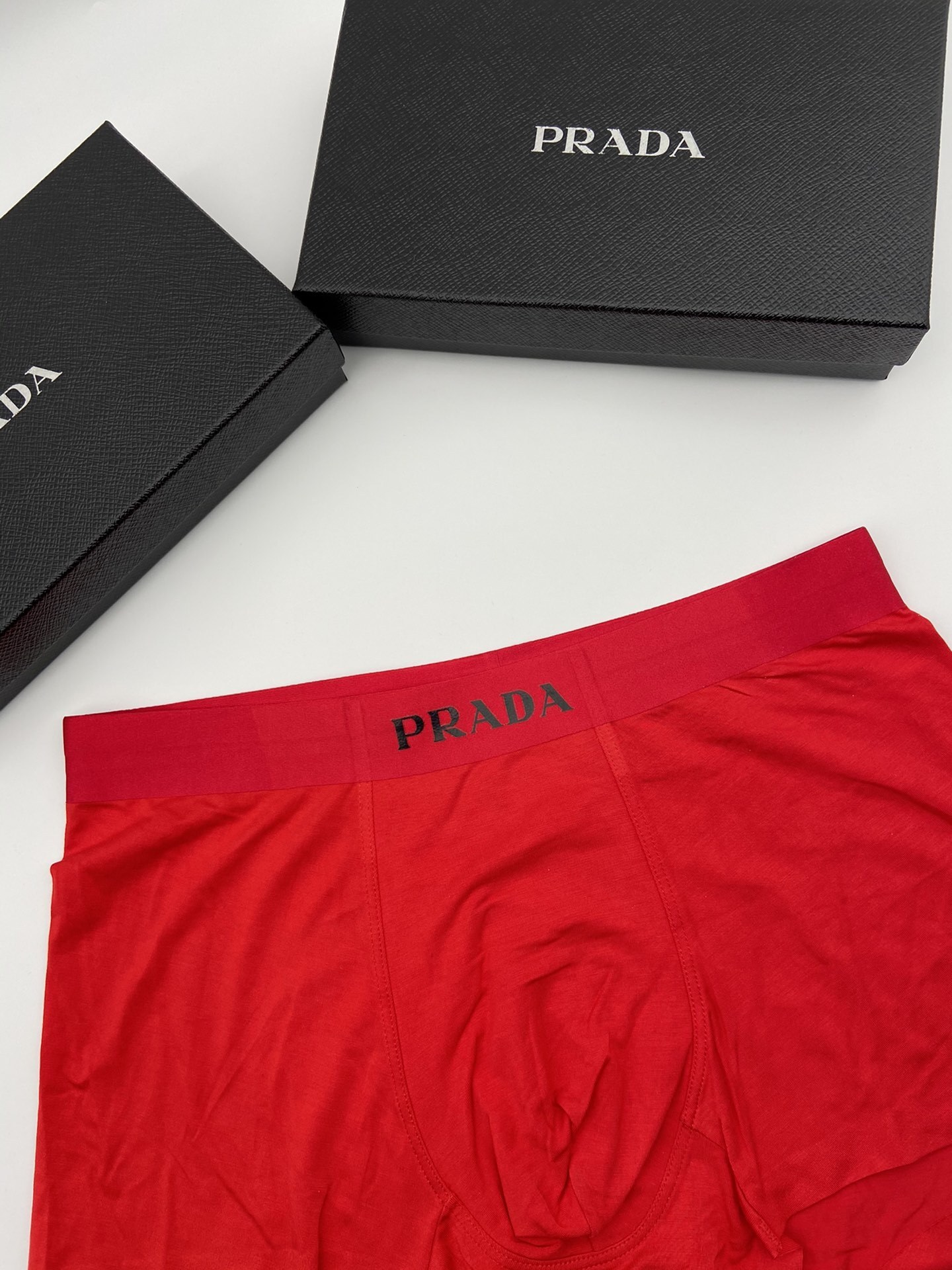 The vibrant red color adds a touch of boldness to your underwear collection, while the signature Prada logo on the waistband showcases your impeccable taste. Whether you're lounging at home or heading out for the day, these boxers ensure you feel confident and comfortable.