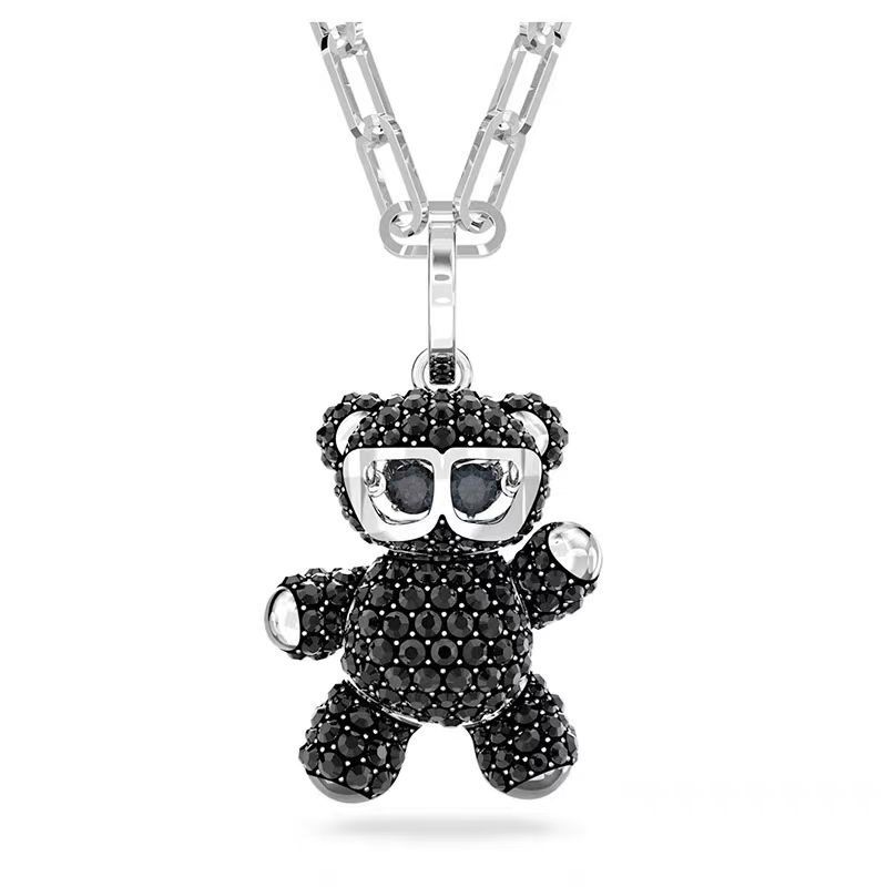 The Swarovski Black Crystal Teddy Bear Necklace boasts several distinctive features that set it apart. First and foremost, the pendant is adorned with genuine Swarovski crystals, known for their exceptional clarity and brilliance. These crystals are carefully set to maximize their sparkle, creating a dazzling effect that is sure to turn heads. The black color of the crystals adds a touch of mystery and sophistication to the design.