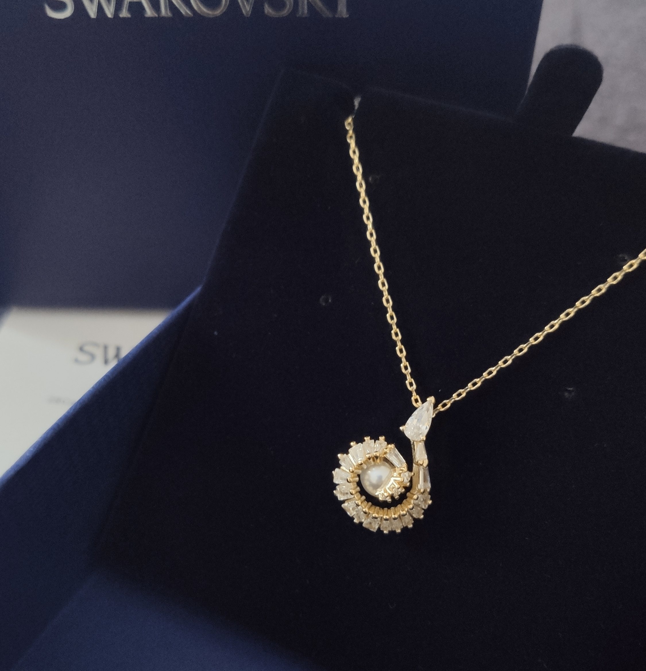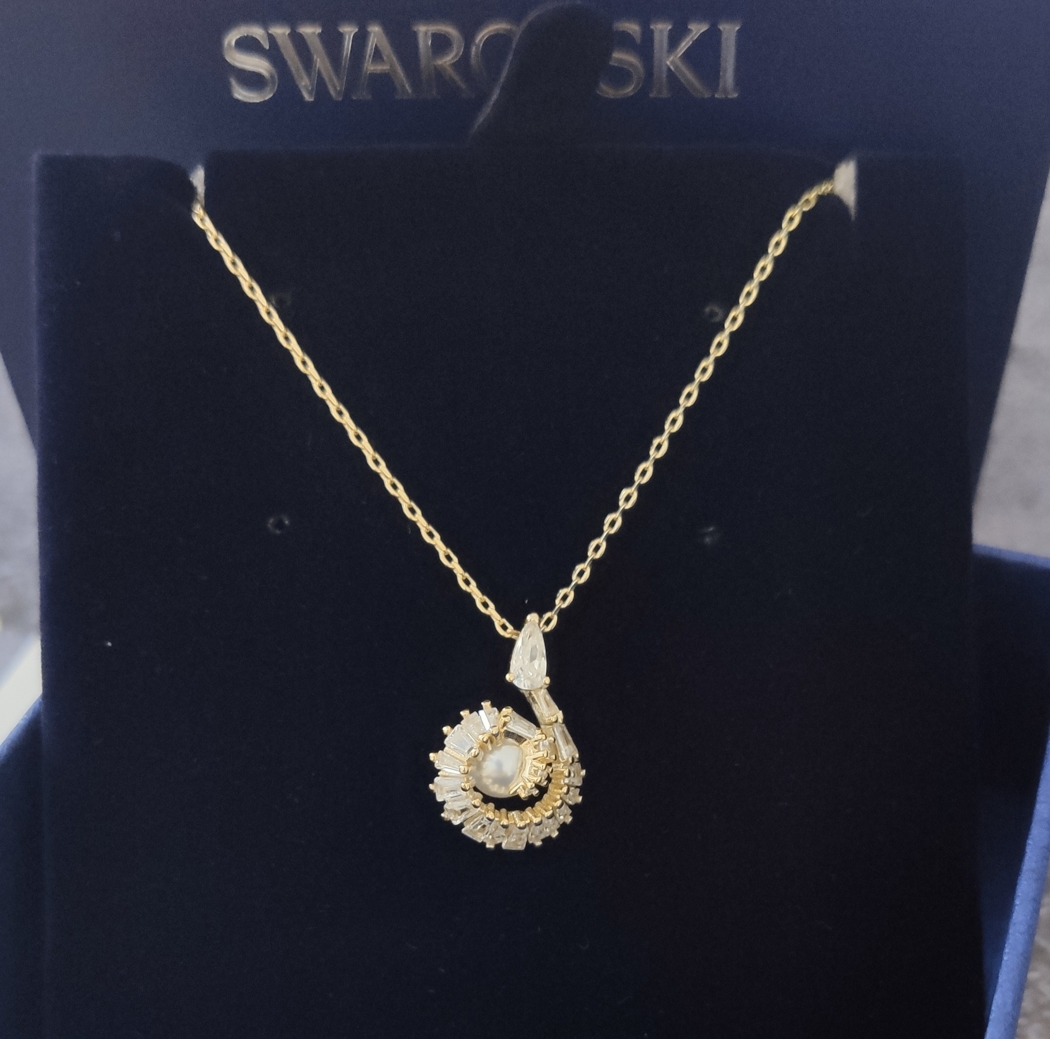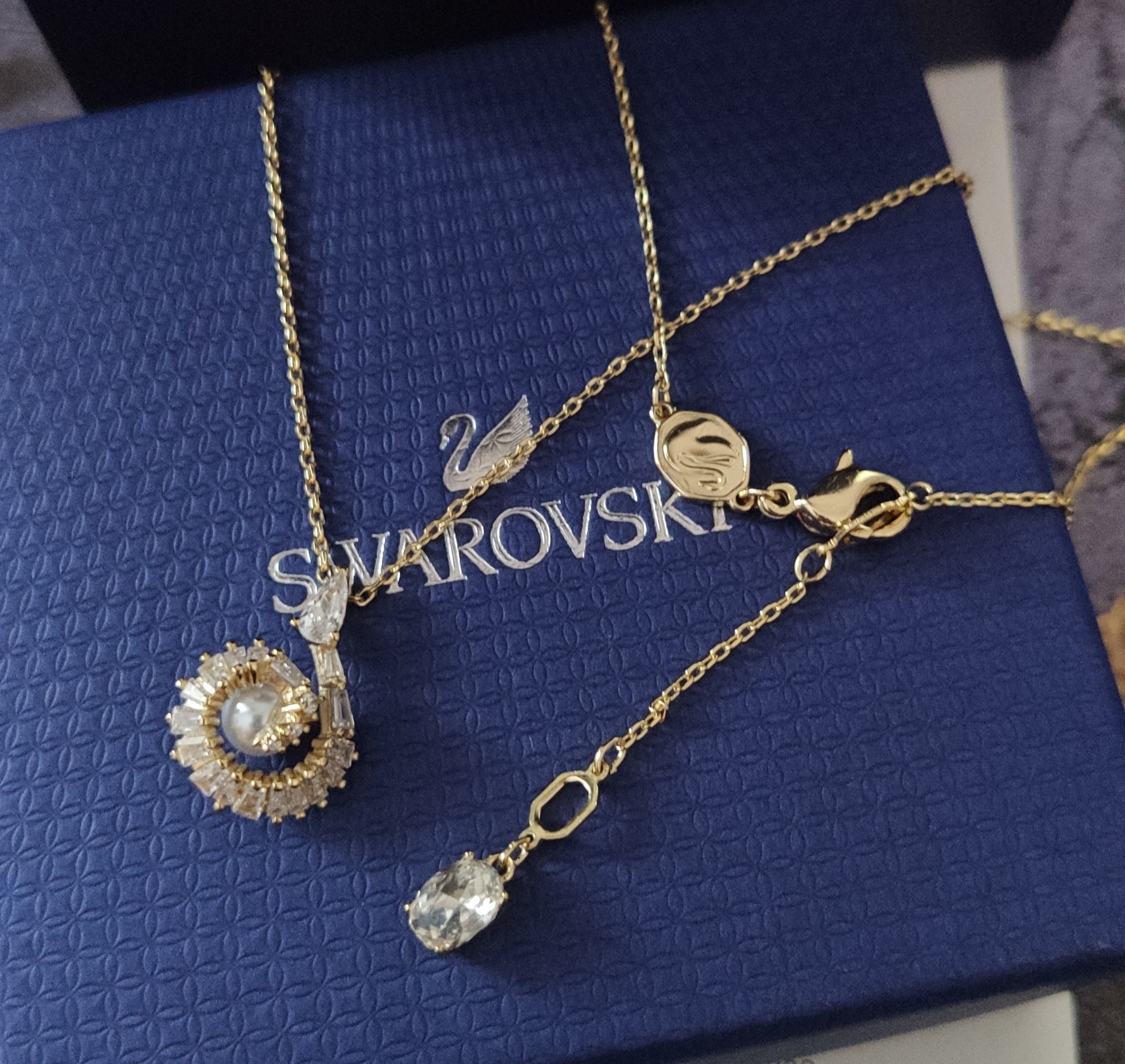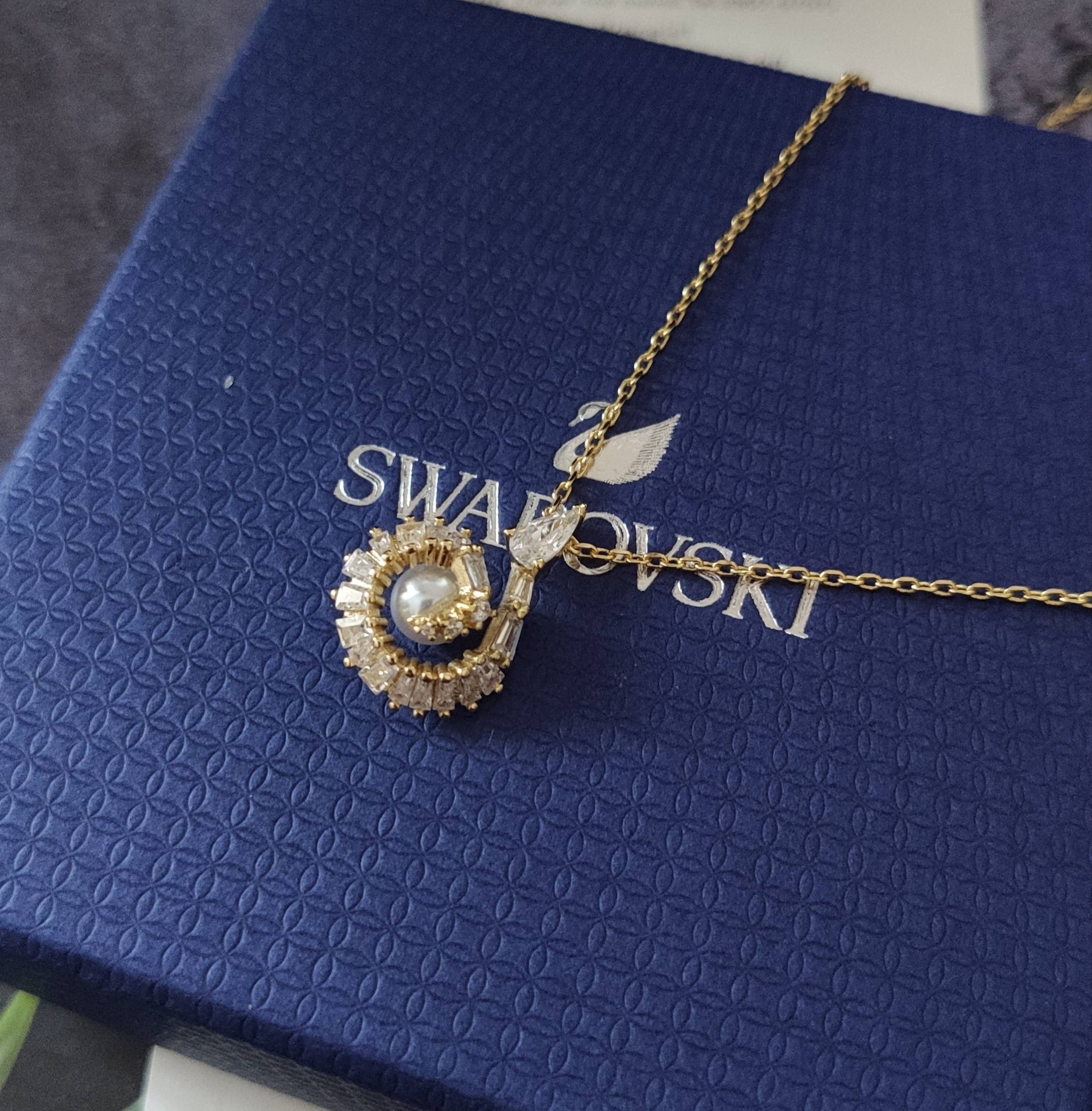 The pendant hangs gracefully from a delicate chain, designed to complement the overall aesthetic without overpowering the main focal point. The chain is adjustable, allowing you to customize the length to suit your neckline and outfit. The secure clasp ensures that the necklace stays in place, providing peace of mind while you wear it. The Swarovski Gold Pearl Teardrop Pendant Necklace is a perfect blend of classic elegance and modern design, making it a versatile addition to any jewelry collection.