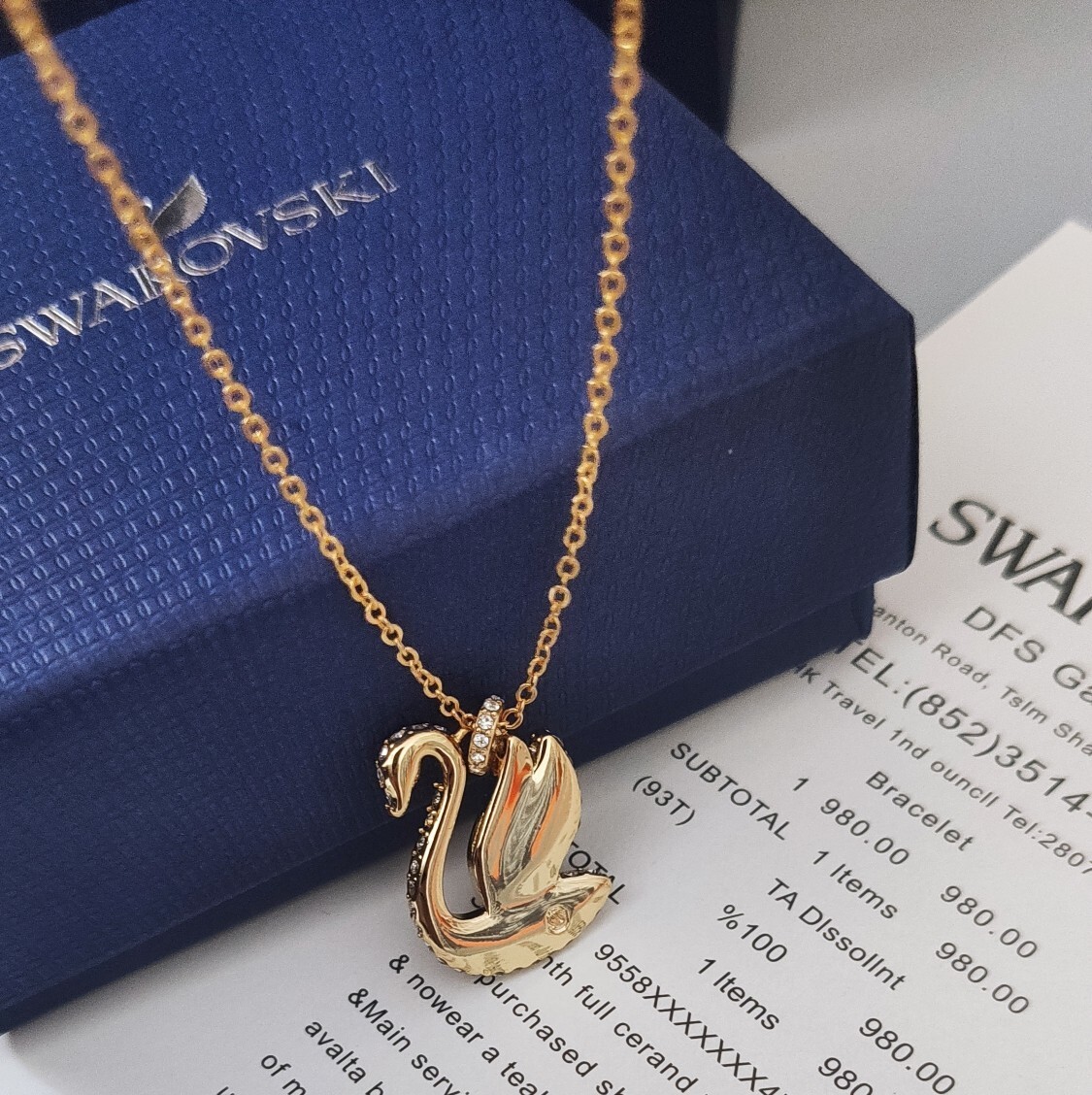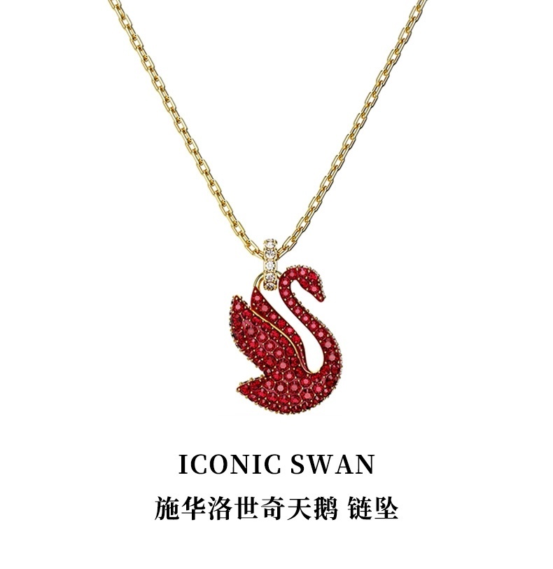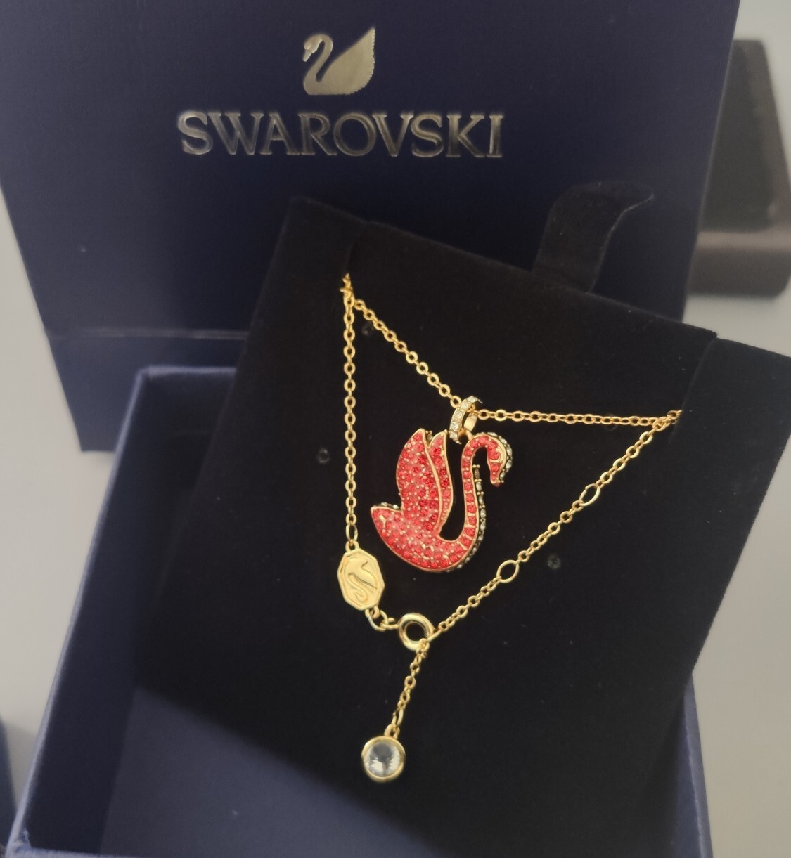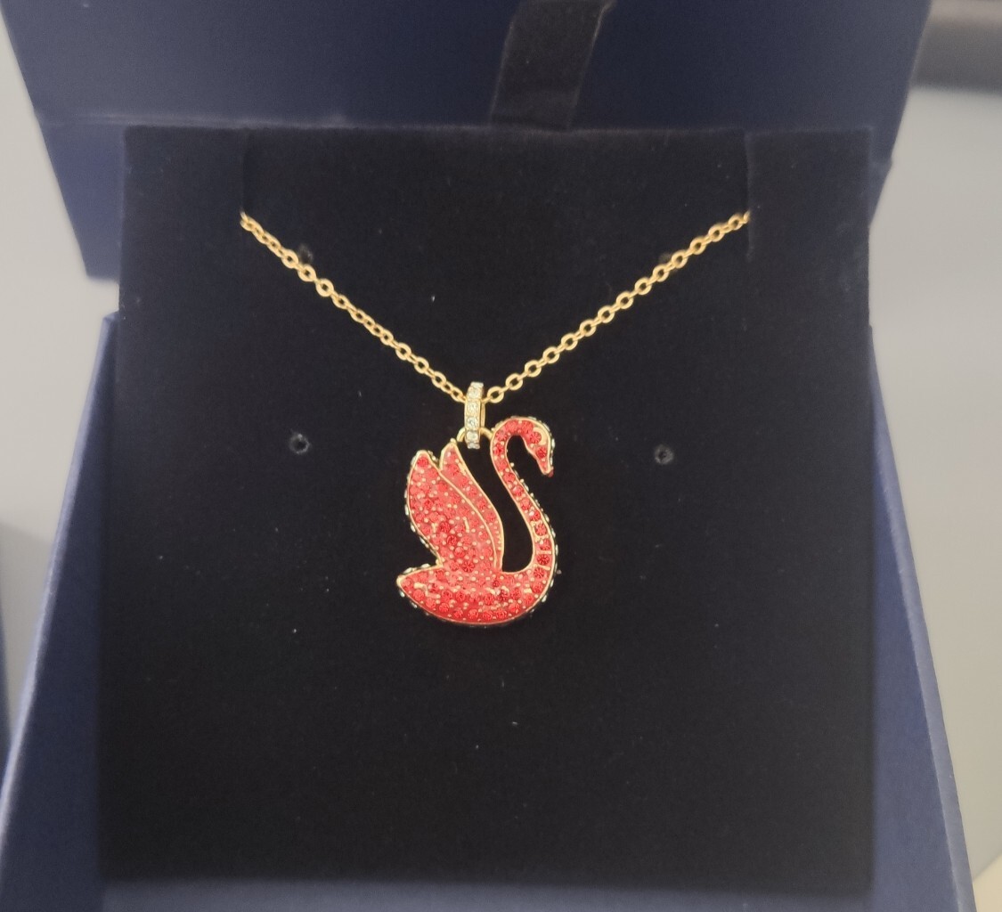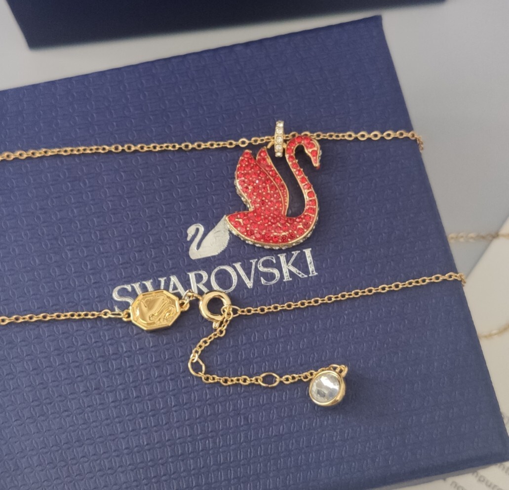 The Swarovski Gold Red Swan Pendant boasts several distinctive features that set it apart from other necklaces. The pendant itself is meticulously crafted in the shape of a swan, a symbol of grace and beauty. The swan's body is encrusted with numerous red crystals, each precisely cut to catch the light and create a mesmerizing sparkle. The gold-tone finish of the pendant and chain adds a touch of luxury and warmth, making it a versatile accessory that complements a wide range of skin tones and outfits. The necklace’s design ensures it sits comfortably and elegantly around the neck.