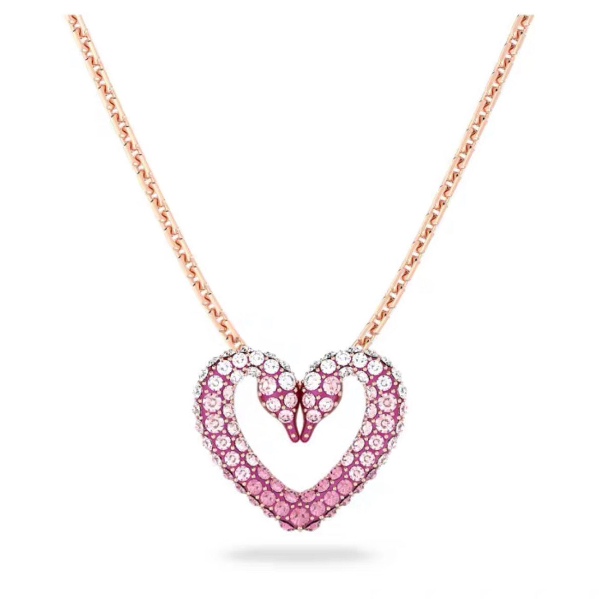 The Swarovski Pink Crystal Heart Necklace boasts several outstanding features that set it apart. The heart pendant is intricately designed with a captivating openwork pattern, encrusted with numerous sparkling pink crystals. This meticulous detailing ensures that the necklace catches the light from every angle, creating a mesmerizing shimmer. The rose gold plated chain adds a touch of warmth and luxury, making the necklace a versatile accessory that complements various skin tones and outfits.