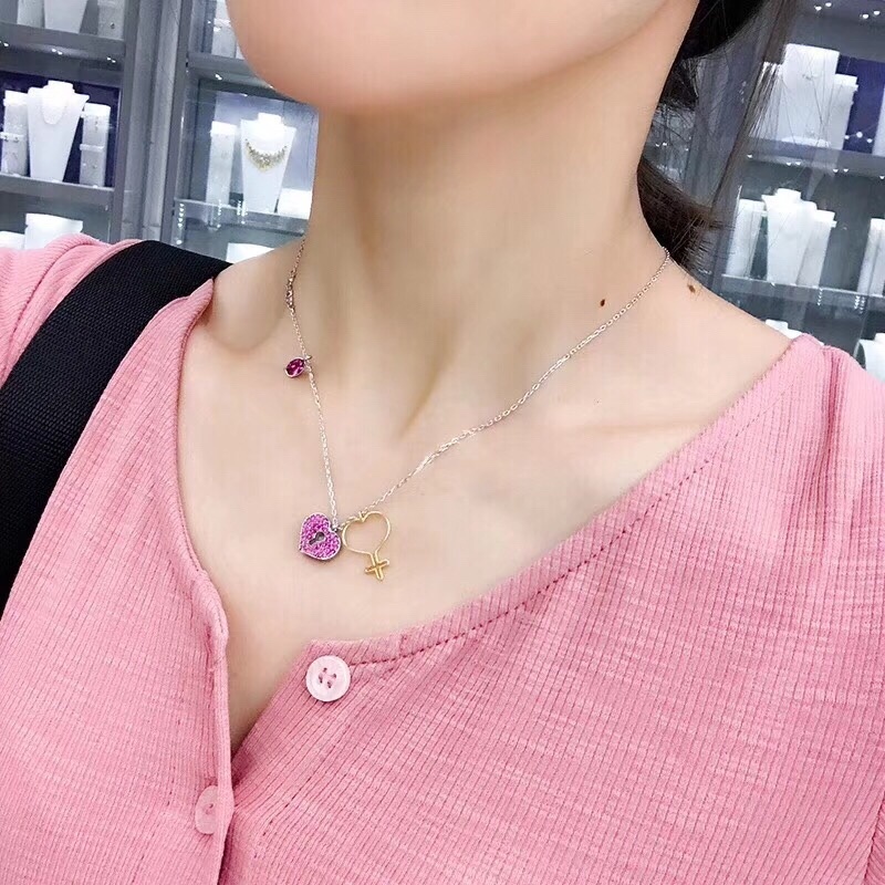 The Swarovski Pink Heart Lock Necklace stands out with its meticulous craftsmanship. The chain is made of high-quality silver, ensuring durability and a lasting shine. The heart-shaped lock pendant is encrusted with genuine Swarovski crystals, known for their exceptional brilliance and clarity. The pink hue of the crystals adds a playful touch, making it a versatile piece that can be paired with a variety of outfits. The additional charm with a unique symbol enhances the necklace's overall appeal. Each component is carefully assembled to create a piece that is both visually stunning and structurally sound.