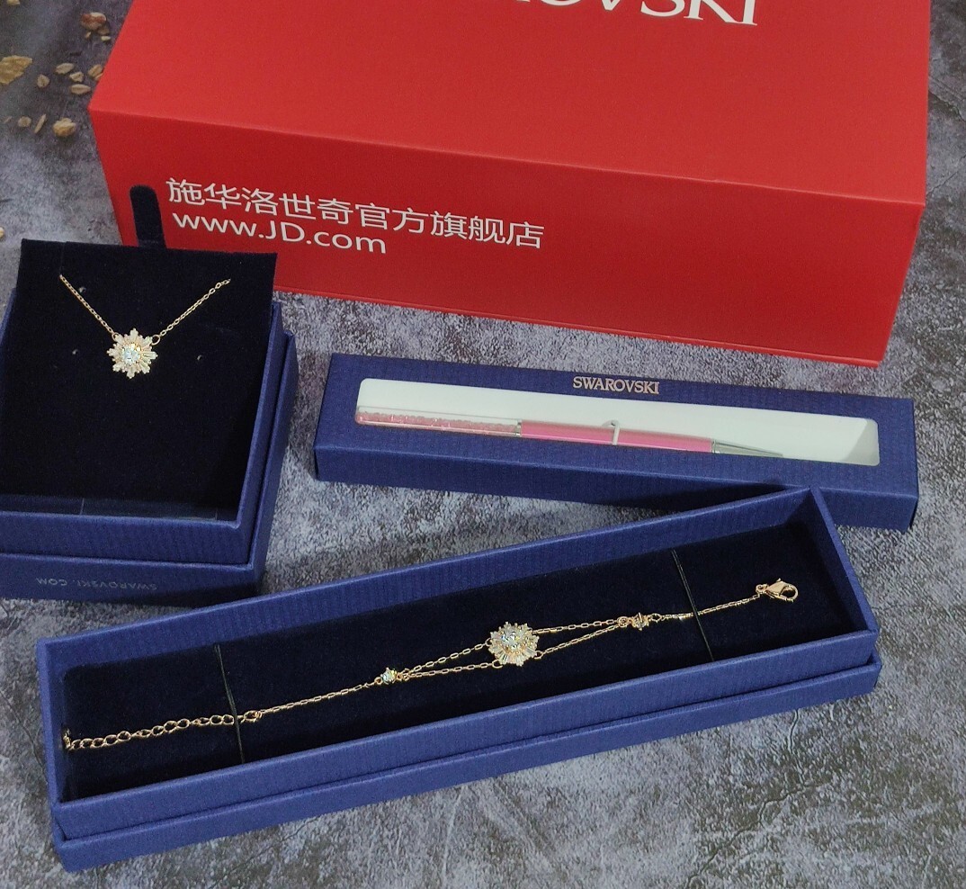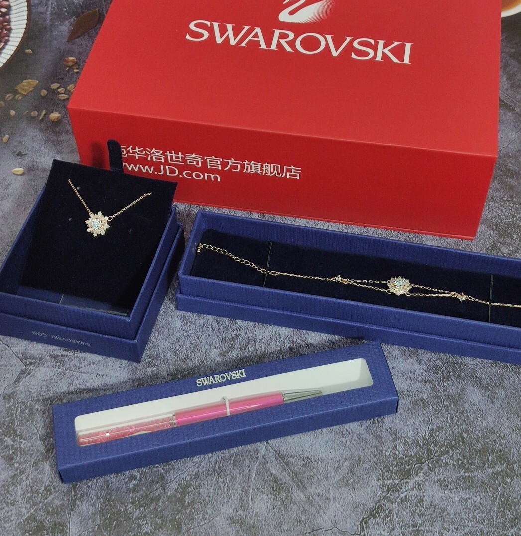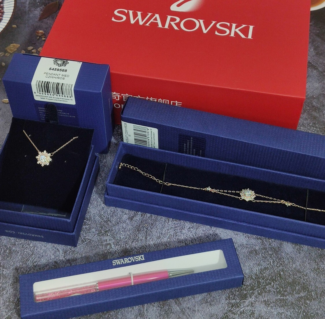 The Swarovski pen included in the **Swarovski Red Gift Set** is designed for smooth and effortless writing. Its sleek design and comfortable grip make it a pleasure to use, whether for everyday tasks or special occasions. The pen is adorned with sparkling Swarovski crystals, adding a touch of glamour and sophistication to your writing experience. The jewelry box is crafted with high-quality materials and features a soft interior lining to protect your precious jewelry from scratches and damage. Its compact size makes it perfect for travel or home use, ensuring your jewelry stays safe and organized wherever you go.