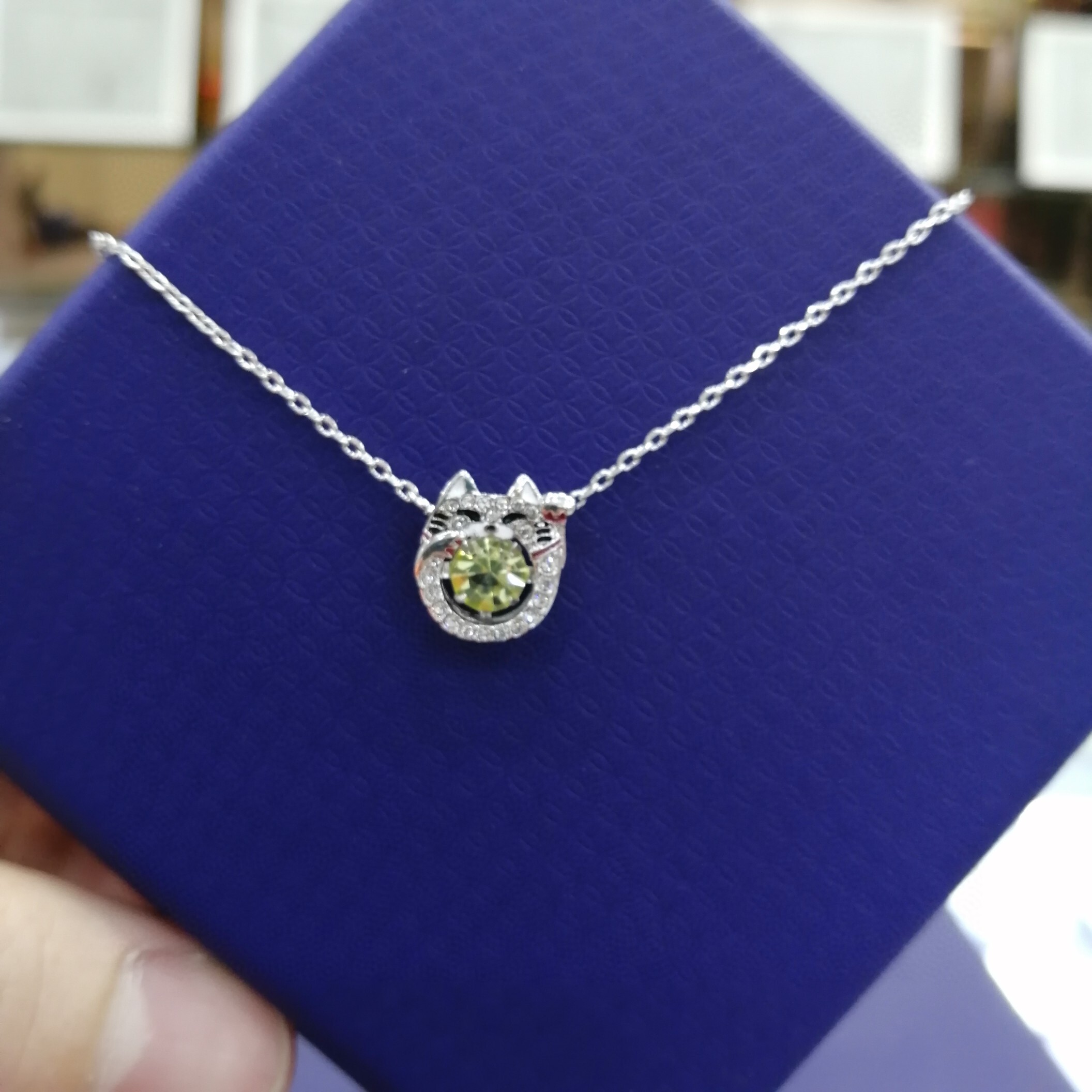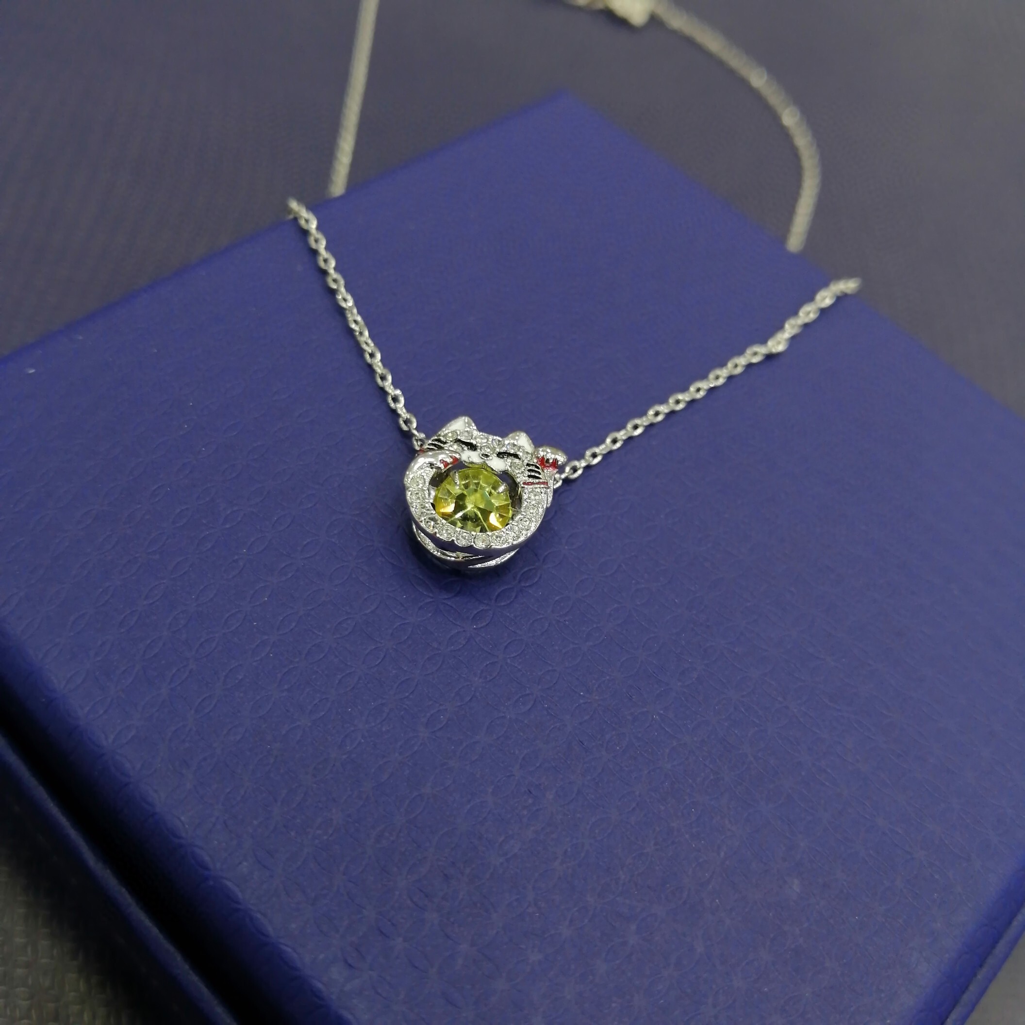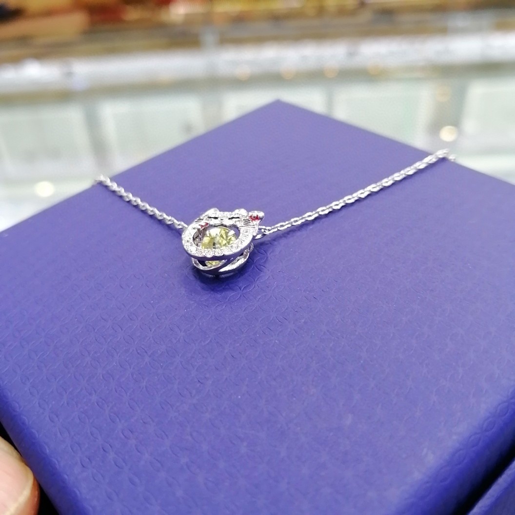 - Vibrant Green Crystal: The kitty pendant is adorned with a stunning green crystal that adds a pop of color and sparkle. The crystal is meticulously cut to maximize its brilliance and create a captivating visual effect.