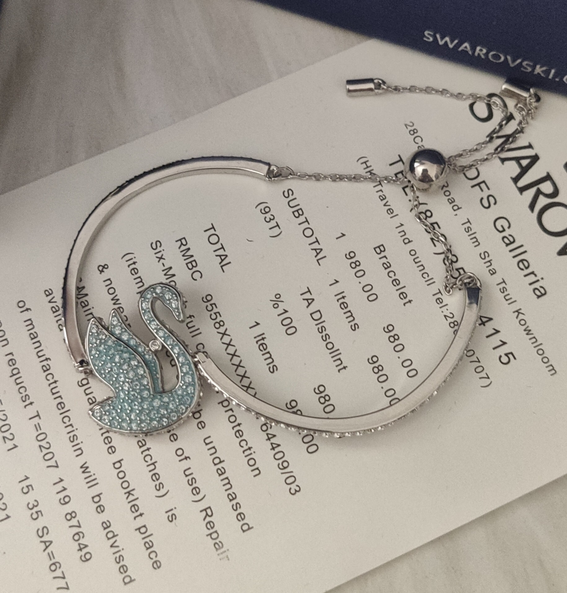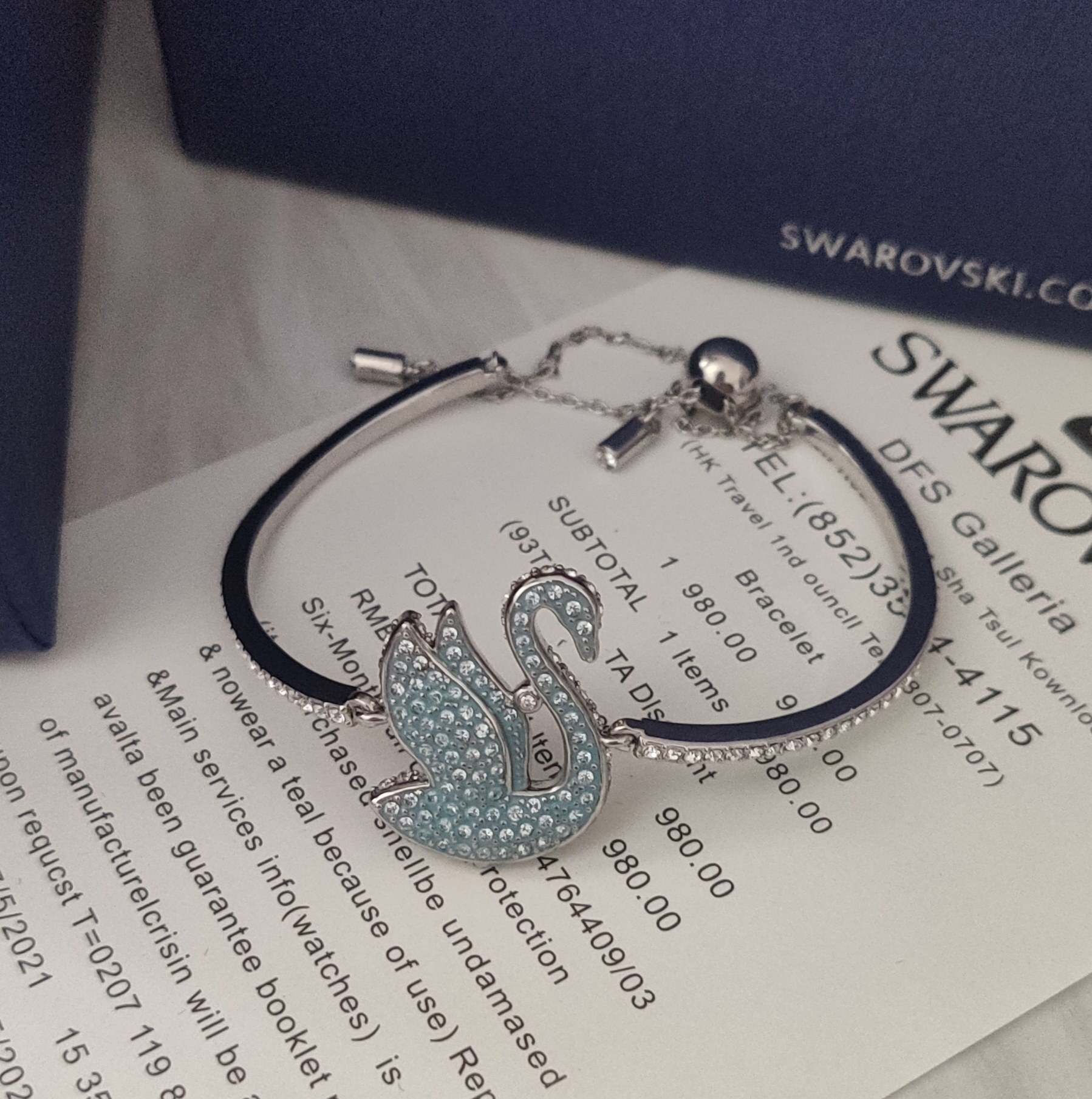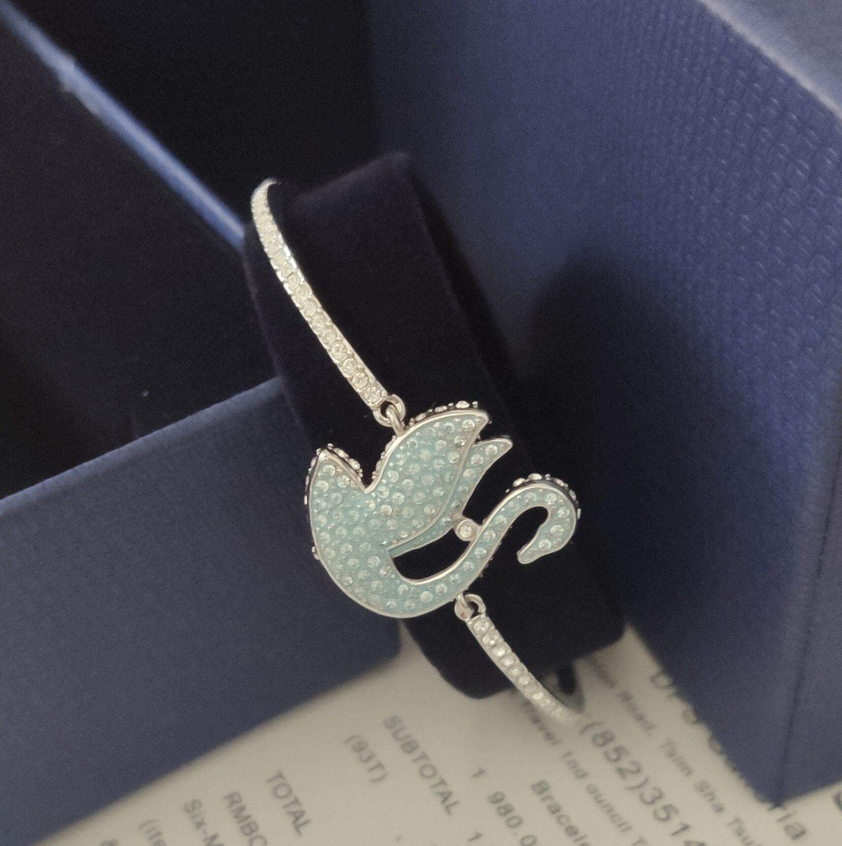 To maintain the brilliance of your Swarovski Swan Bangle, avoid contact with harsh chemicals, perfumes, and lotions. Clean gently with a soft cloth and store in a jewelry box or pouch when not in use.