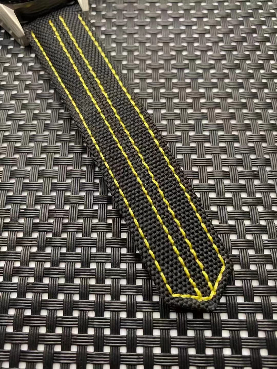 A: The strap is made of durable black nylon with yellow stitching, providing a sporty and comfortable fit.
