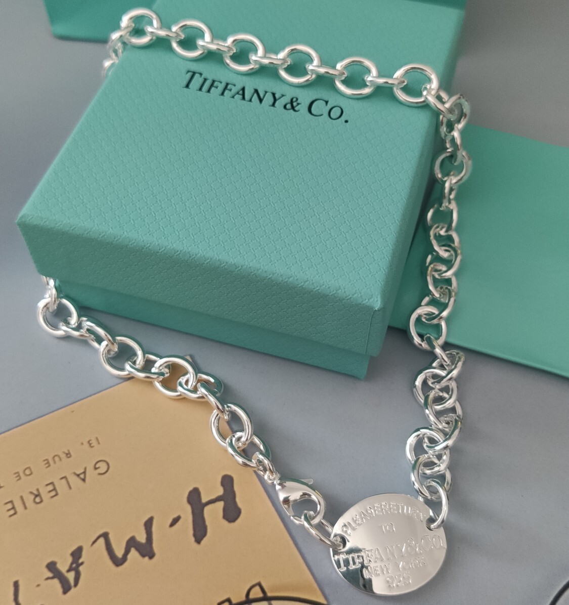 Tiffany Silver Tag Chain Necklace - The Tiffany Silver Round Tag Chain Necklace is a timeless piece of jewelry that embodies elegance and sophistication. Crafted from high-quality sterling silver, this necklace features a delicate chain adorned with a signature round tag pendant. The iconic design and impeccable craftsmanship make it a perfect accessory for any occasion, adding a touch of luxury to your everyday style. The Tiffany Silver Round Tag Chain Necklace is more than just an accessory; it's a statement of enduring style and refined taste. Its versatility allows it to be worn alone for a subtle, chic look, or layered with other necklaces to create a personalized and trendy ensemble. This necklace is the perfect addition to your jewelry collection.