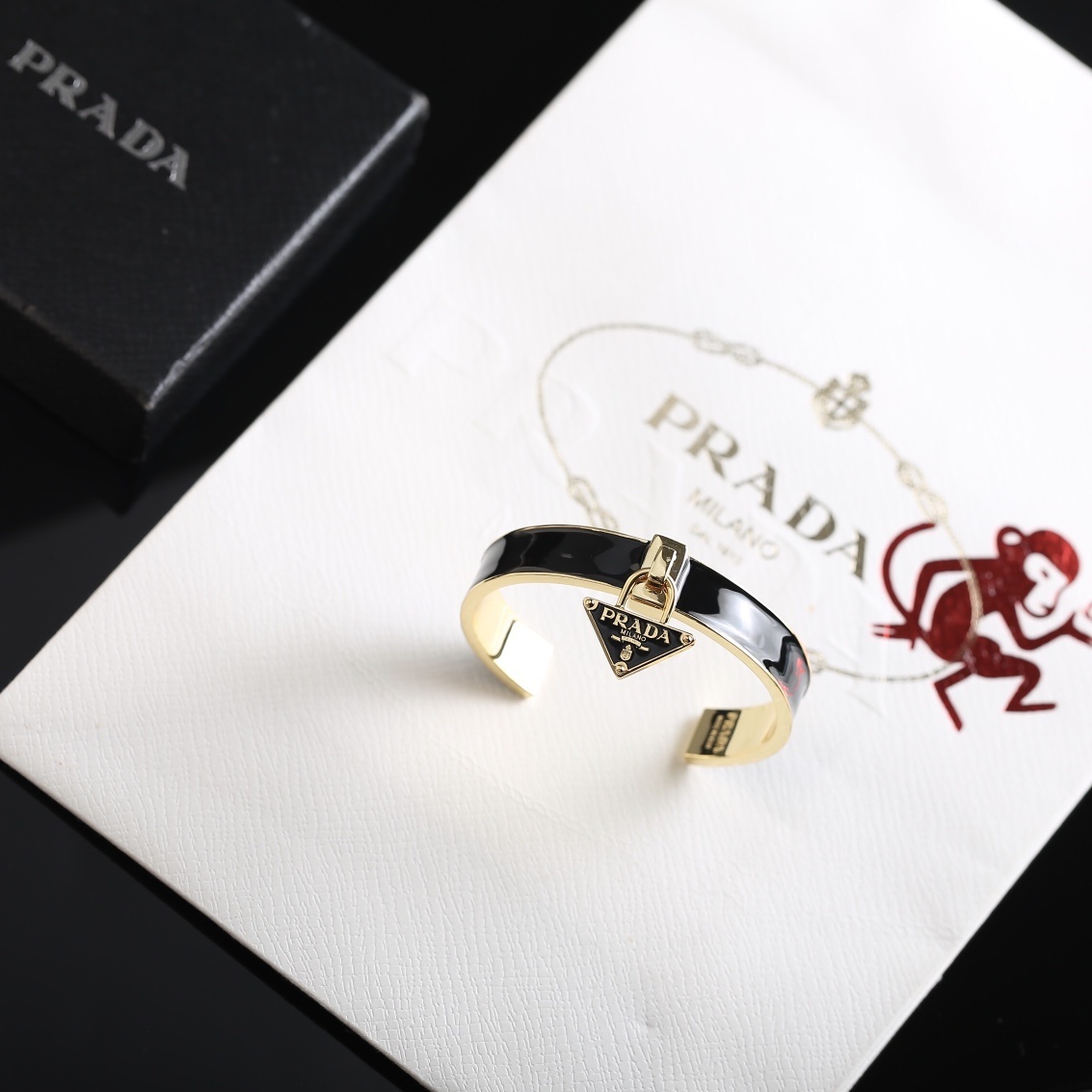 Furthermore, the Prada Black Enamel Triangle Logo Bracelet makes a thoughtful and memorable gift. Whether you're celebrating a birthday, anniversary, or special occasion, this bracelet is sure to impress. It's a gift that will be cherished and worn with pride for years to come. You can find more stunning pieces like this in our store collection.
