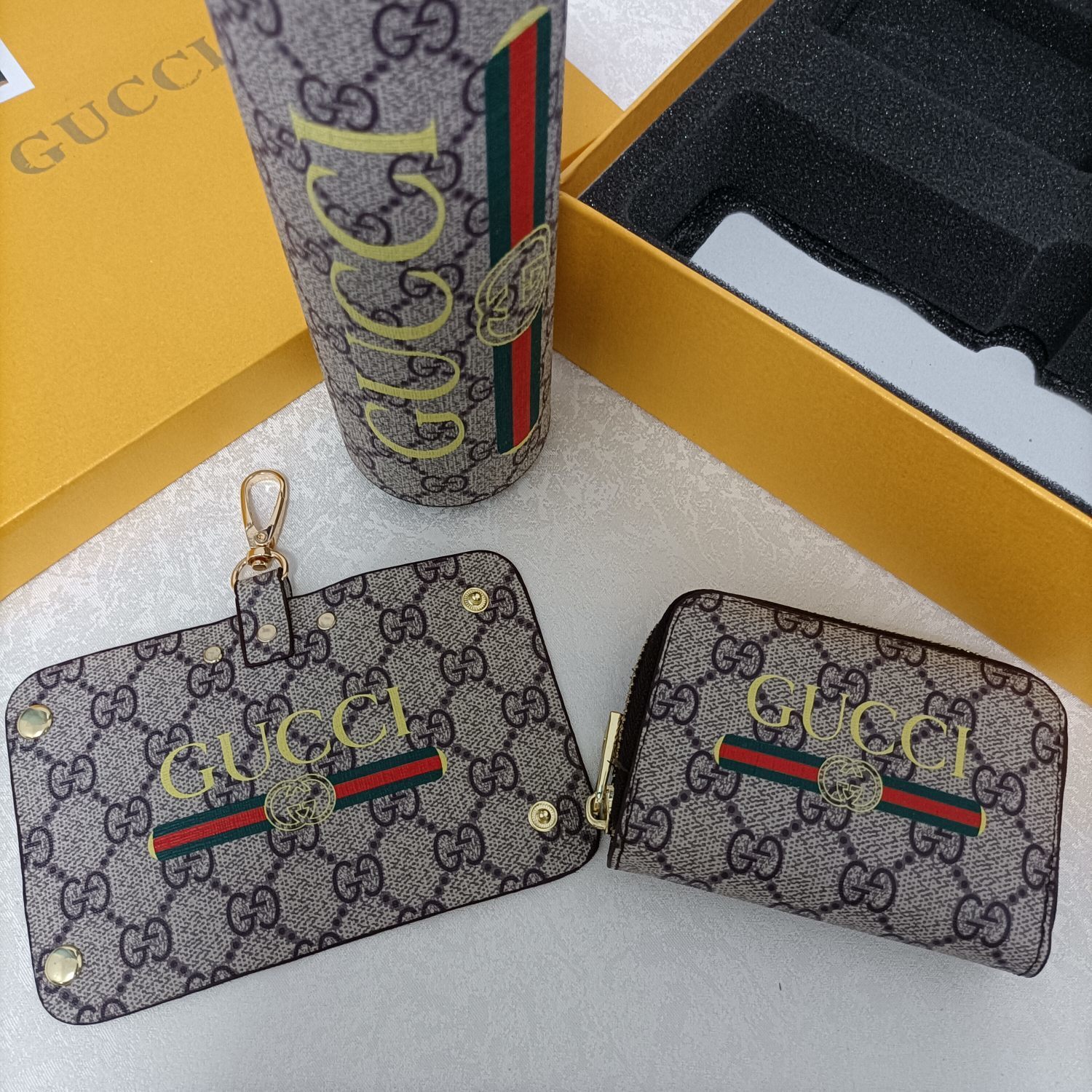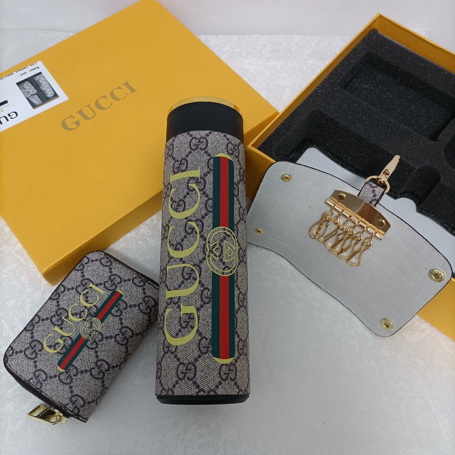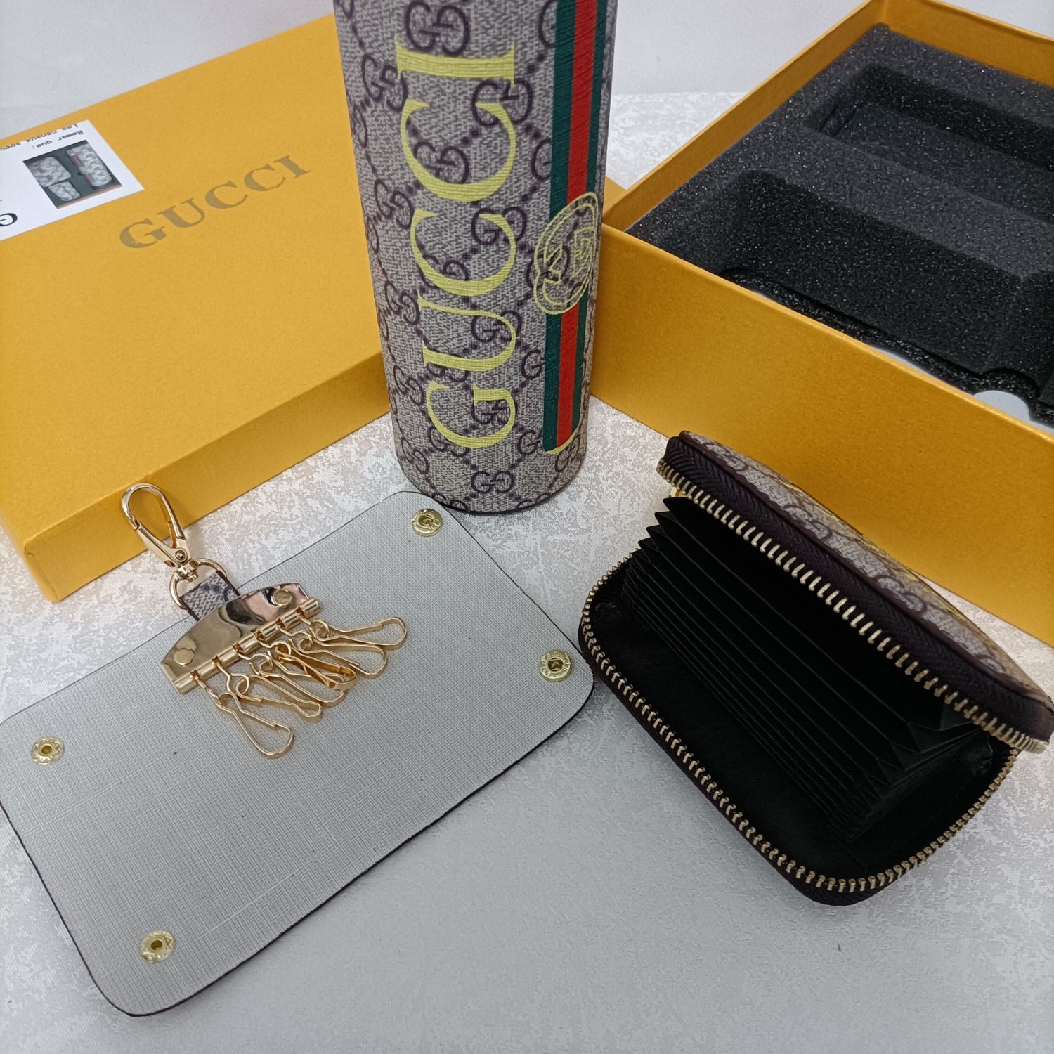 tumbler Gucci GG Supreme Gift Set - The Gucci GG Supreme Gift Set is the epitome of luxury and practicality, featuring a stylish tumbler, a compact wallet, and a chic keychain. Each piece is adorned with the iconic GG Supreme pattern, a symbol of Gucci's timeless elegance and superior craftsmanship. This set is perfect for those who appreciate the finer things in life and seek to add a touch of sophistication to their everyday essentials. The Gucci GG Supreme Gift Set is not just a collection of items; it's a statement of style and a testament to impeccable taste.