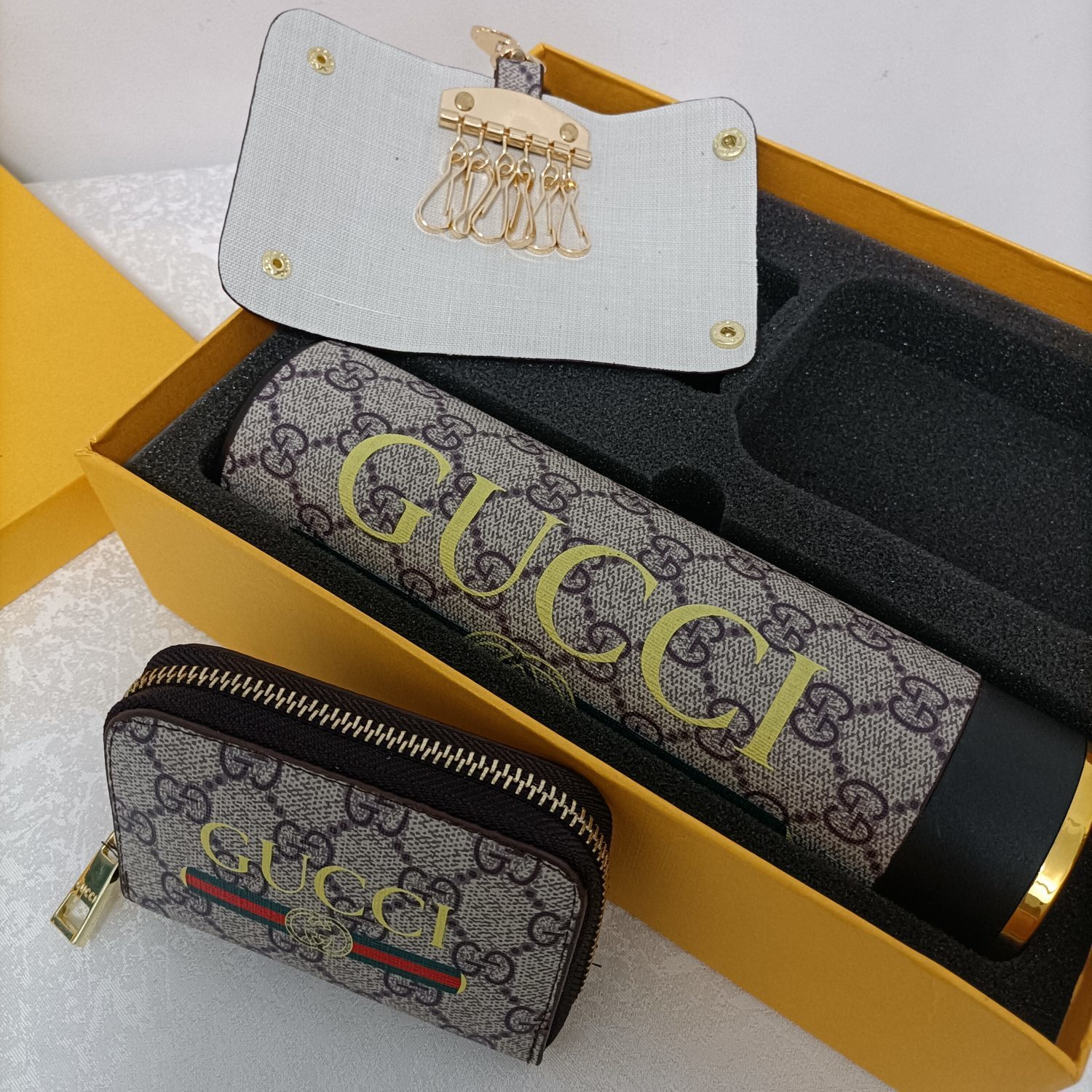 In addition to its stylish design, the Gucci GG Supreme Gift Set is also incredibly practical and functional. The tumbler keeps your beverages at the ideal temperature, the wallet holds your essential cards and cash, and the keychain keeps your keys organized and accessible. This set is designed to enhance your daily routine and make your life easier.
