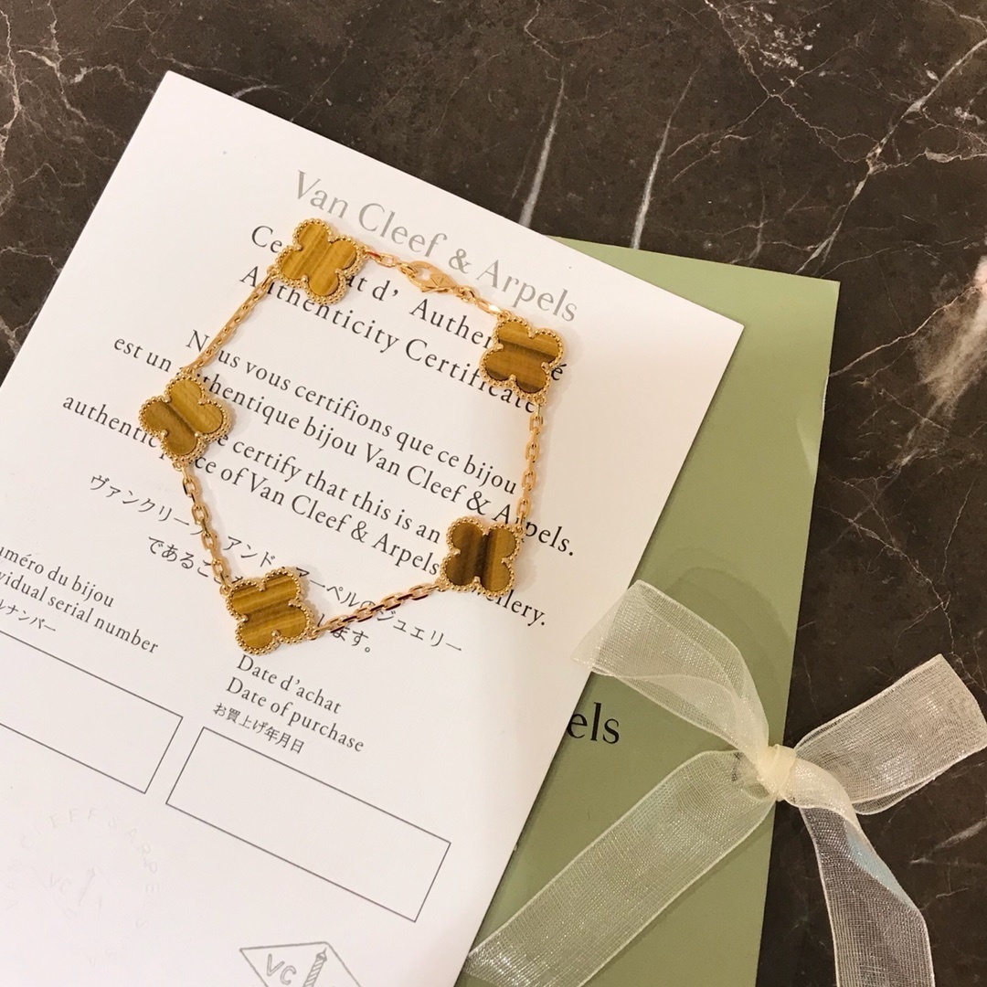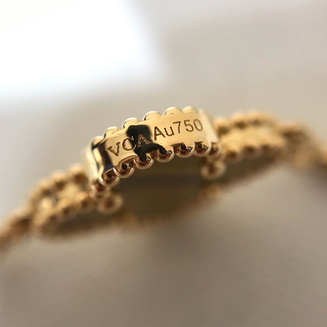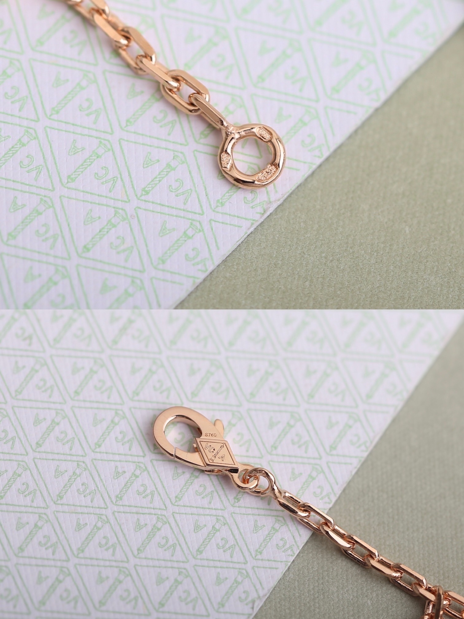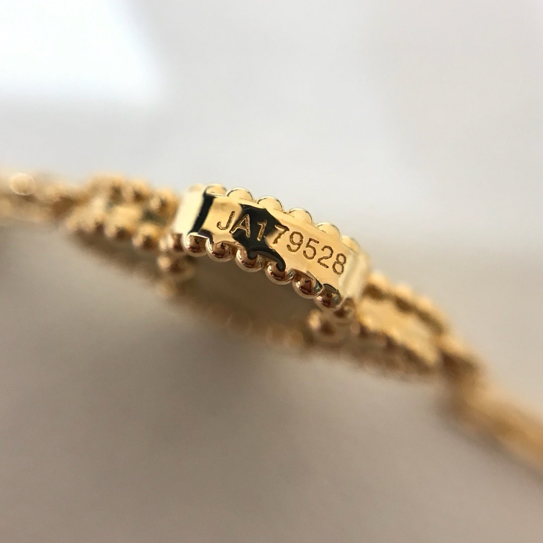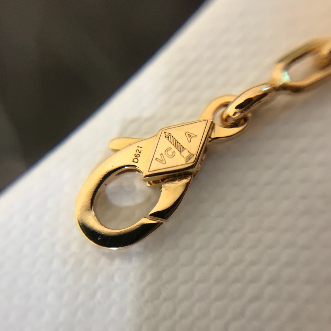 To maintain the brilliance of your Van Cleef & Arpels bracelet, gently clean it with a soft cloth after each wear. Avoid exposing it to harsh chemicals, extreme temperatures, or abrasive surfaces. Store it in its original box or a soft pouch to prevent scratches.