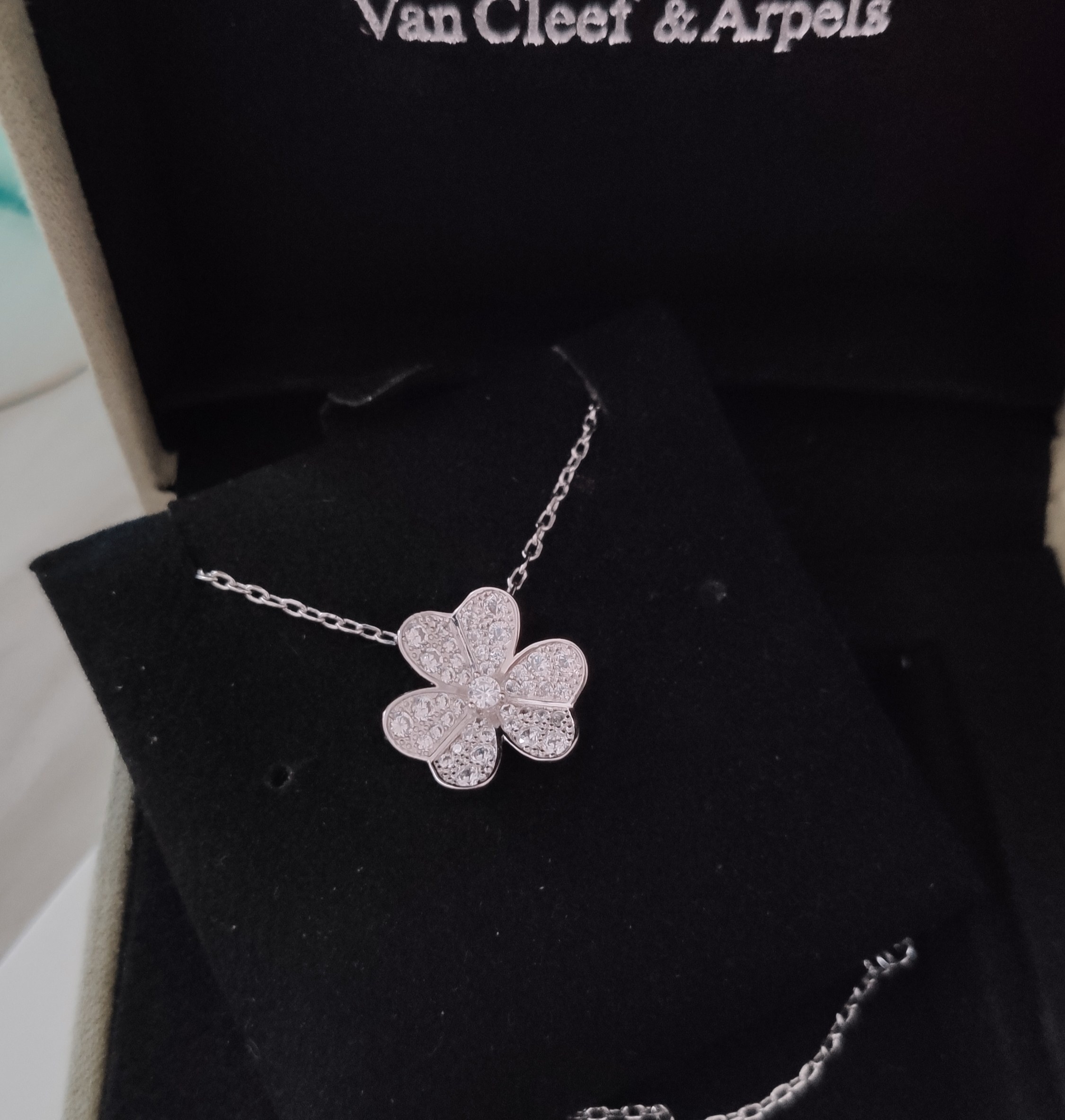 When not wearing the necklace, store it in a soft pouch or jewelry box to protect it from scratches and dust. Clean the necklace regularly with a soft, dry cloth to remove any dirt or oils. For more thorough cleaning, you can use a mild jewelry cleaner specifically designed for silver and diamonds. Avoid using abrasive cleaners or brushes, as these can scratch the surface of the silver. Maintaining your Van Cleef Arpels Silver Diamond Clover Pendant Necklace will keep it looking its best.