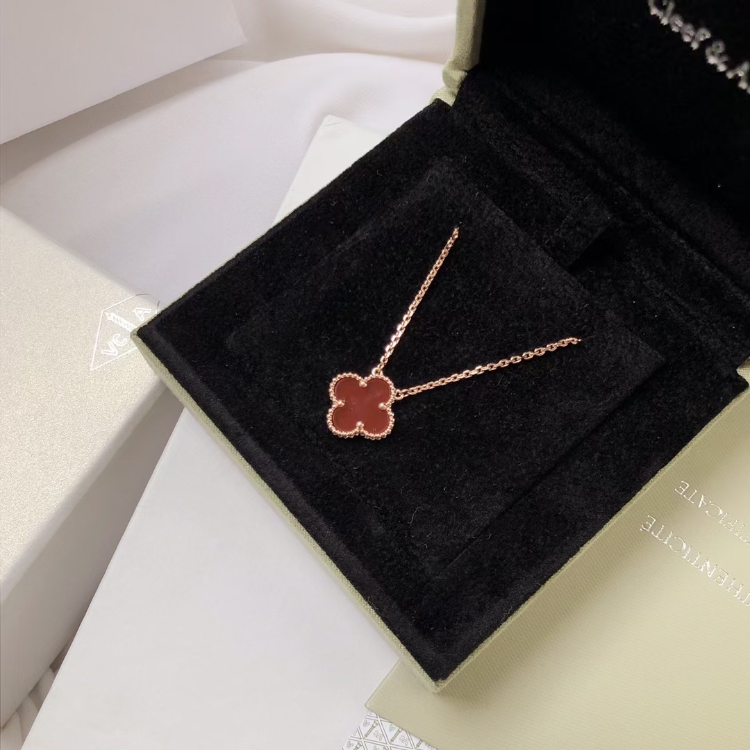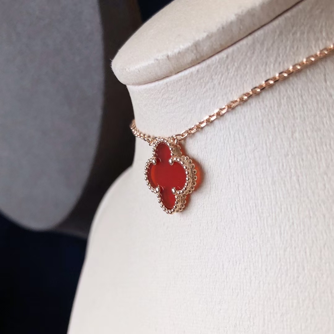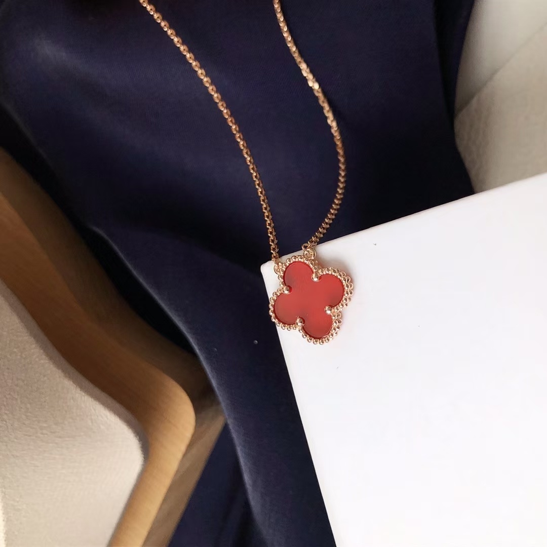 To ensure your Van Cleef Red Alhambra Necklace retains its beauty and luster, proper care is essential. Avoid exposing the necklace to harsh chemicals, such as chlorine or cleaning agents, as these can damage the delicate materials. When not wearing the necklace, store it in a soft pouch or jewelry box to protect it from scratches and dust. Regularly clean the necklace with a soft, dry cloth to remove any dirt or oils. For more thorough cleaning, you can use a mild jewelry cleaner specifically designed for rose gold and gemstones. Be gentle when cleaning the carnelian stone to avoid scratching its surface. With proper care, your Van Cleef Red Alhambra Necklace will continue to shine for years to come.