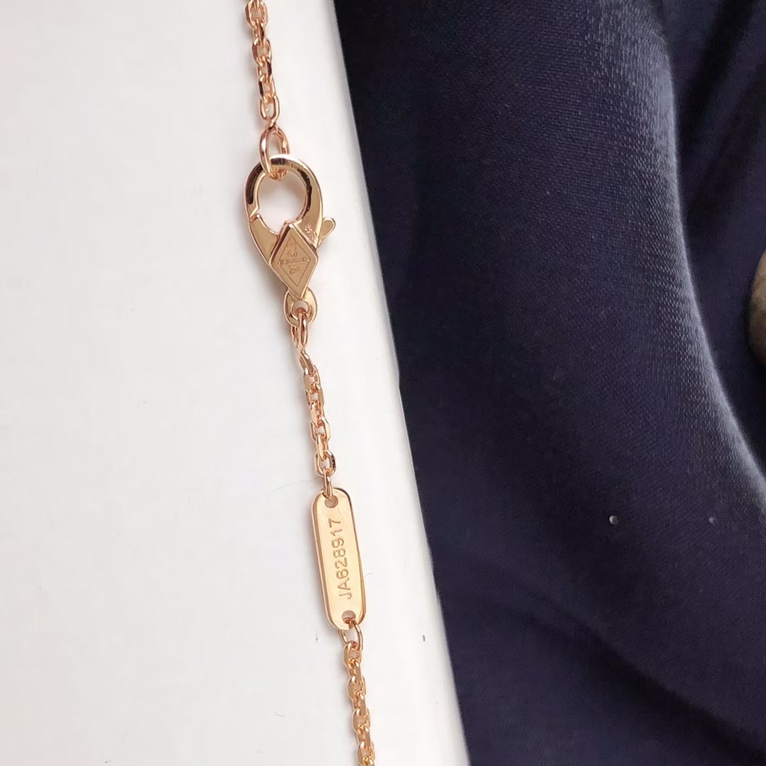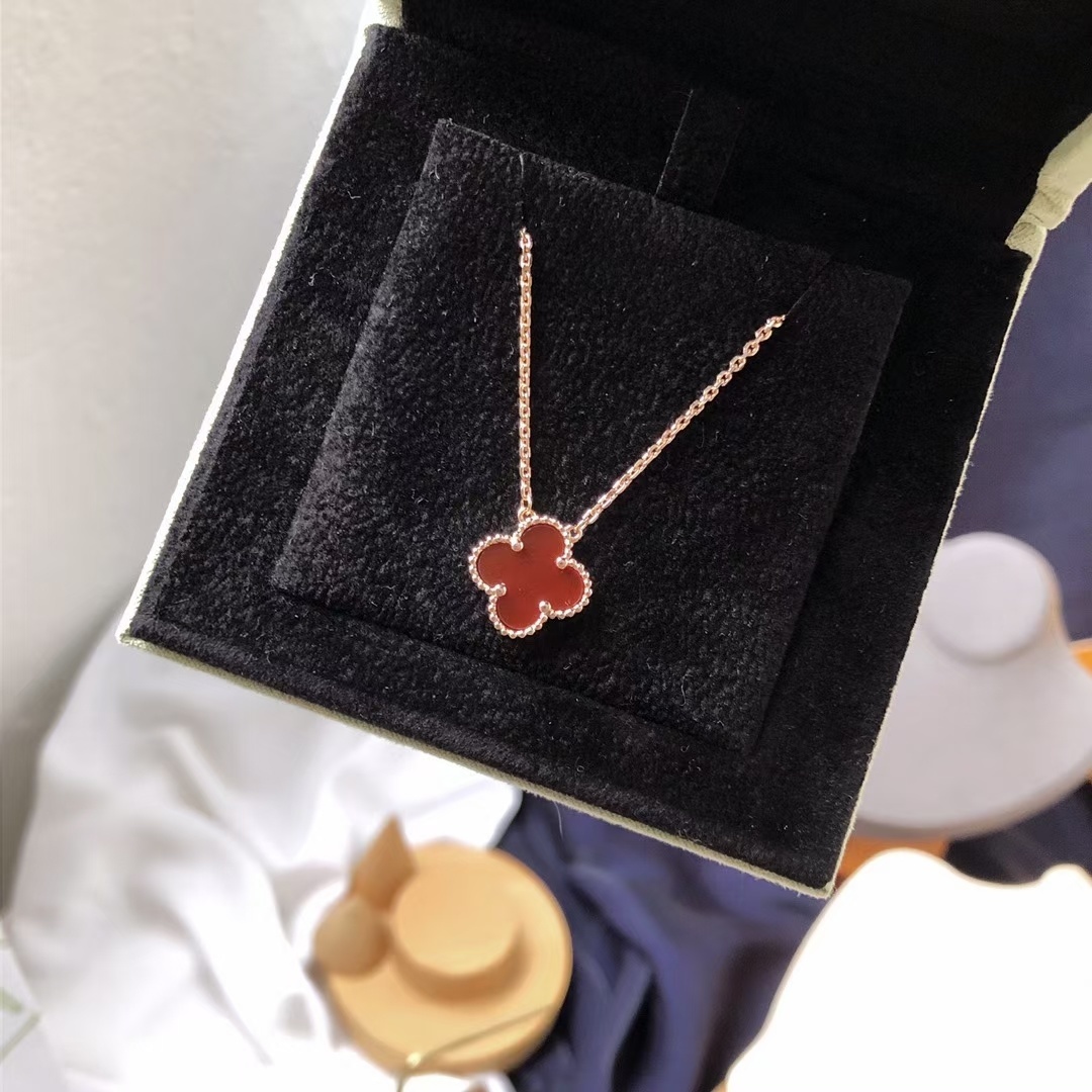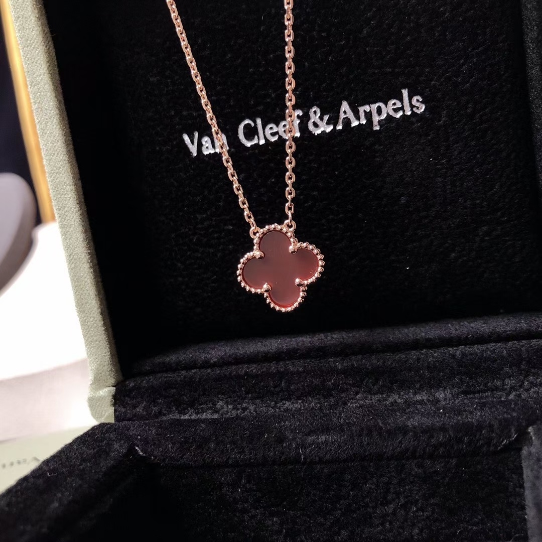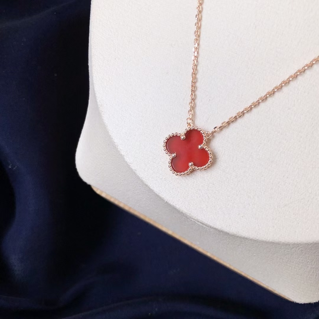 To ensure your Van Cleef Red Alhambra Necklace retains its beauty and luster, proper care is essential. Avoid exposing the necklace to harsh chemicals, such as chlorine or cleaning agents, as these can damage the delicate materials. When not wearing the necklace, store it in a soft pouch or jewelry box to protect it from scratches and dust. Regularly clean the necklace with a soft, dry cloth to remove any dirt or oils. For more thorough cleaning, you can use a mild jewelry cleaner specifically designed for rose gold and gemstones. Be gentle when cleaning the carnelian stone to avoid scratching its surface. With proper care, your Van Cleef Red Alhambra Necklace will continue to shine for years to come.